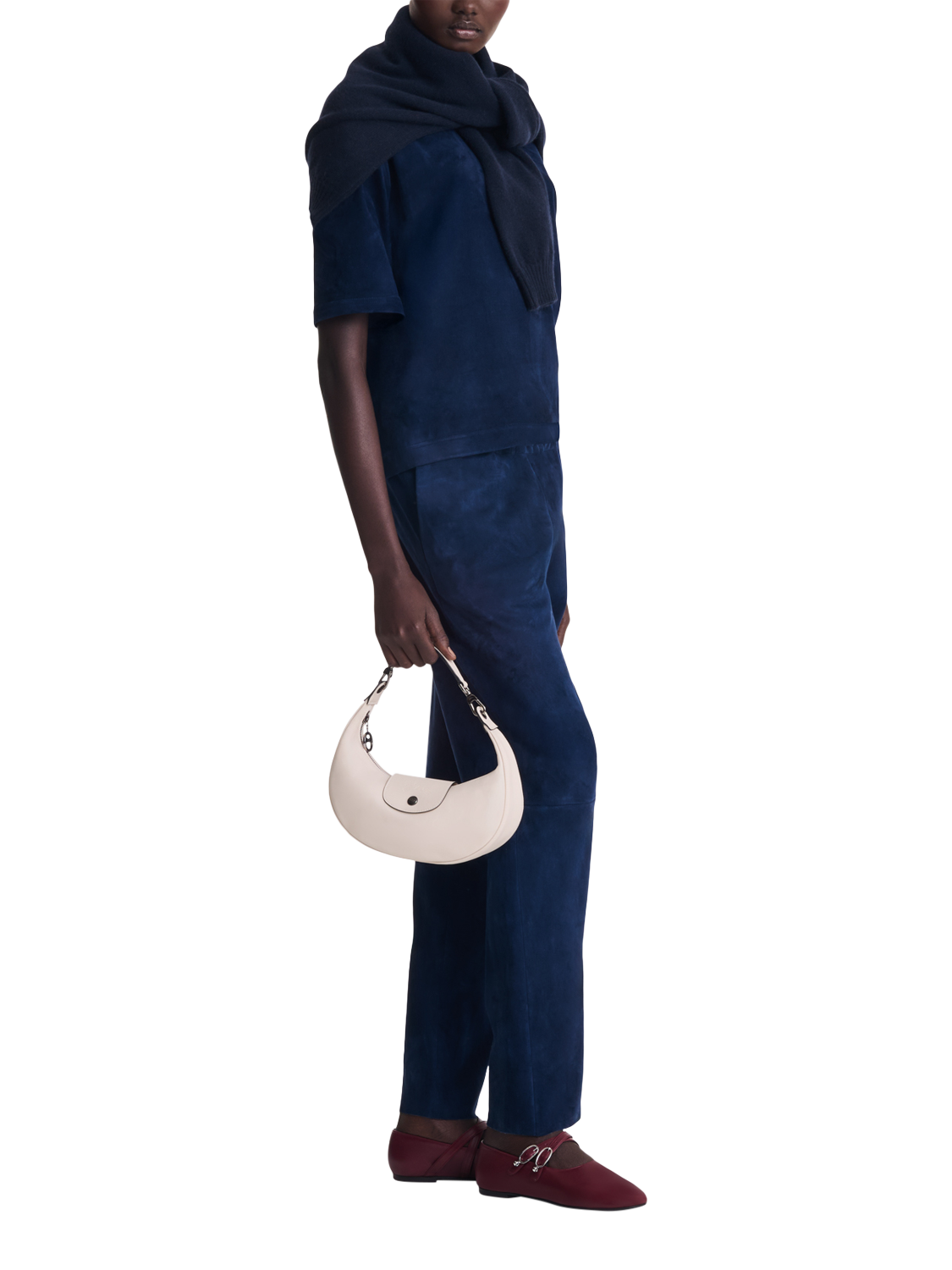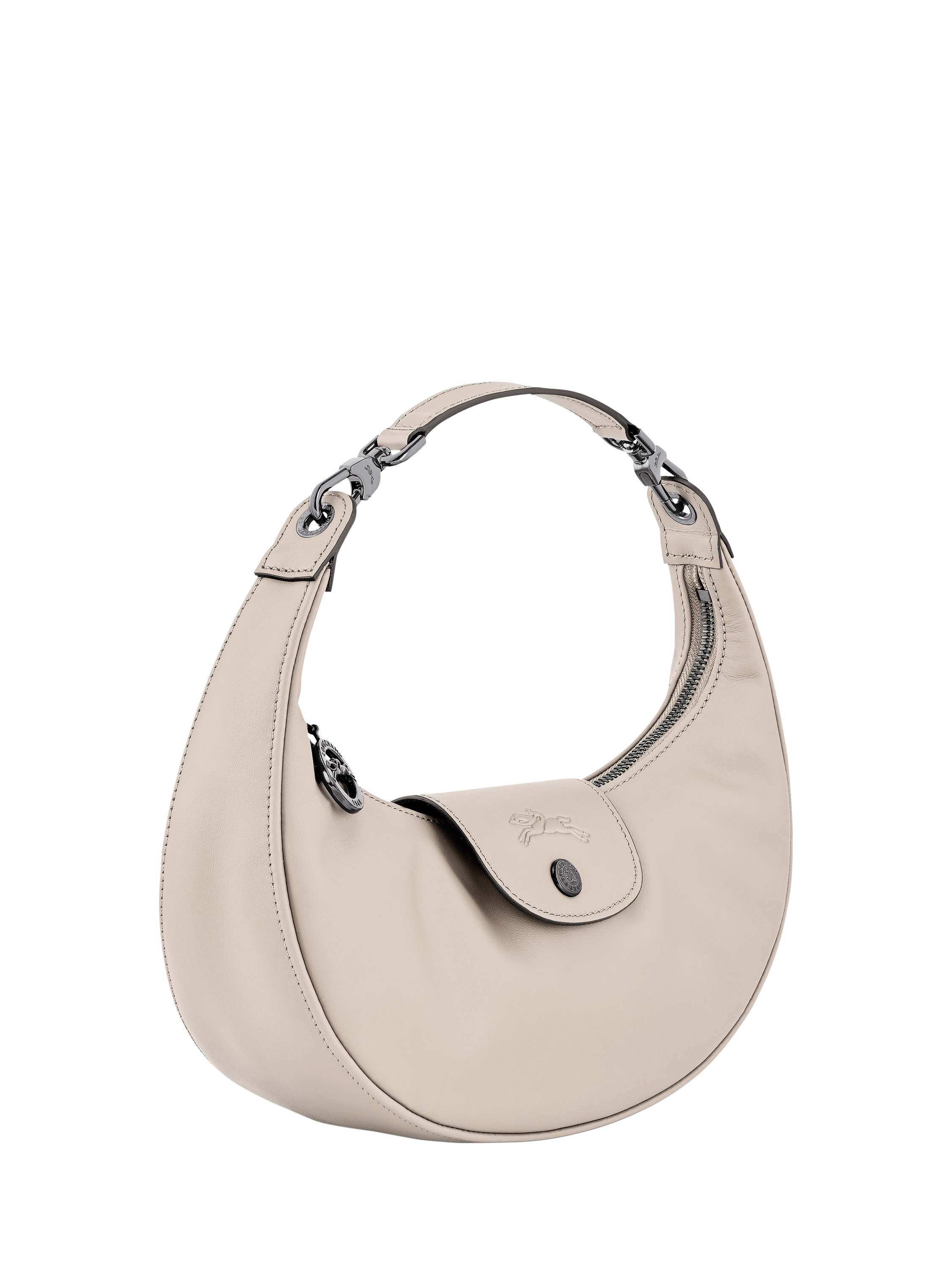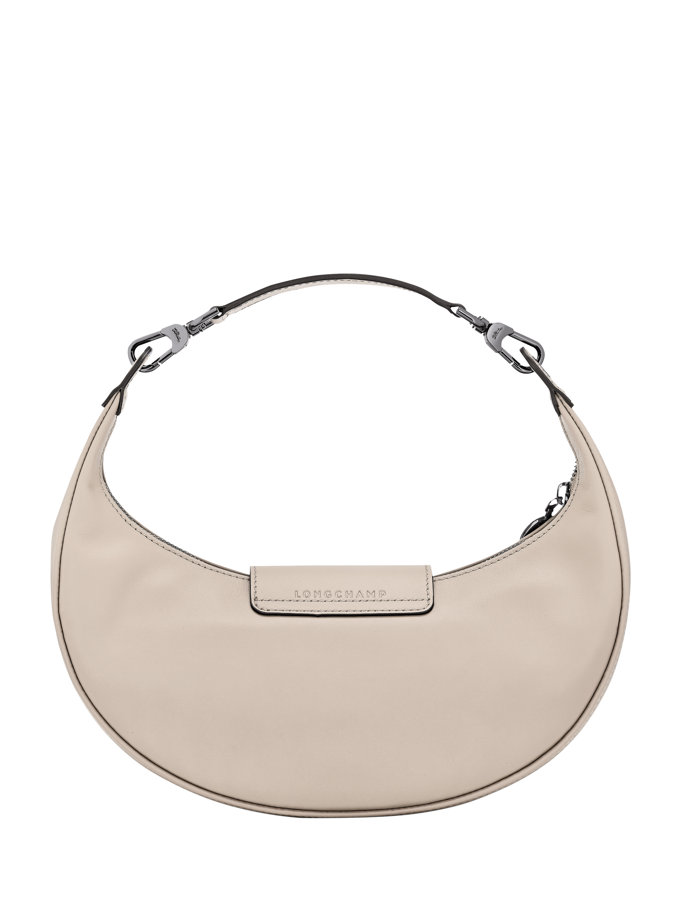 This half-moon bag adapts to your needs with its removable handle, allowing you to add a long shoulder strap to wear it crossbody or over the shoulder. Its rounded shape gives it a soft yet dynamic look, while the interior comfortably accommodates all your daily essentials.
