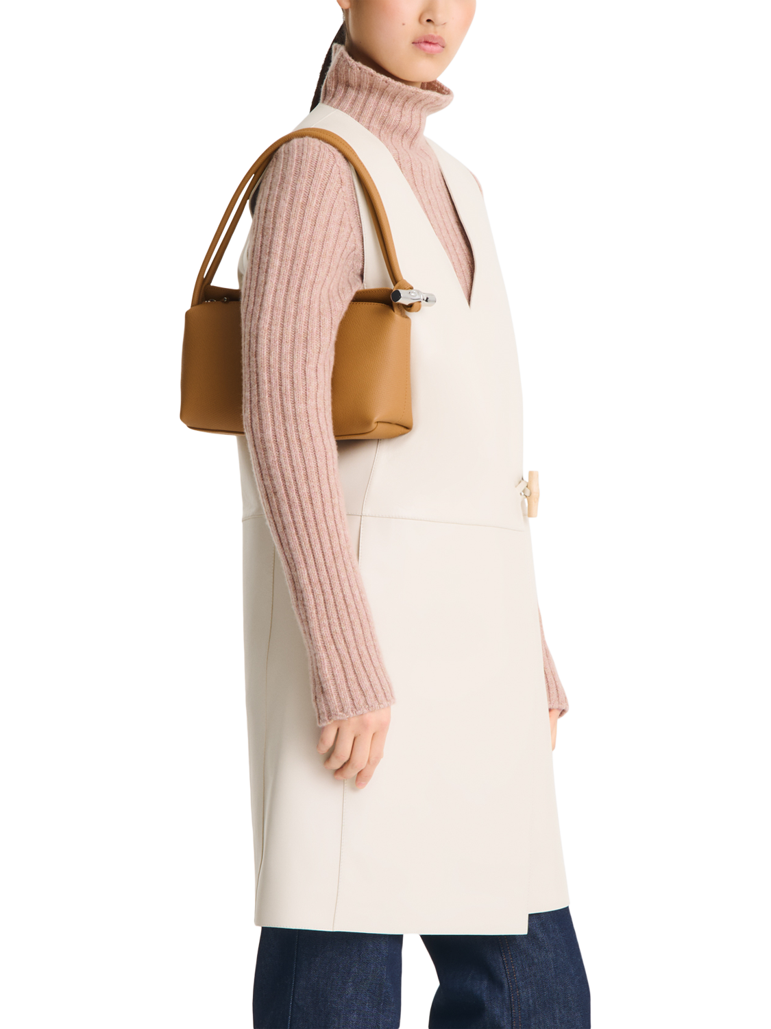 Longchamp's Le Roseau shoulder bag stands out primarily because of its refined shape. It can be carried elegantly on the shoulder or arm, making it ideal for a multitude of occasions.