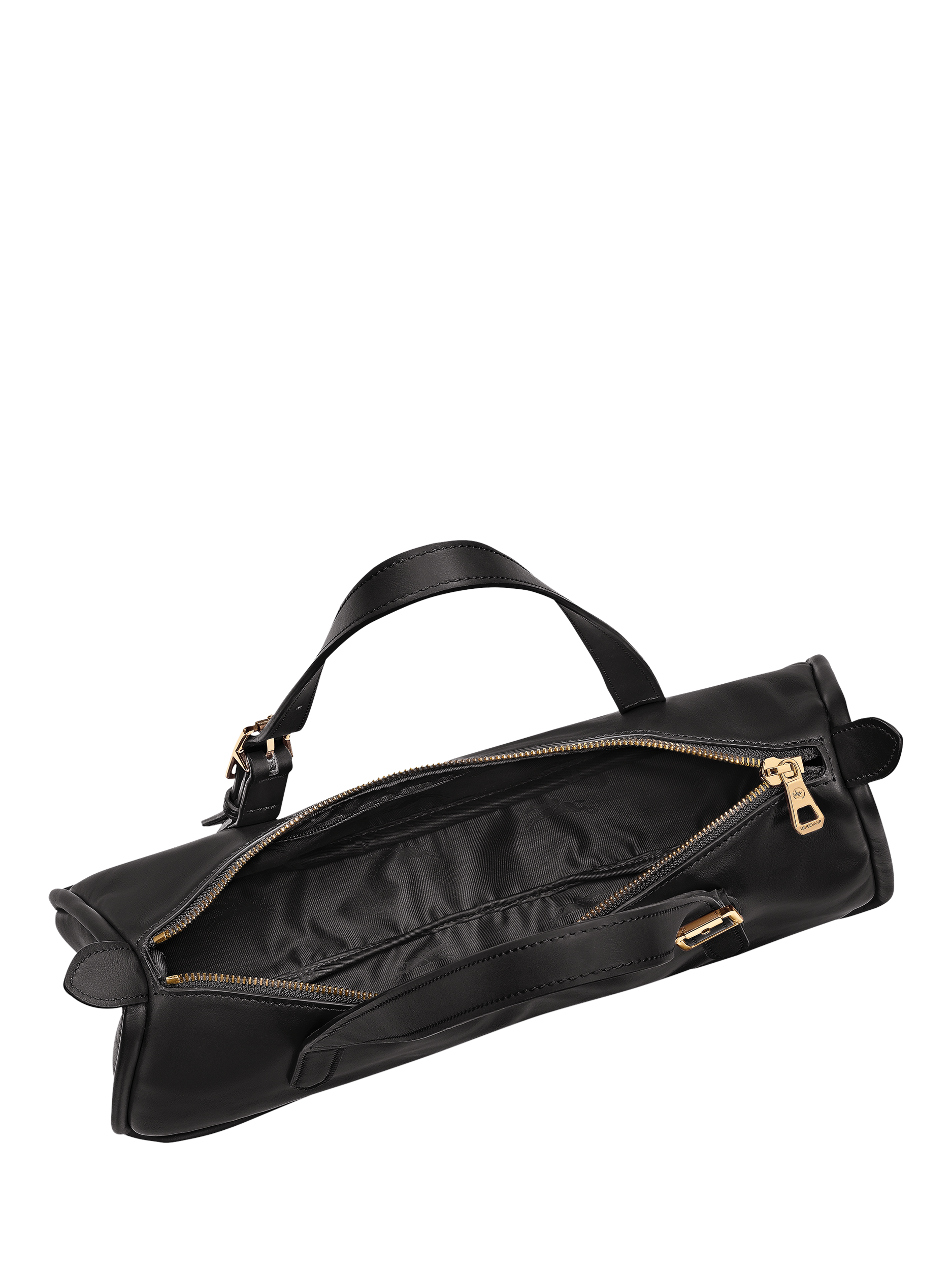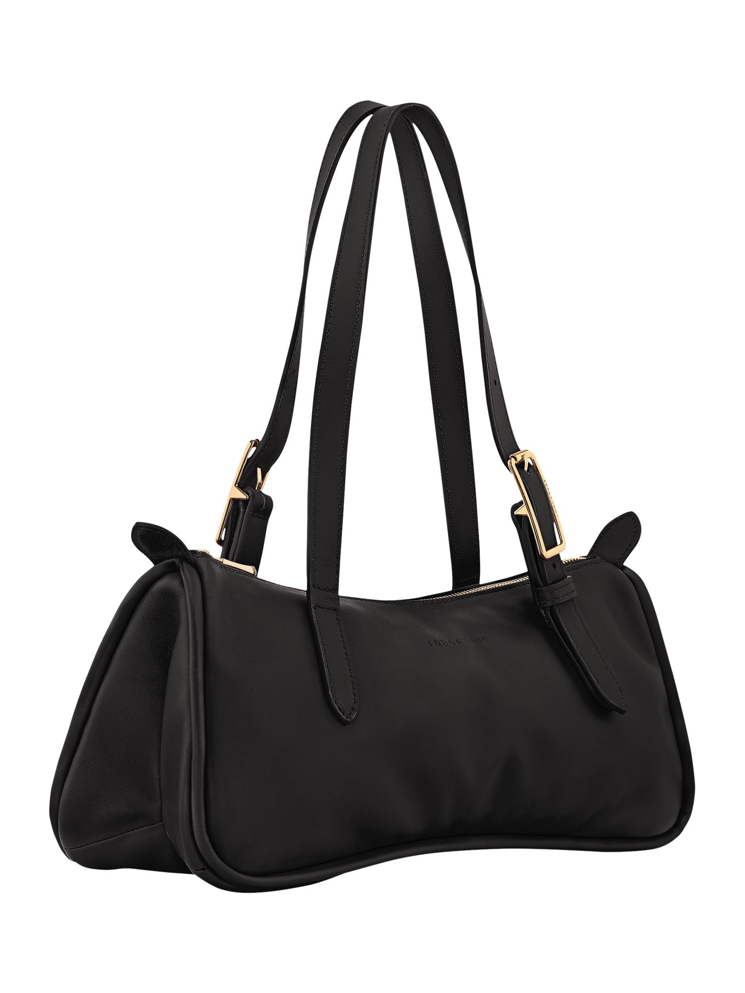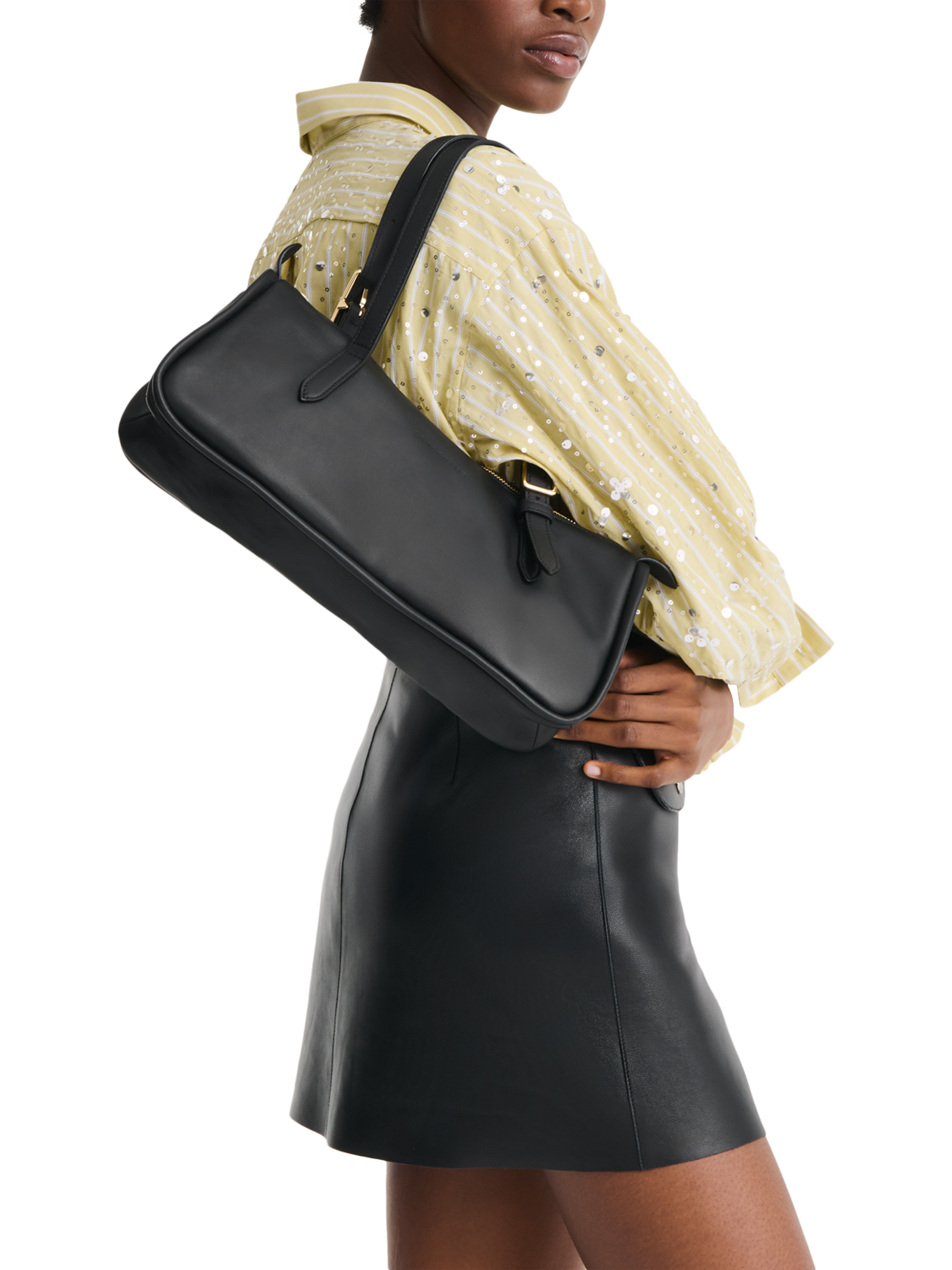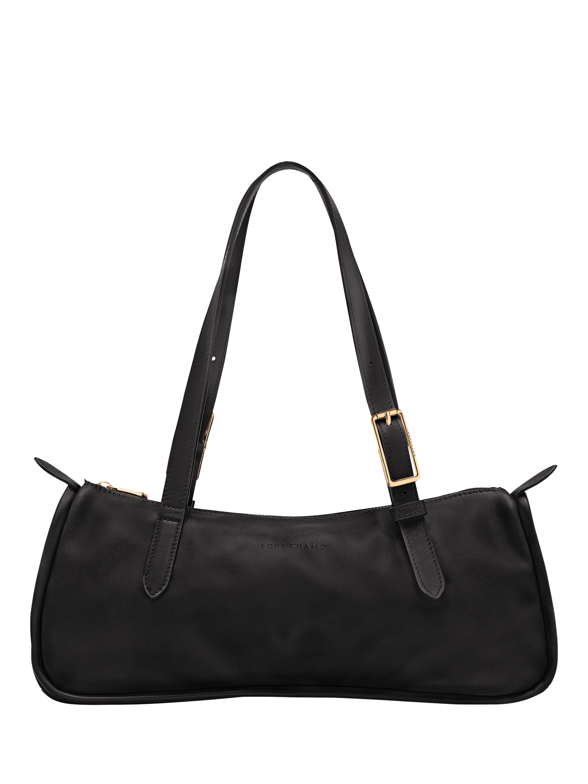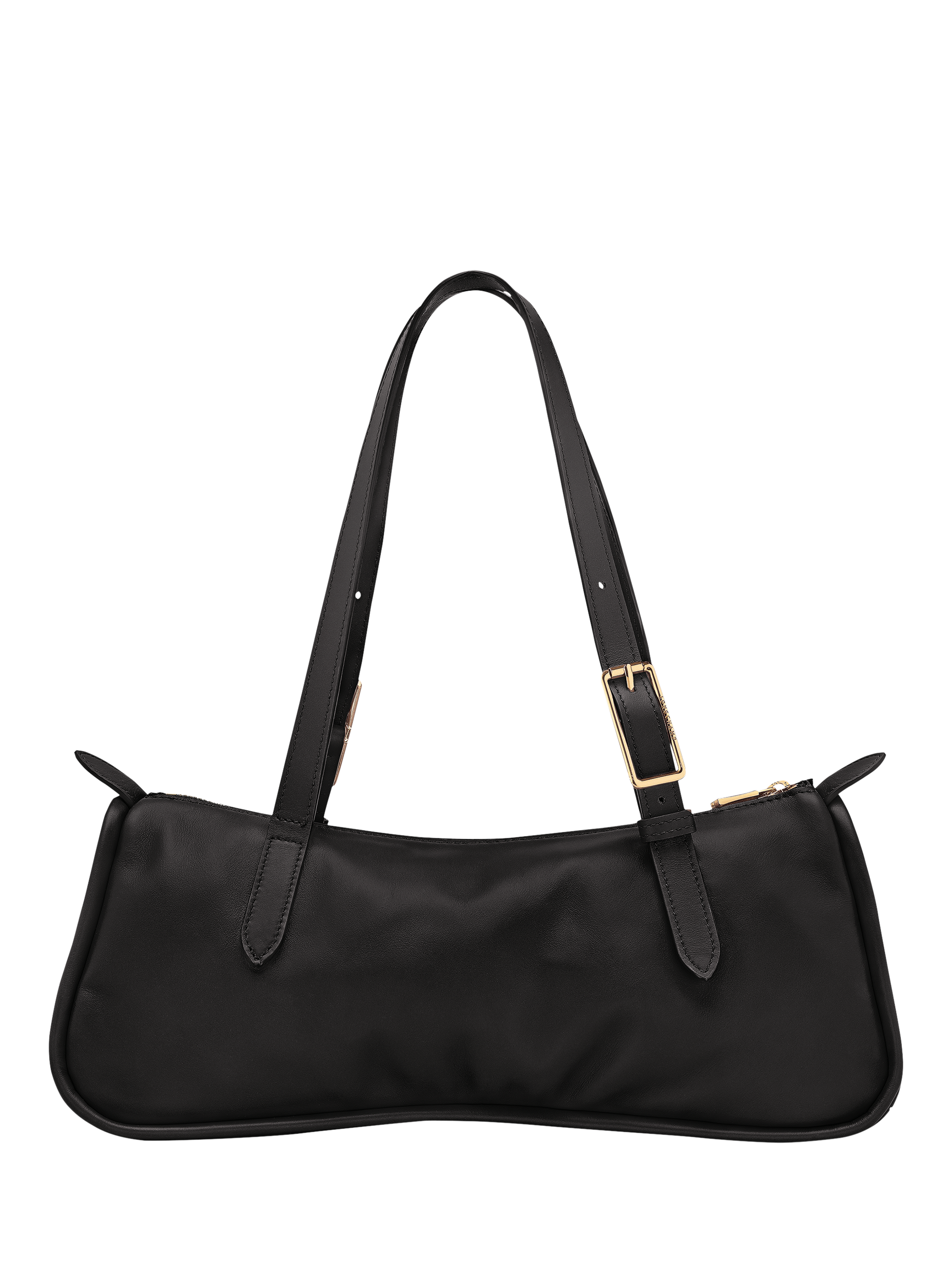 This shoulder bag redefines everyday elegance with its sleek silhouette, inspired by the graceful curve of a horseback saddle. Crafted from supple cowhide leather, it features softly pinched gussets, a subtly embossed logo, and side tabs that accentuate its elongated shape.