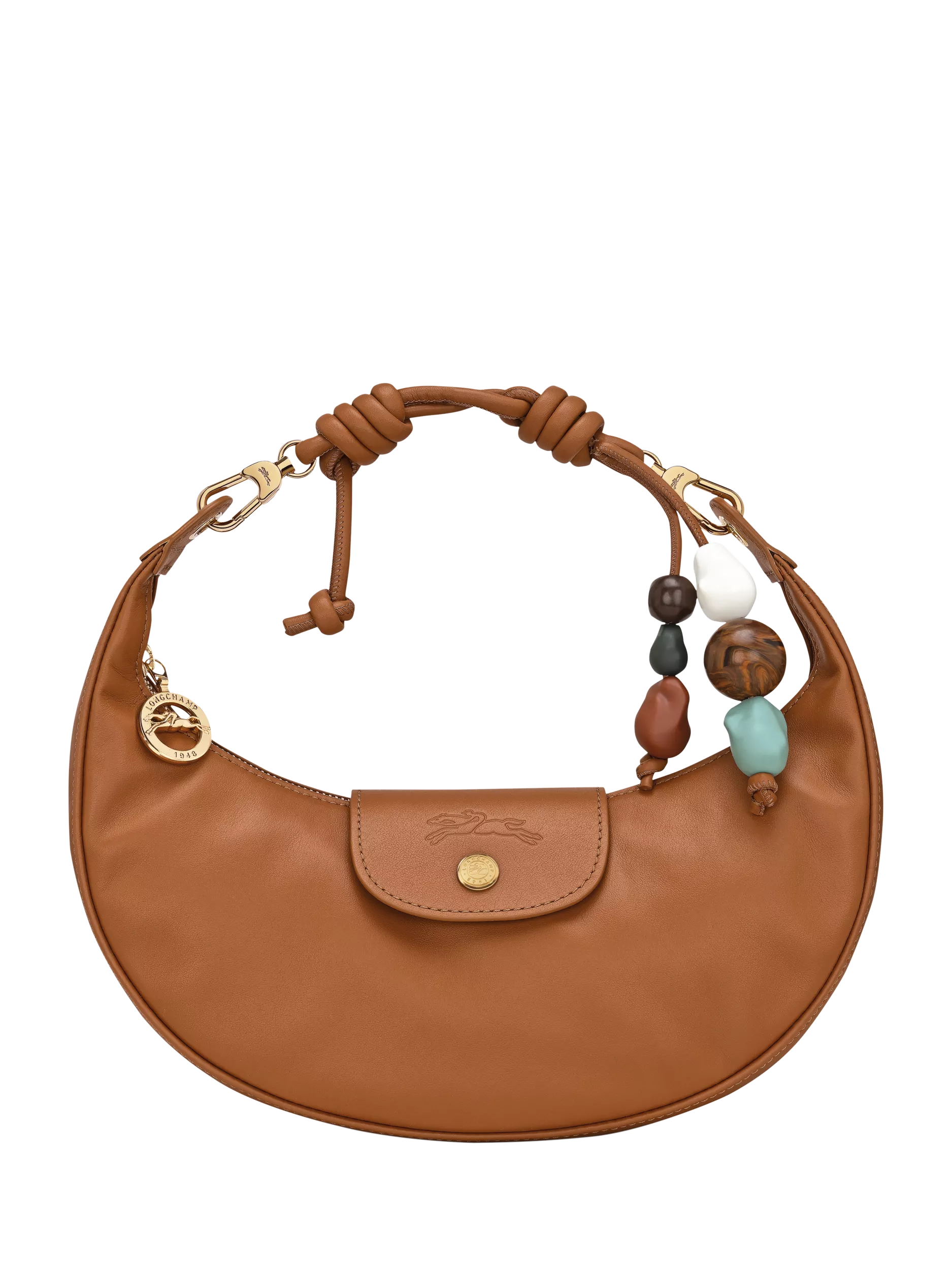 This half-moon bag from Longchamp is adorned with a beaded bag charm and an artistically knotted cord on the removable shoulder strap. The refined details that enhance this smooth, delicate cowhide leather give the bag a feminine, creative look.