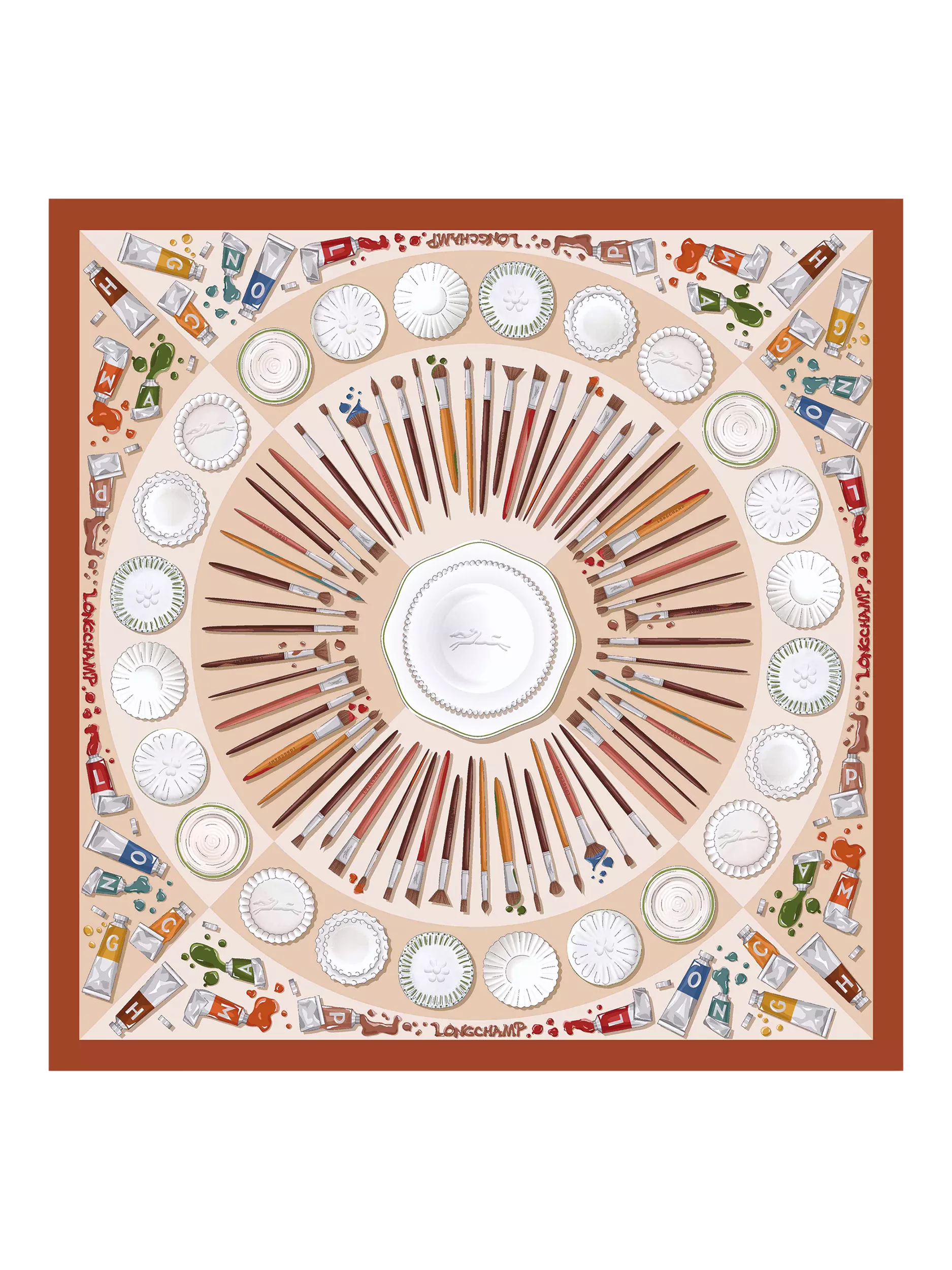 This silk scarf from Longchamp features an intricate design. In the midst of creation, the ceramist draws inspiration from the vibrant colours that fill their workshop, surrounded by an array of brushes. The porcelain plates with scalloped edges, emblematic of the French art of living, add to the scene’s beauty.