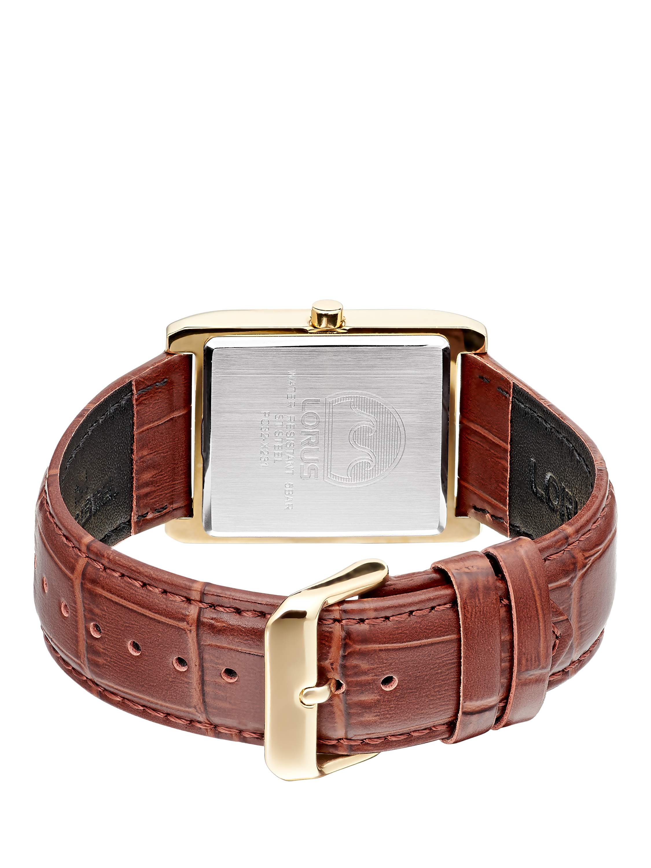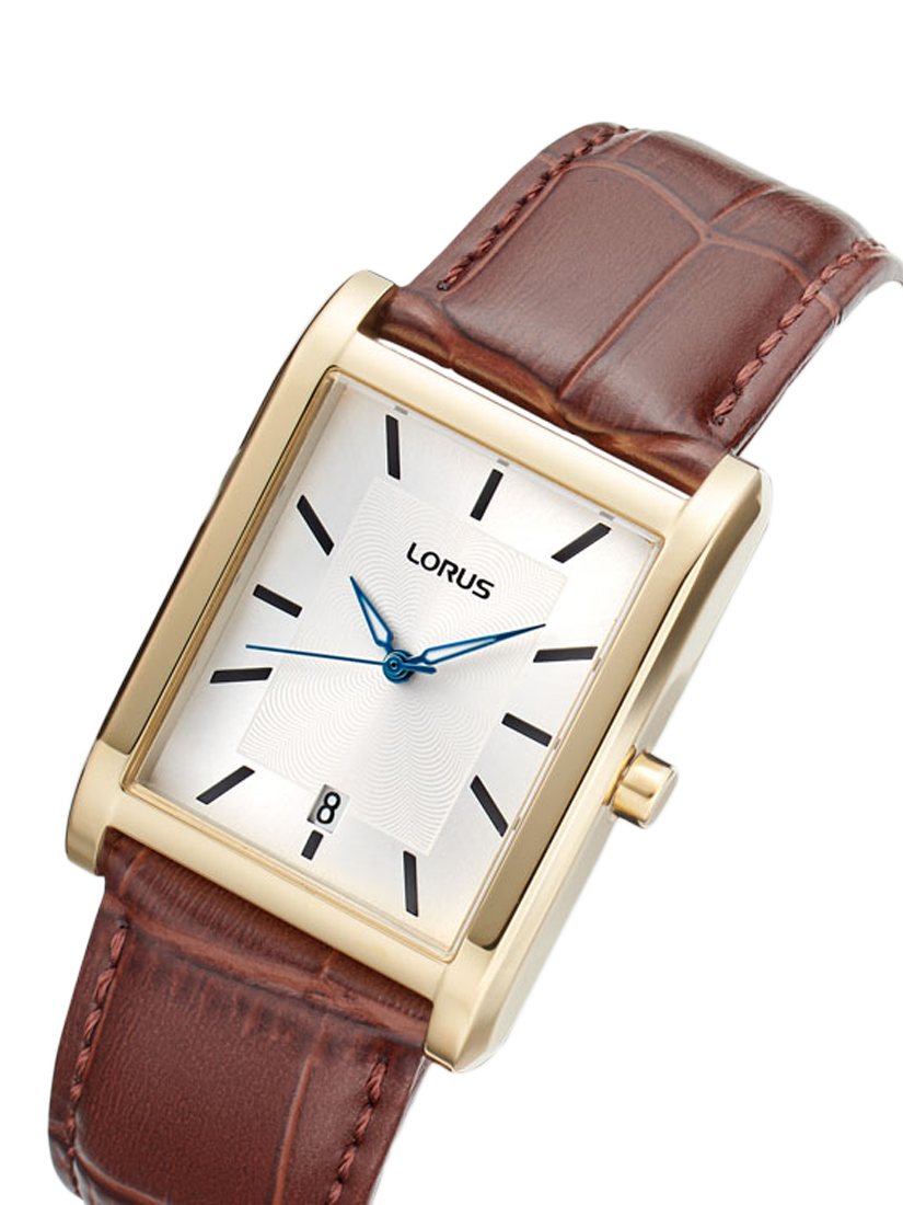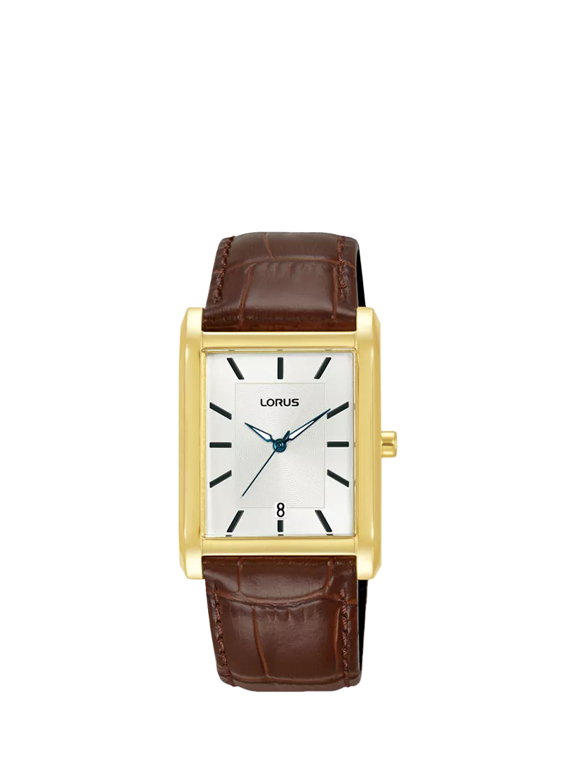 This refined watch combines timeless design with modern elegance. Showcasing a classic rectangular case with a white pressed circular patterned inner dial, beautifully finished with a sunray effect. The leather strap seamlessly blends style with functionality.