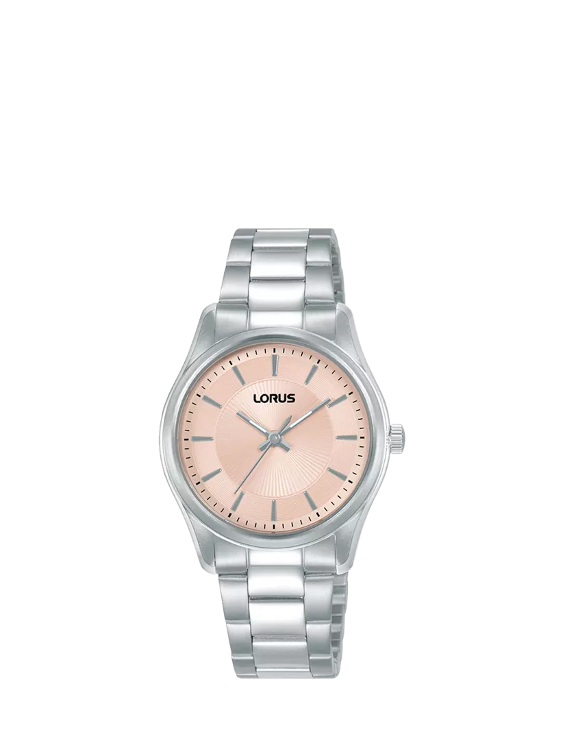 An elegant watch from the from the Lorus Women's Signature collection designed with modern classic style. This model showcases a textured sunray pink dial, adorned with semi-luminous hands, merging functionality with timelessness. Its stainless-steel bracelet sits comfortably on the wrist.