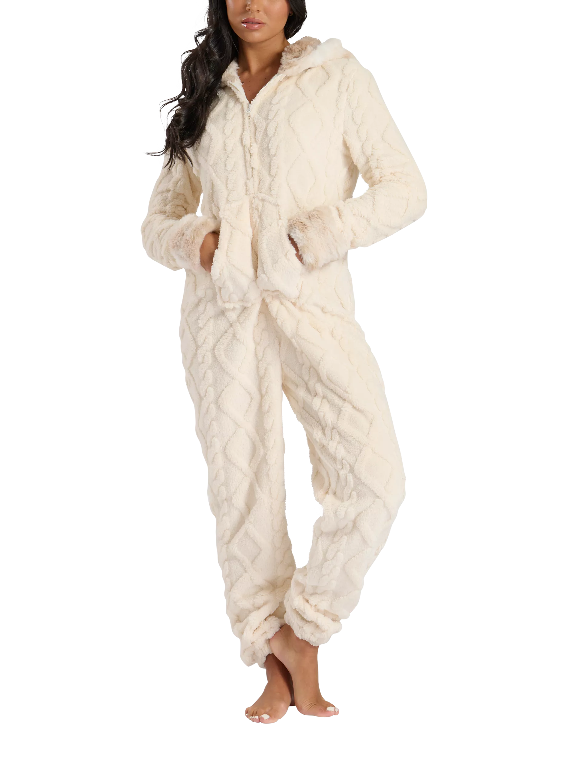 Make bedtime more fun with Loungeable! This super cute fleece all-in-one will keep you cosy all season long. Featuring a cable cut sherpa fabric, double pocket, with a contrast faux fur trim and hood.