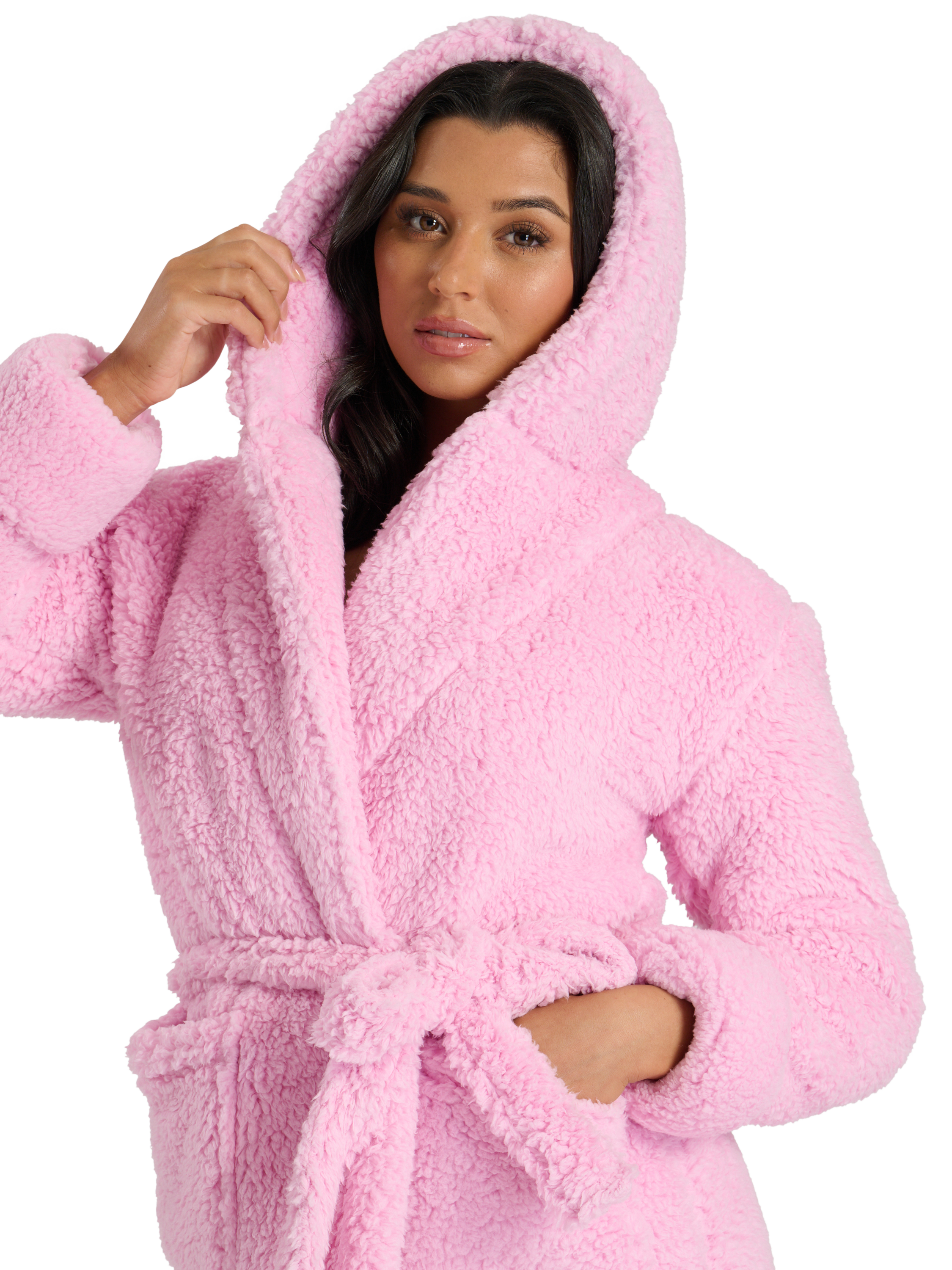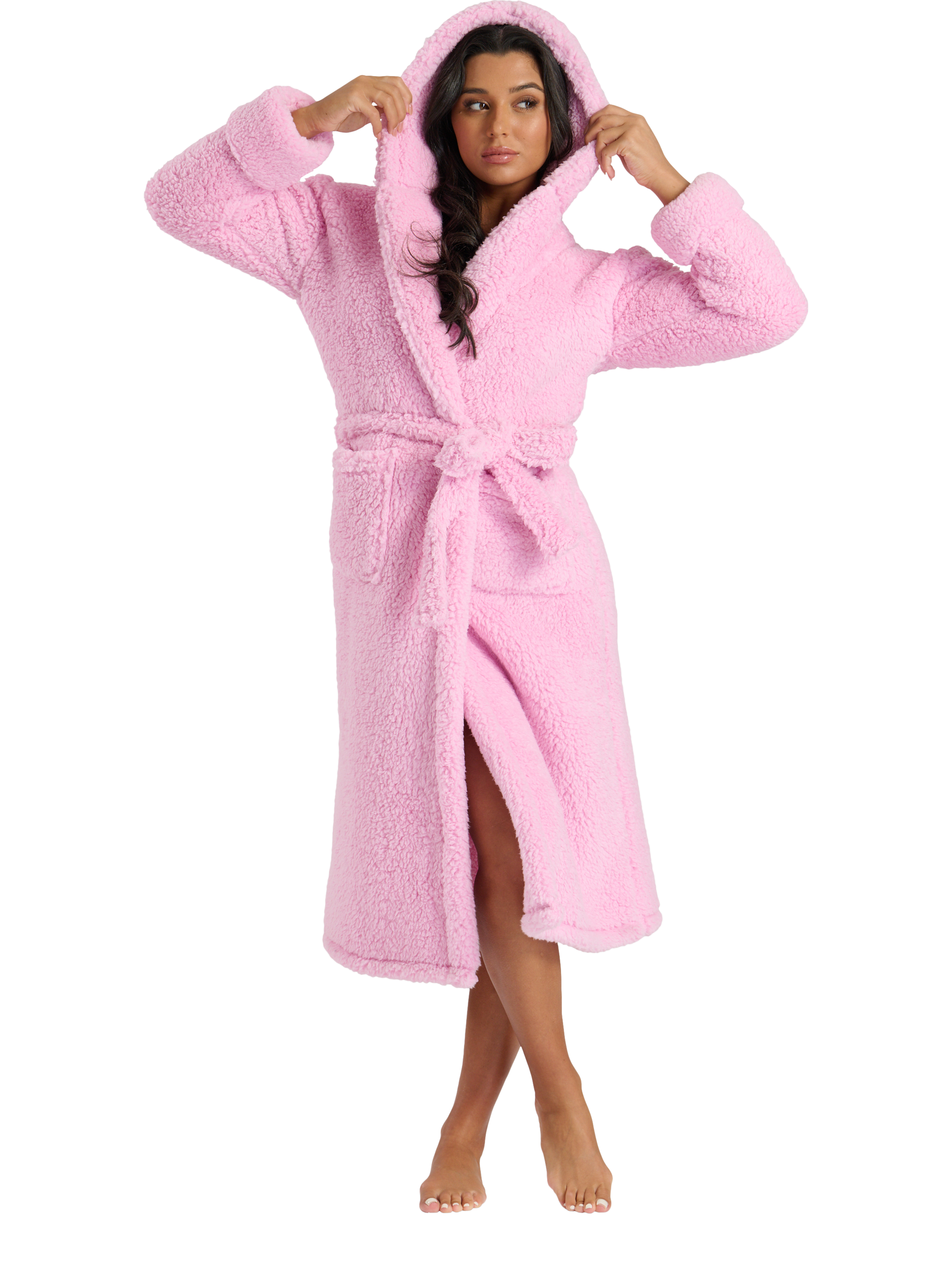 This super cute fleece robe will keep you cosy all season long. Featuring a luxurious hood, complete with a self-tie fabric belt for the perfect fit. The fluffy lining provides ultimate comfort. The gown features two side pockets.