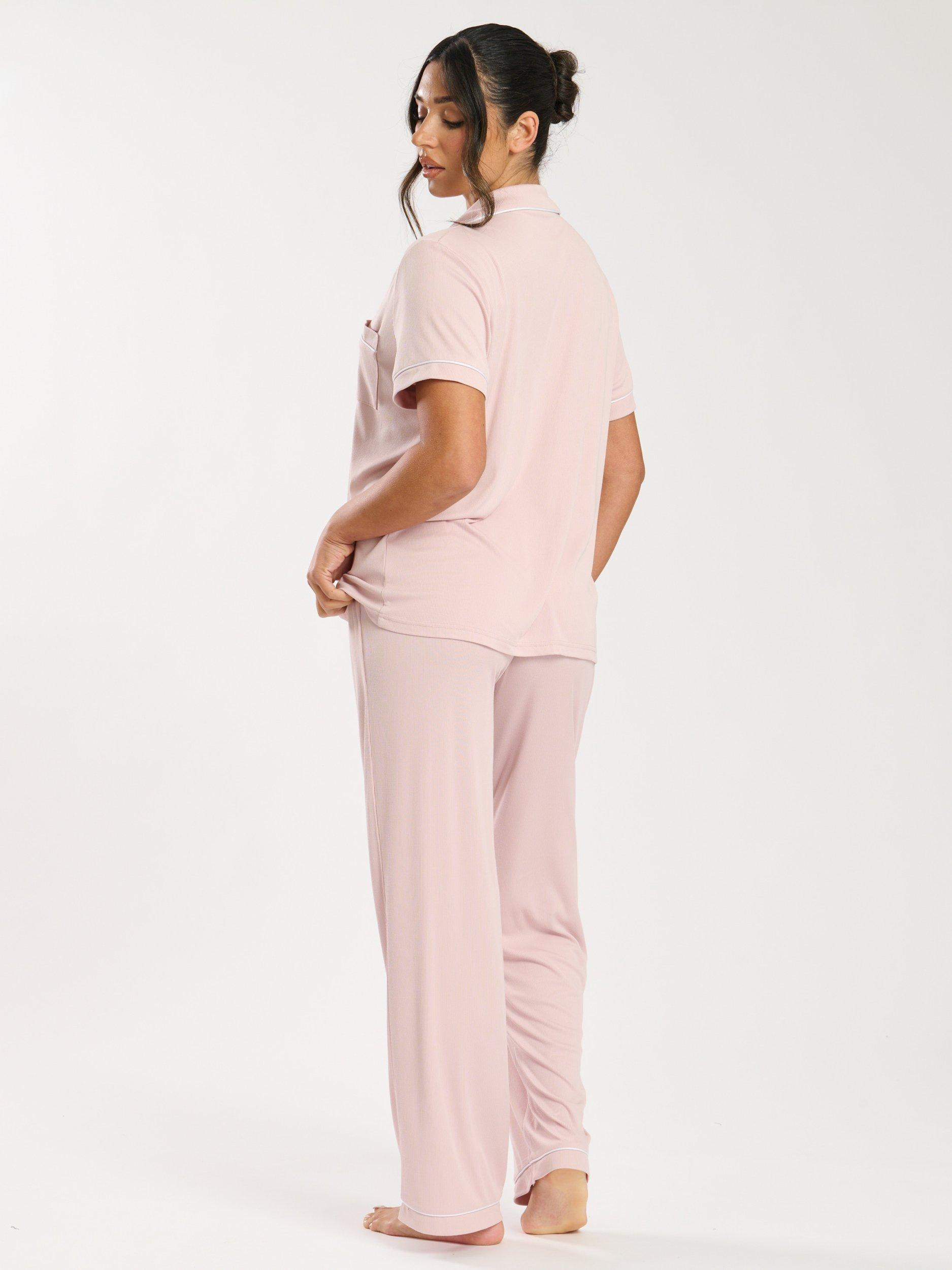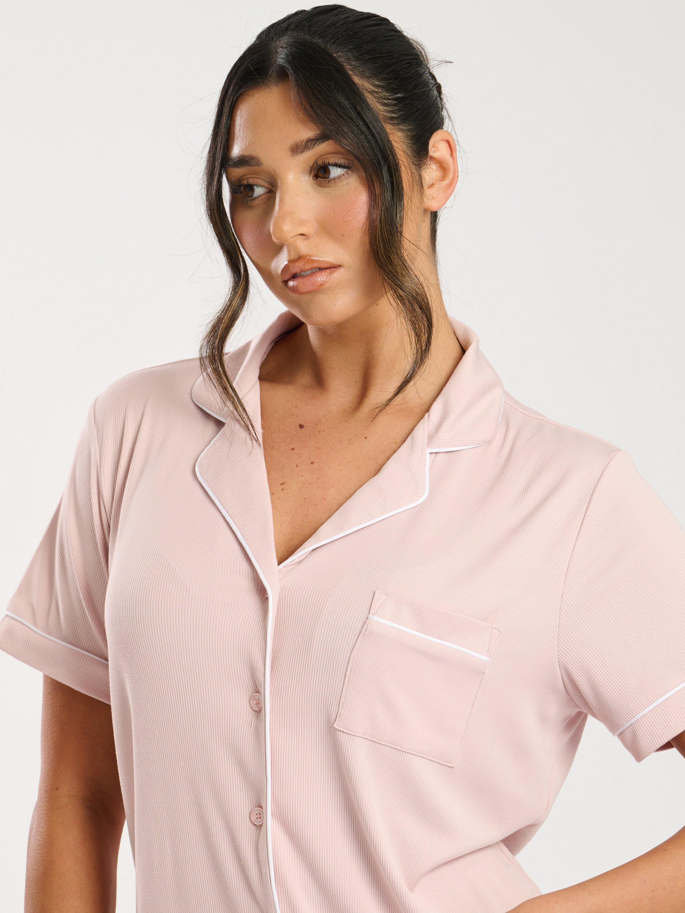 LoungeableContrast Piping Button Down Long Pyjama Set, Pink