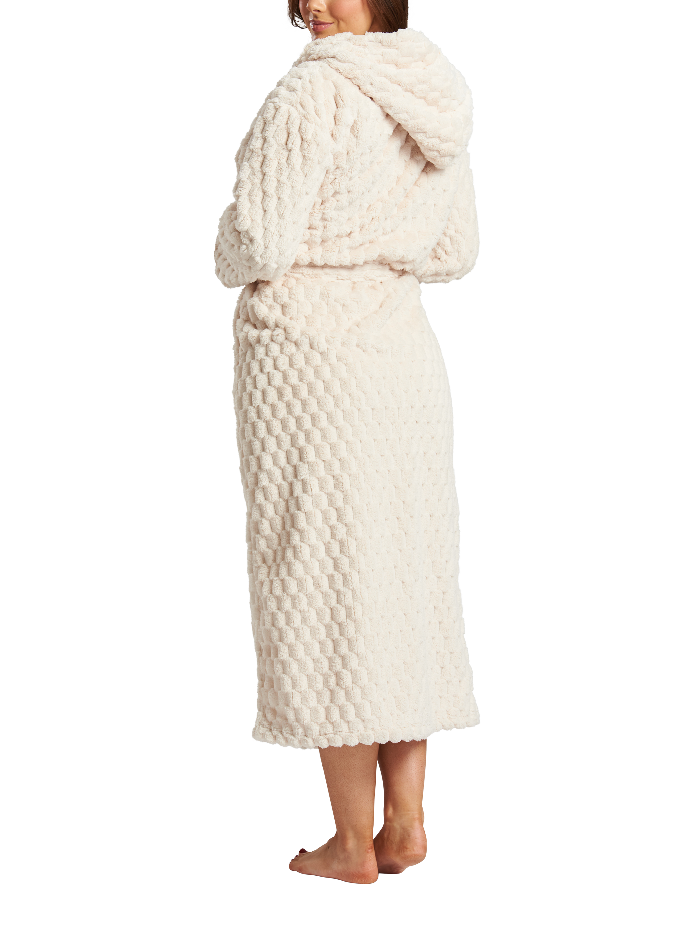 This super cute fleece robe will keep you cosy all season long. Featuring a luxurious geometric fabric, complete with a self-tie fabric belt for the perfect fit. The contrast faux fur cuffs and collar provide ultimate comfort. The gown is hooded with faux fur.