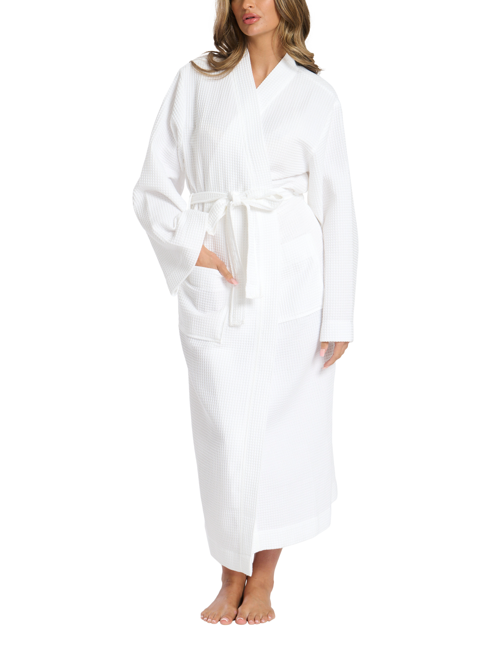 Made from soft, breathable waffle fabric, this robe features a long, flowing design that provides full coverage and ultimate comfort. The kimono-inspired sleeves add a touch of elegance, while the belt ensures a customisable fit. Perfect for lounging at home or wrapping up after a bath, this maxi-length robe combines functionality with a chic, sophisticated look, making it a must-have for your loungewear collection.