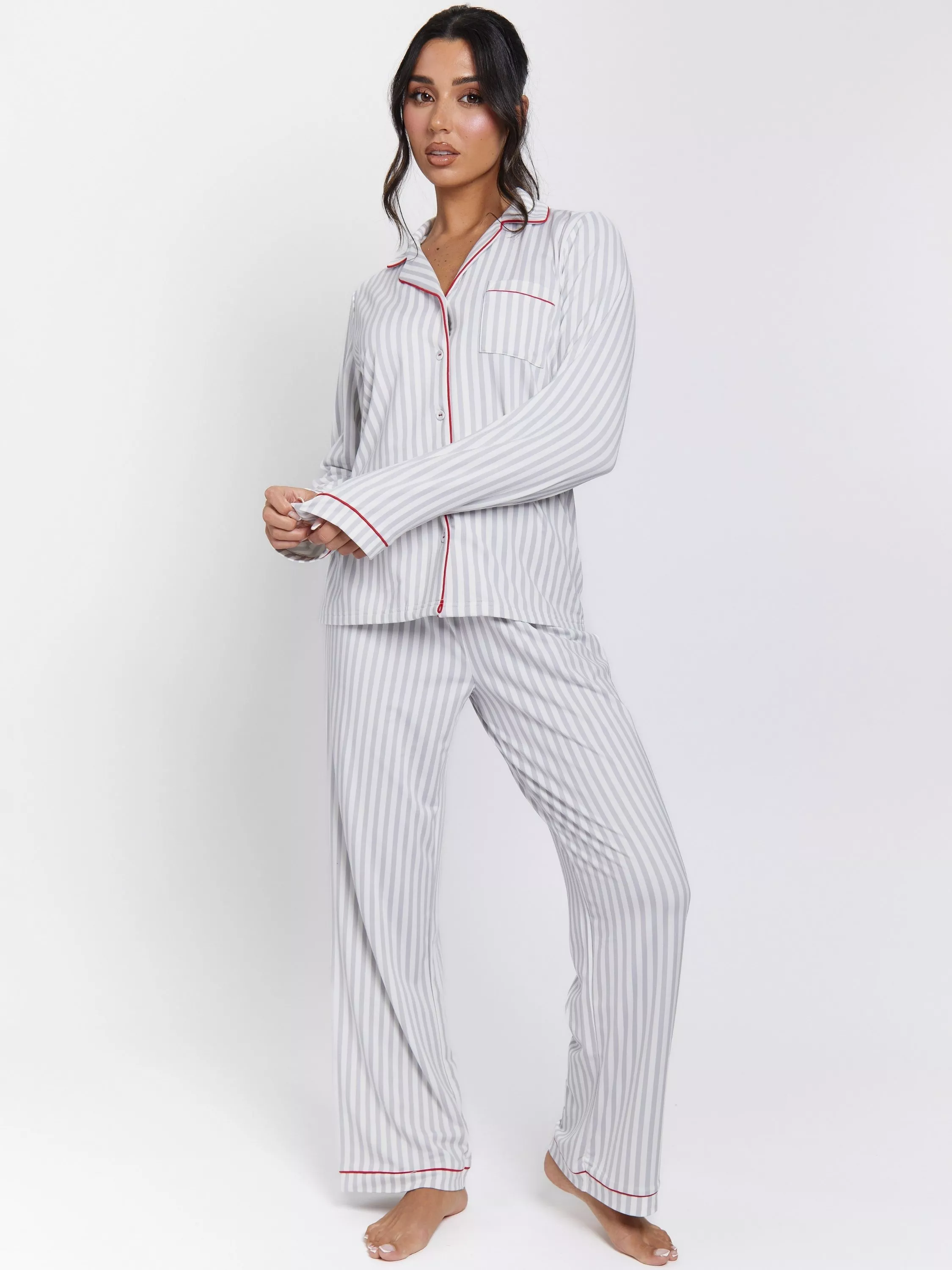 LoungeableStripe Contrast Trim Long Pyjama Set, Grey