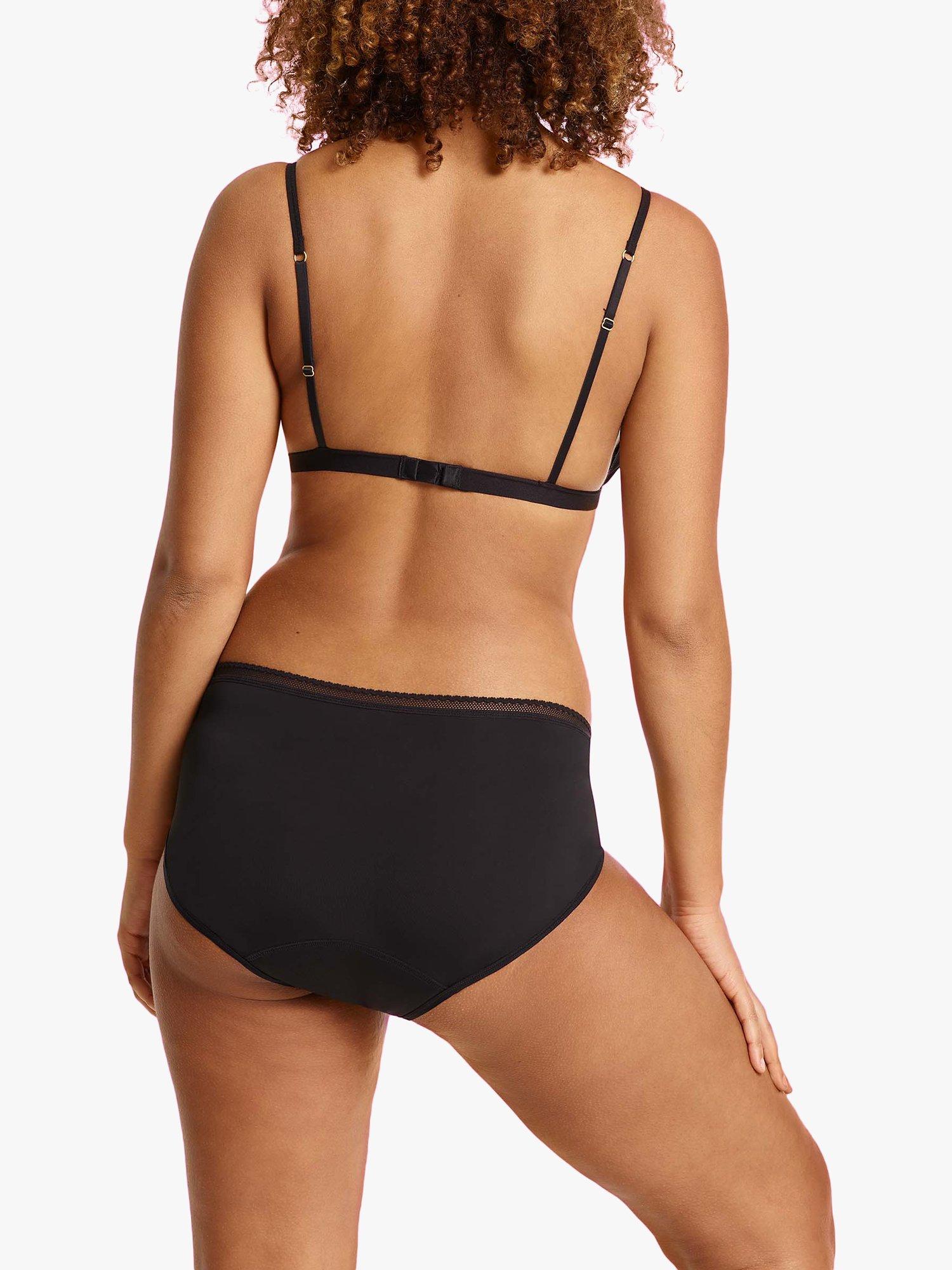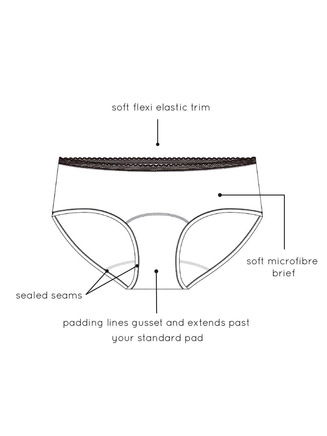 These microfibre midi briefs have a pretty lace trim around the waistband. They also have a flexible elastic trim for comfort, sealed seams for zero leaks and a padded gusset which extends past your standard pad giving you more coverage. The gusset has a soft lining with an antibacterial and anti-odour layer which lasts for over 50 washes, as well as a waterproof layer.