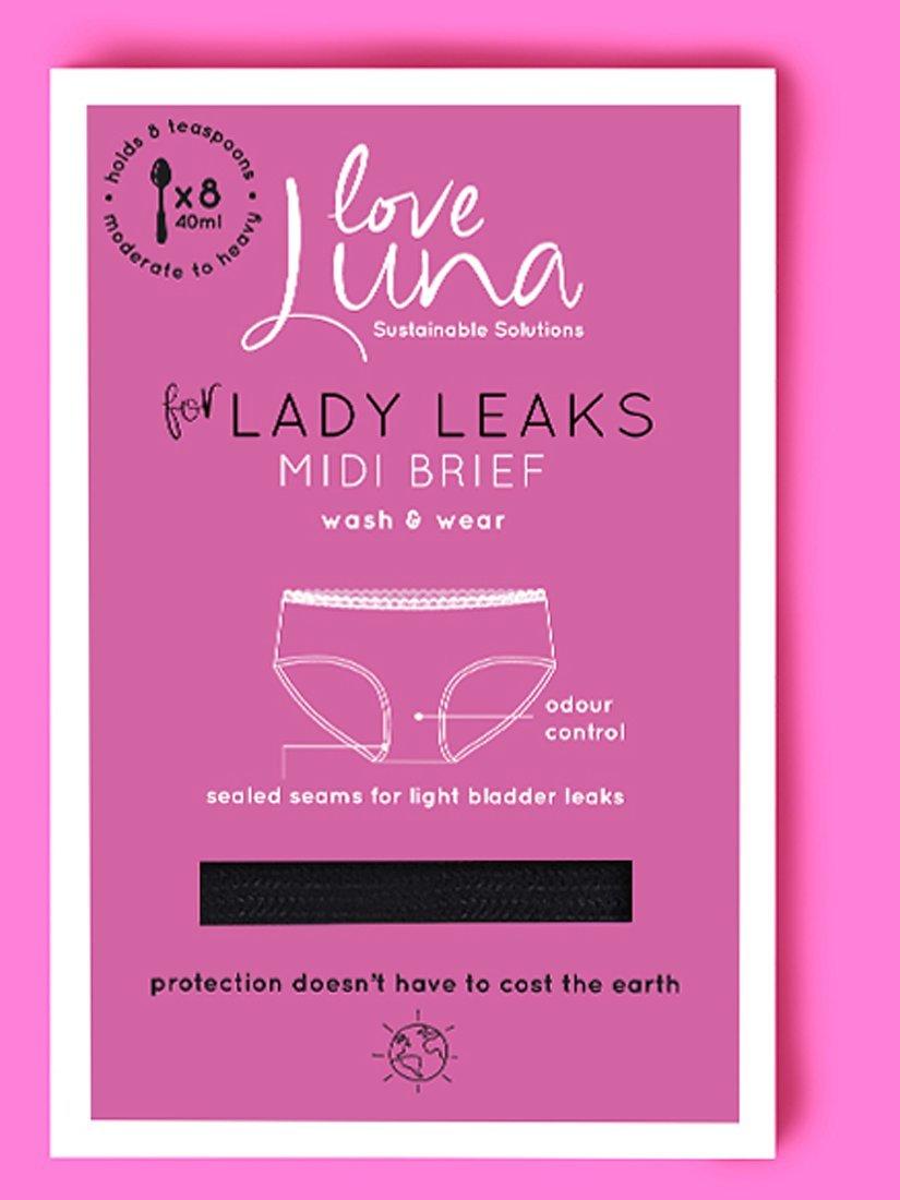 The Lady Leaks knickers from Love Luna are suitable for light bladder leaks or wear during your period. So whether you suffer from leaks when you cough, laugh and sneeze, or you're looking for a more sustainable option to sanitary wear, Lady Leaks are good option.