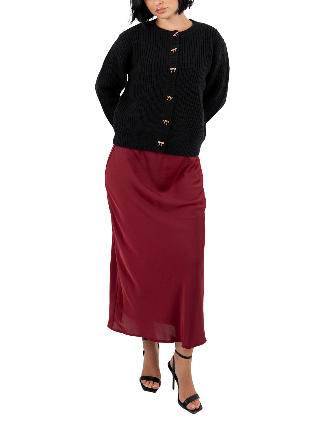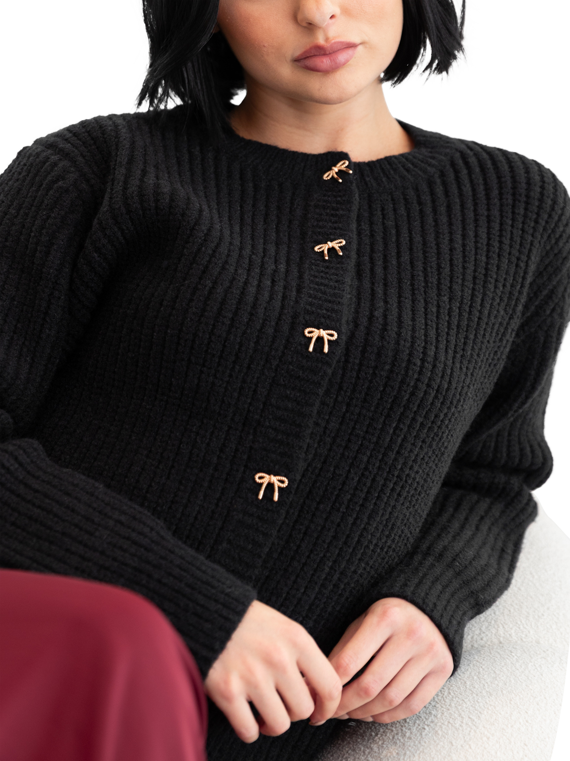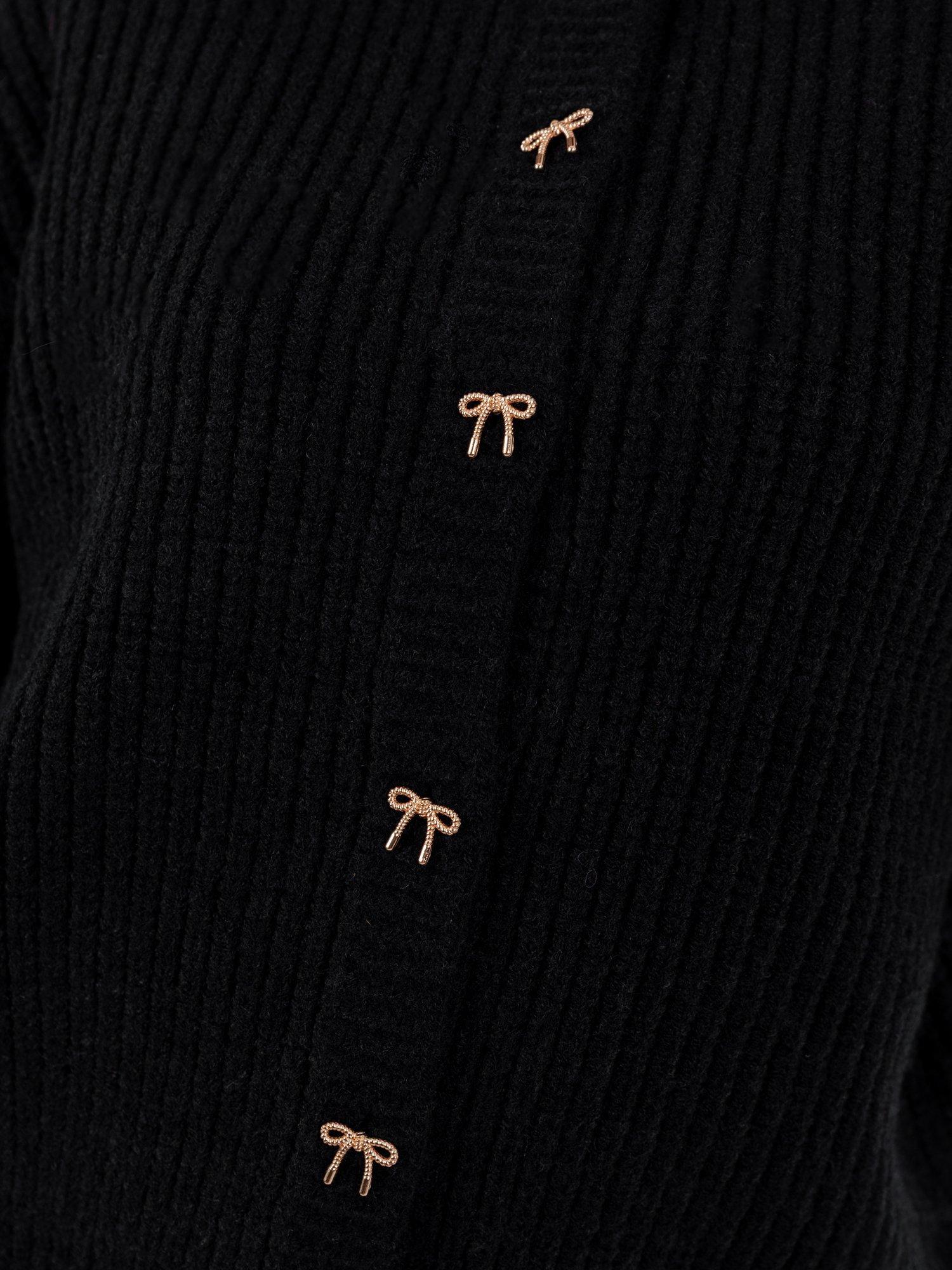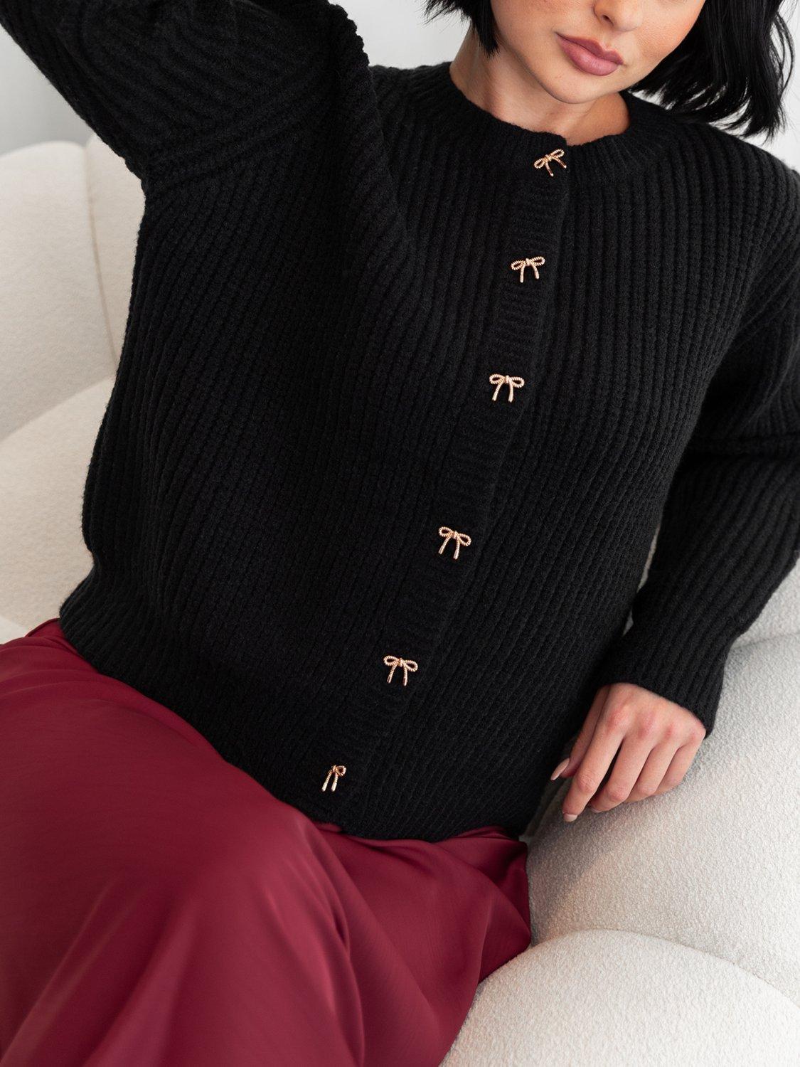 Defined by timeless elegance, this chunky knit cardigan features a classic round neckline and delicate bow buttons for a feminine finish. Luxuriously soft and stylish, pair it with a mini skirt and knee-high boots for a modern, polished look.