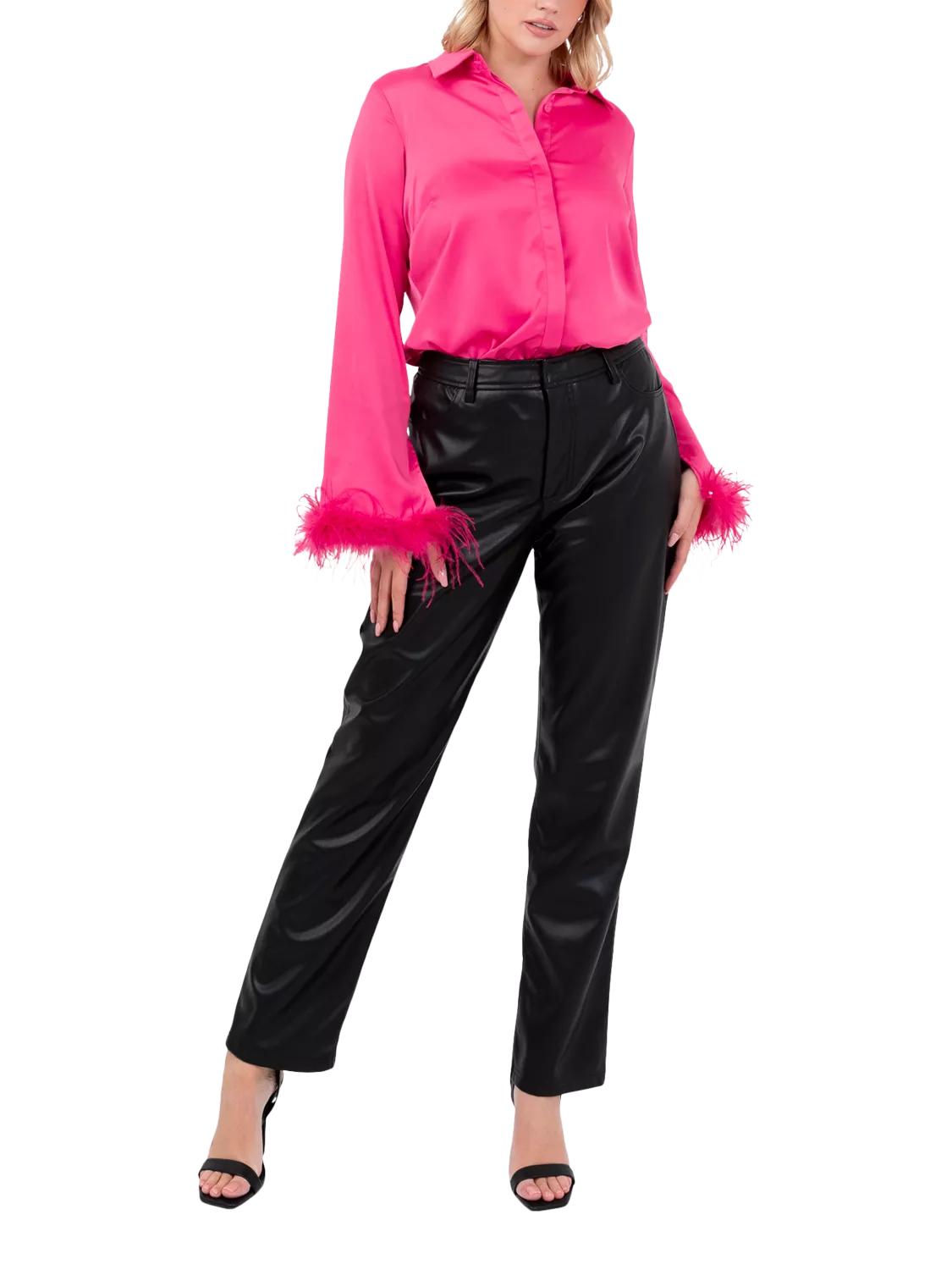 This satin blouse features a classic button-up design, sleek button overlay, and standout feather cuffs. Pair with trousers and heels for elegance or with a Sequin Wrap Midi Skirt for a shimmering evening look.