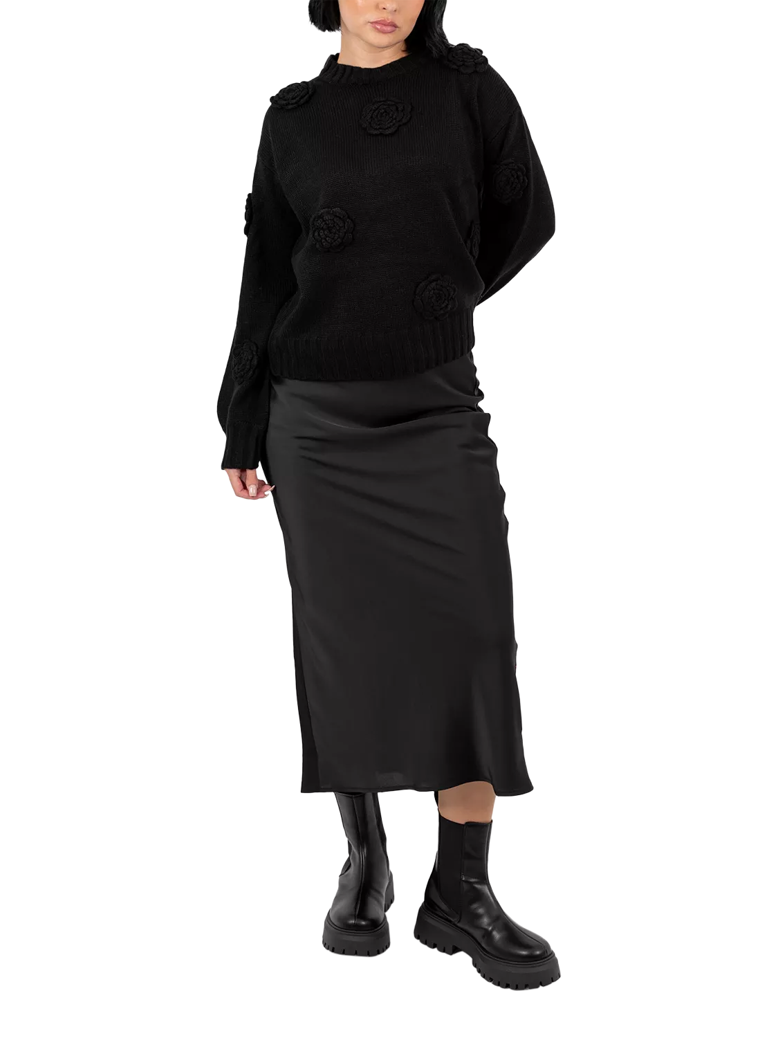 A charming new piece for your autumn wardrobe line-up. This cosy knit jumper features delightful 3D crochet flowers adoring the front bodice and extending down to the long sleeves. Contrasting ribbed and elasticated cuffs hem and neckline add a little extra flair to this already stylish piece. Pair with jeans and boots for a comfy combo or style with a midi skirt and strappy heels for an on-trend evening look.