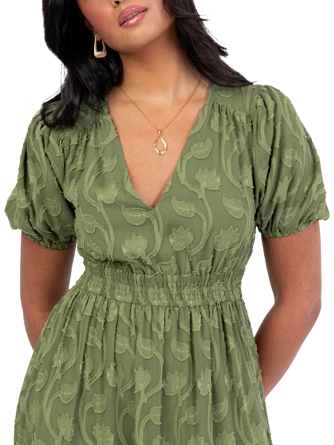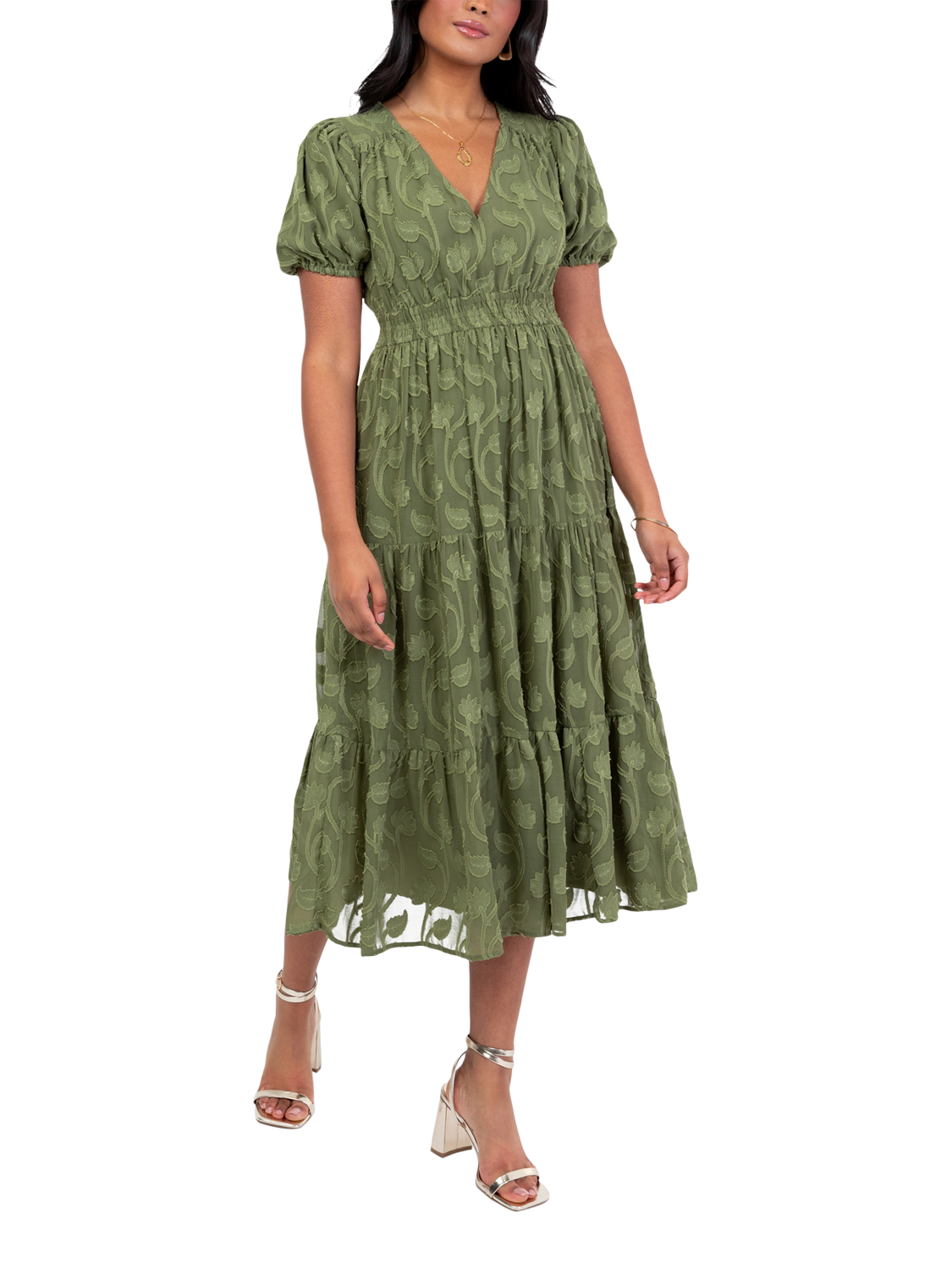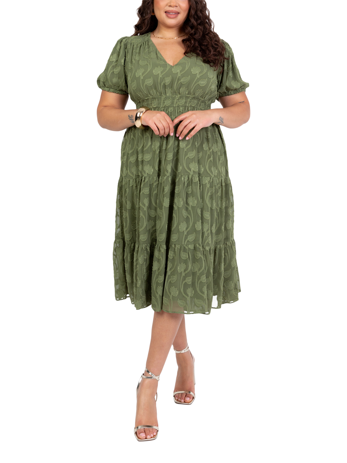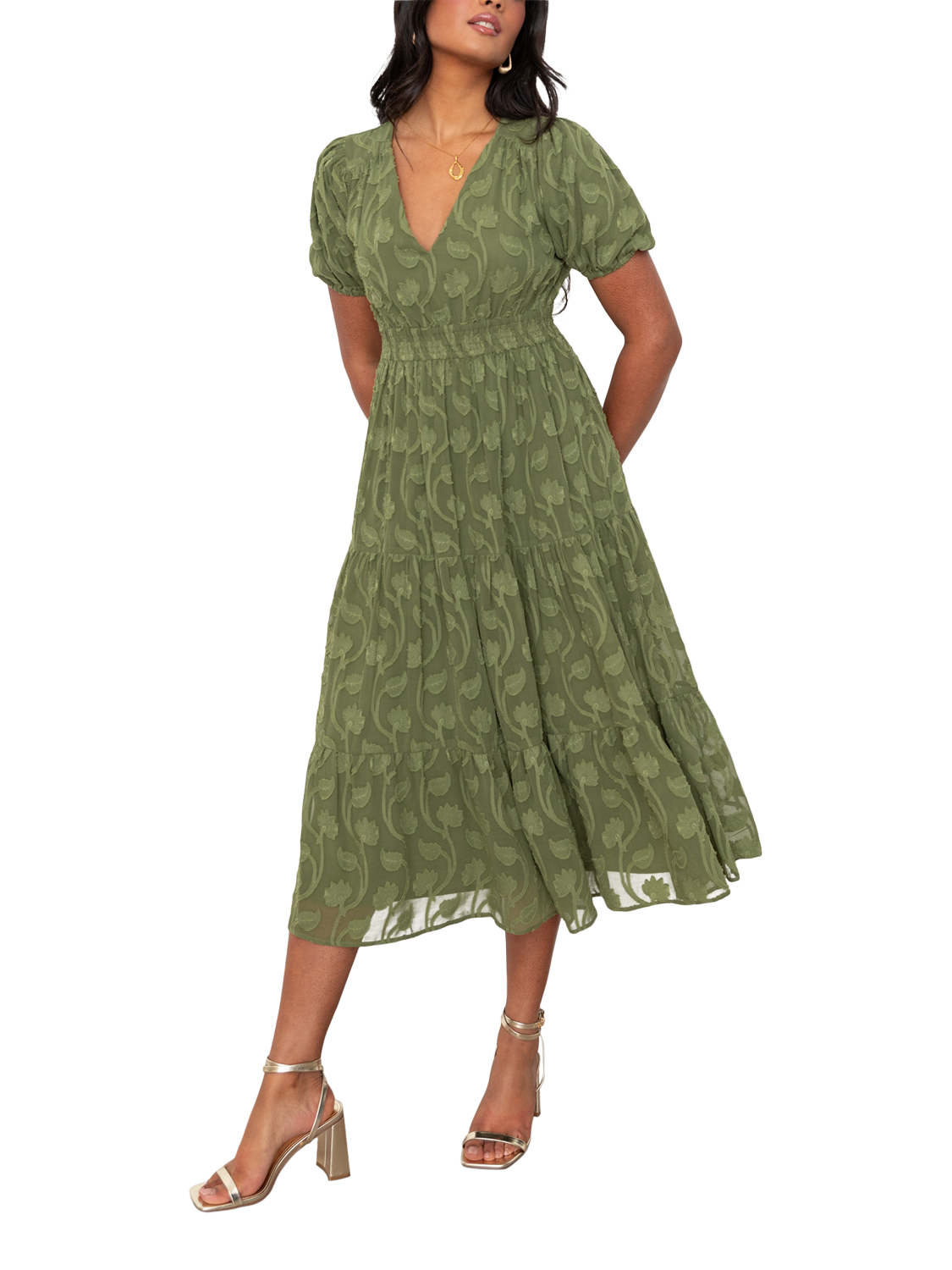 This midi dress features a stunning floral burn-out pattern that adds an elevated touch to this fun piece. Designed with a timeless V-neckline and a flattering cinched waist, it’s complemented by short puffed sleeves and a tiered midi skirt. Pair this statement piece with heeled wedges for a fun and playful holiday vibe or dress it down with white trainers for an effortlessly chic work look.