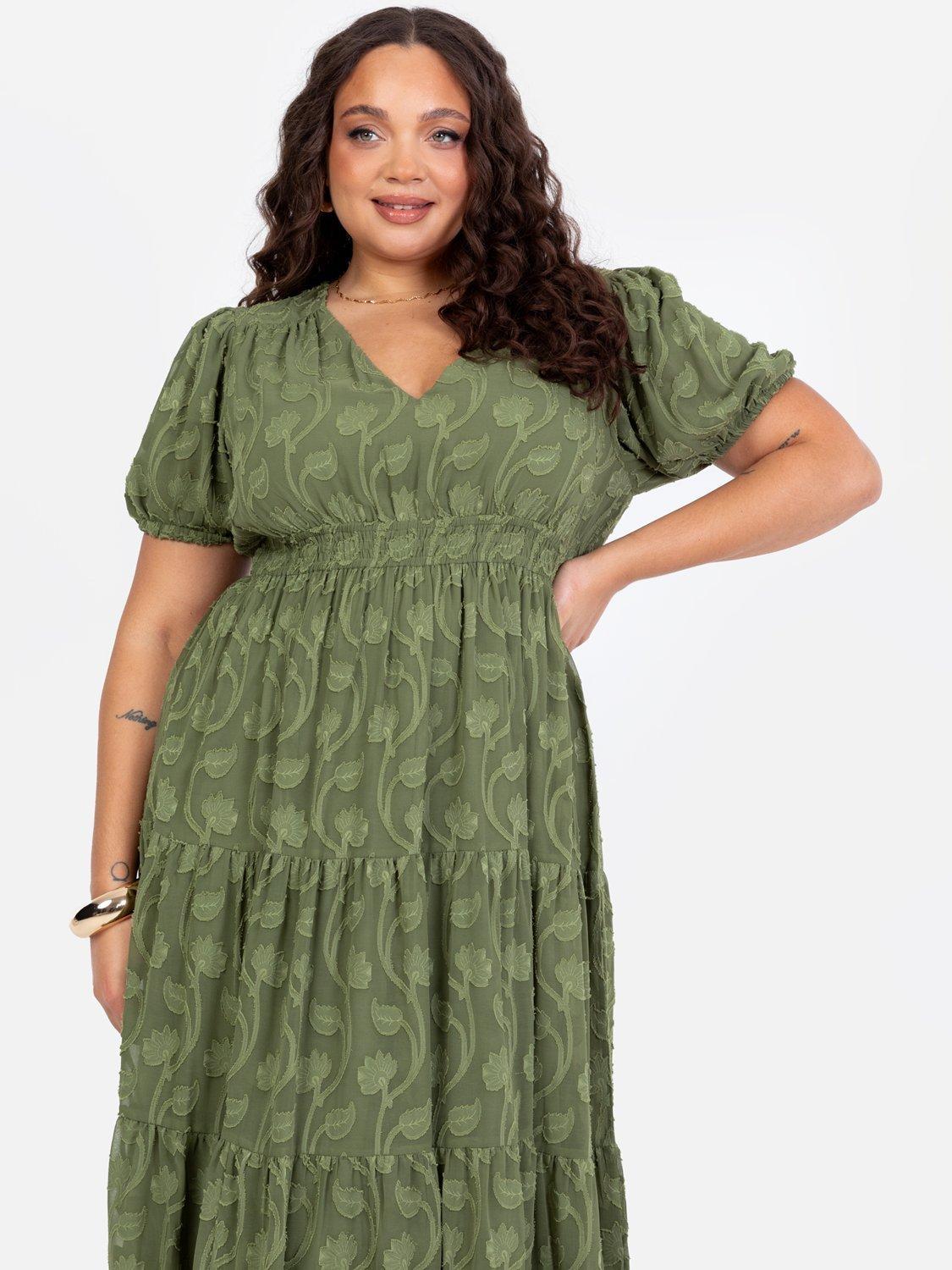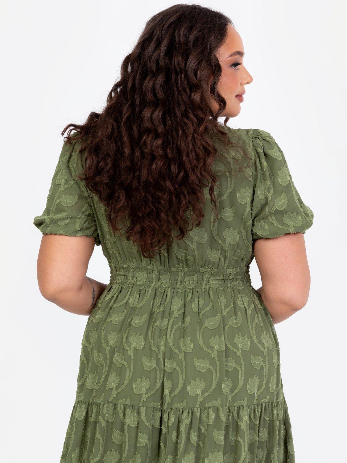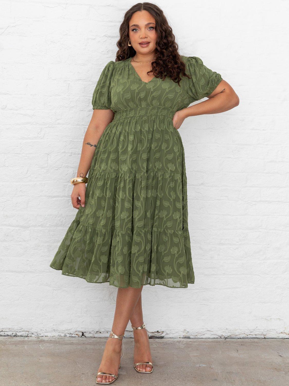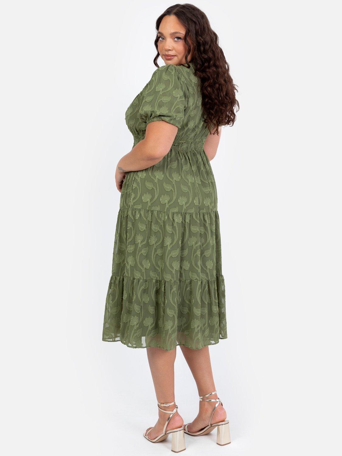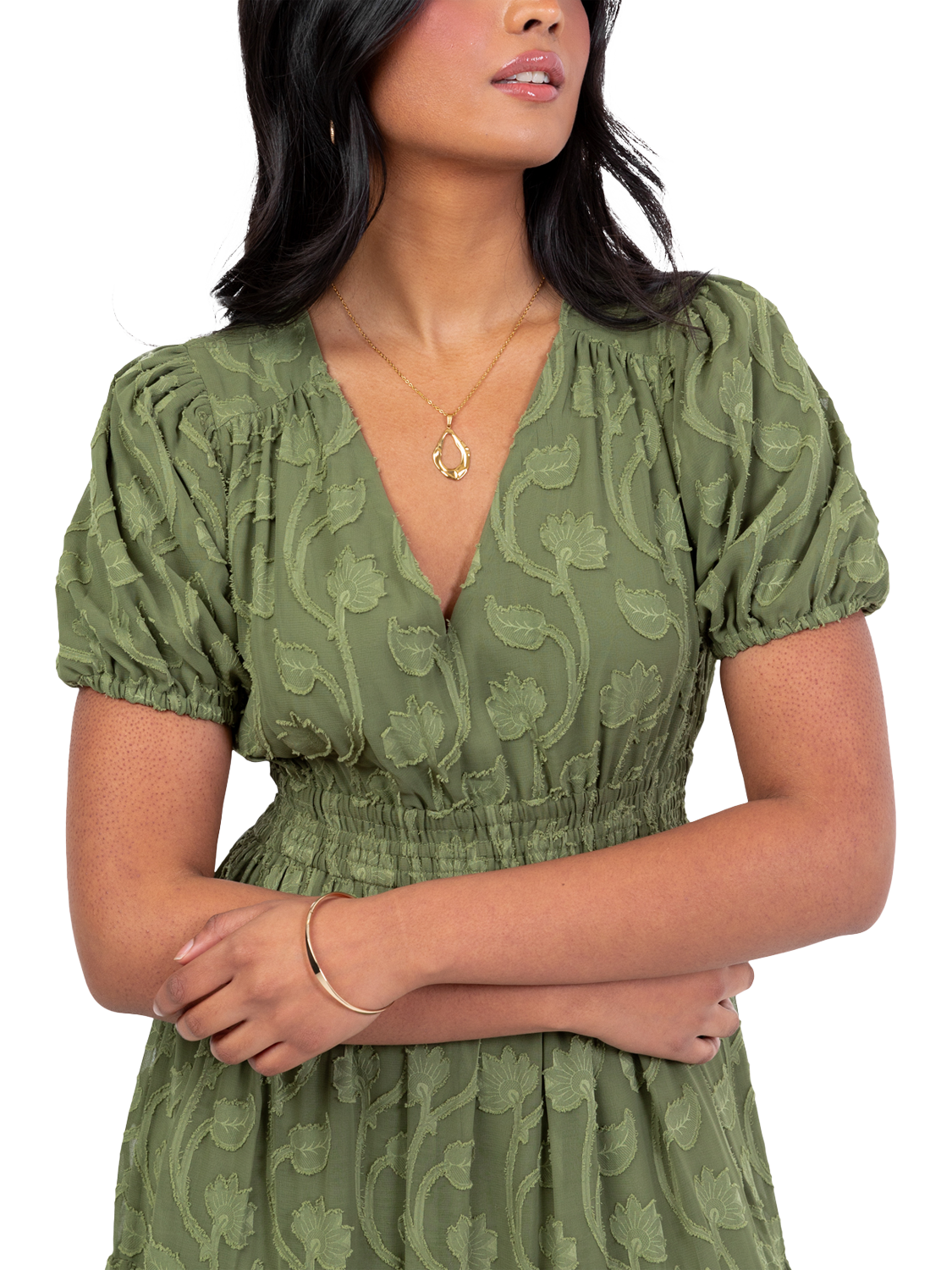 This midi dress features a stunning floral burn-out pattern that adds an elevated touch to this fun piece. Designed with a timeless V-neckline and a flattering cinched waist, it’s complemented by short puffed sleeves and a tiered midi skirt. Pair this statement piece with heeled wedges for a fun and playful holiday vibe or dress it down with white trainers for an effortlessly chic work look.