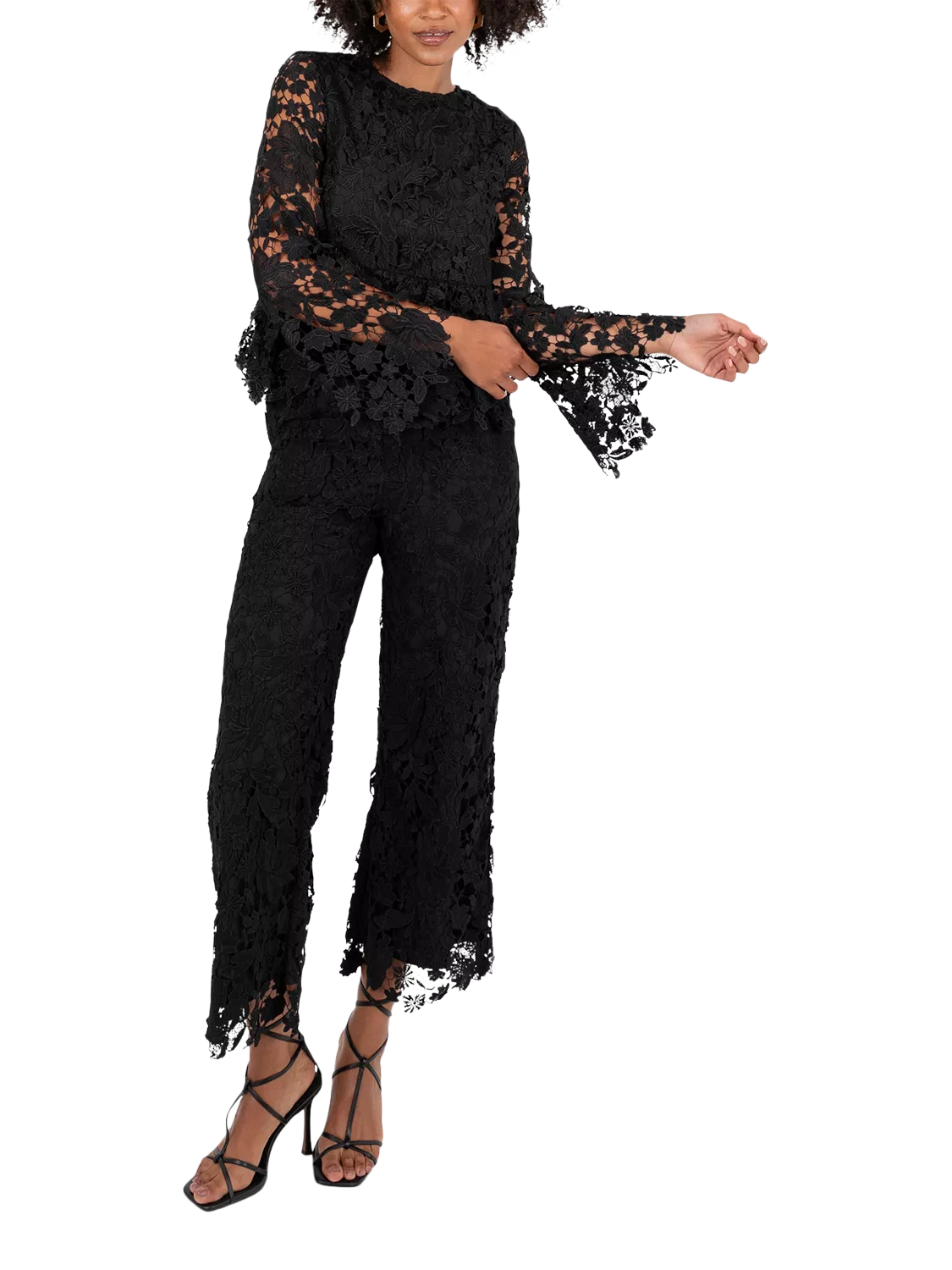 Feel effortlessly elegant in this floral lace top with floral overlay, sheer bell sleeves, and a flattering peplum silhouette.