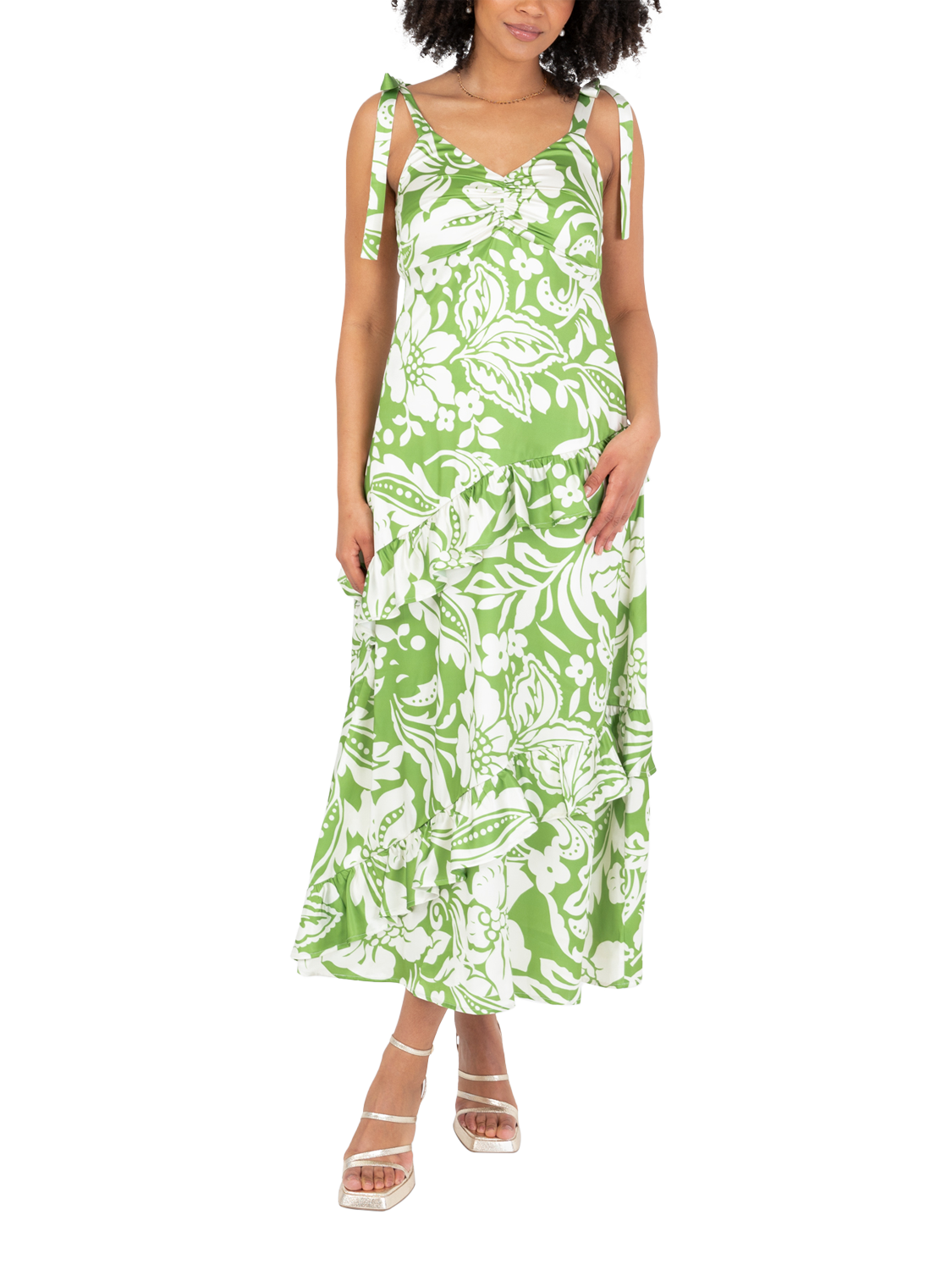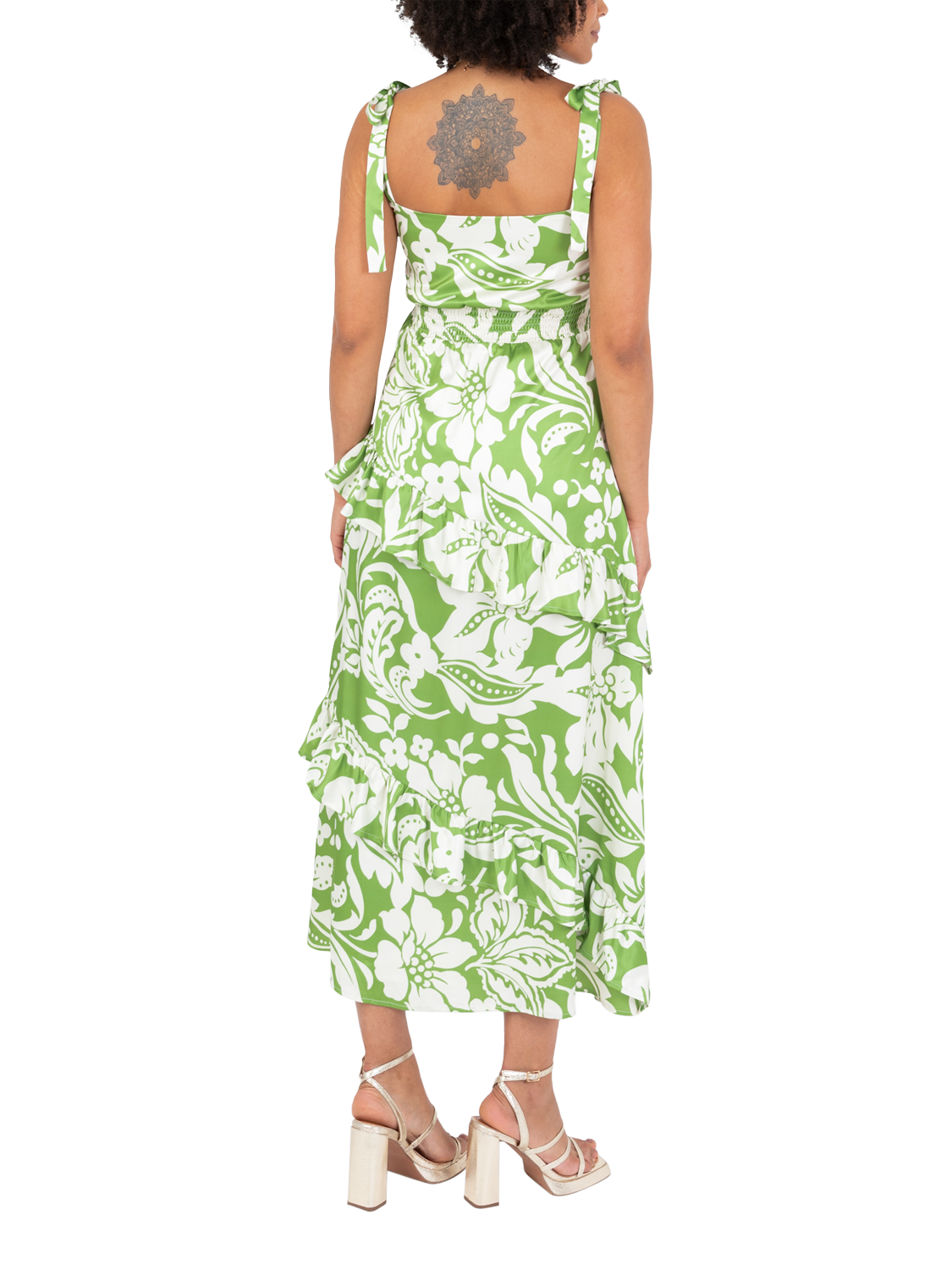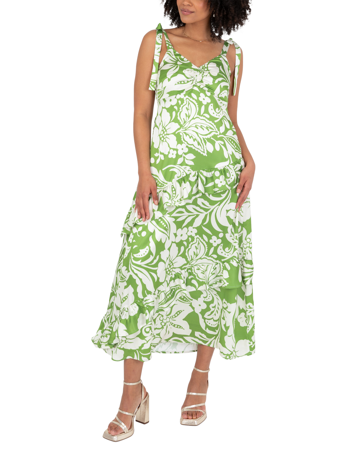 Step into effortless summer style with this Strappy Midaxi dress. Crafted from lightweight satin, this dress drapes beautifully for an elegant yet breezy feel. The refreshing base with a floral pattern exudes timeless charm while the adjustable tie straps and ruched bust detail ensure a flattering fit. A ruffled, tiered skirt adds graceful movement, making it the perfect choice for garden parties, beach holidays, or casual brunches. Pair it with strappy sandals for a relaxed daytime look or dress it up with heels for a chic evening ensemble.
