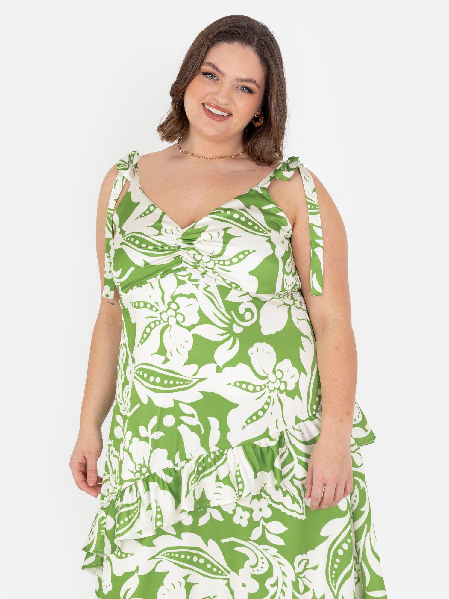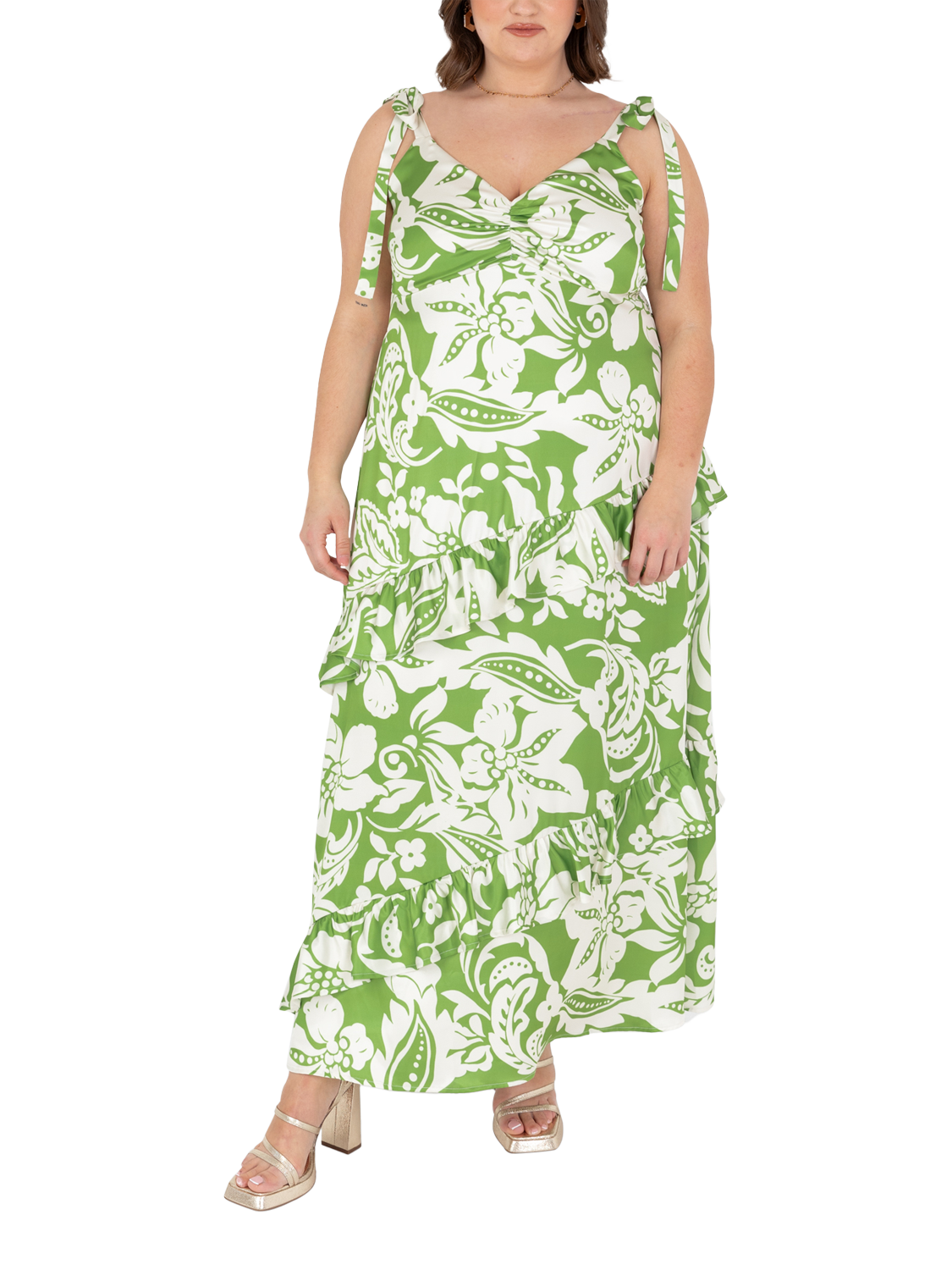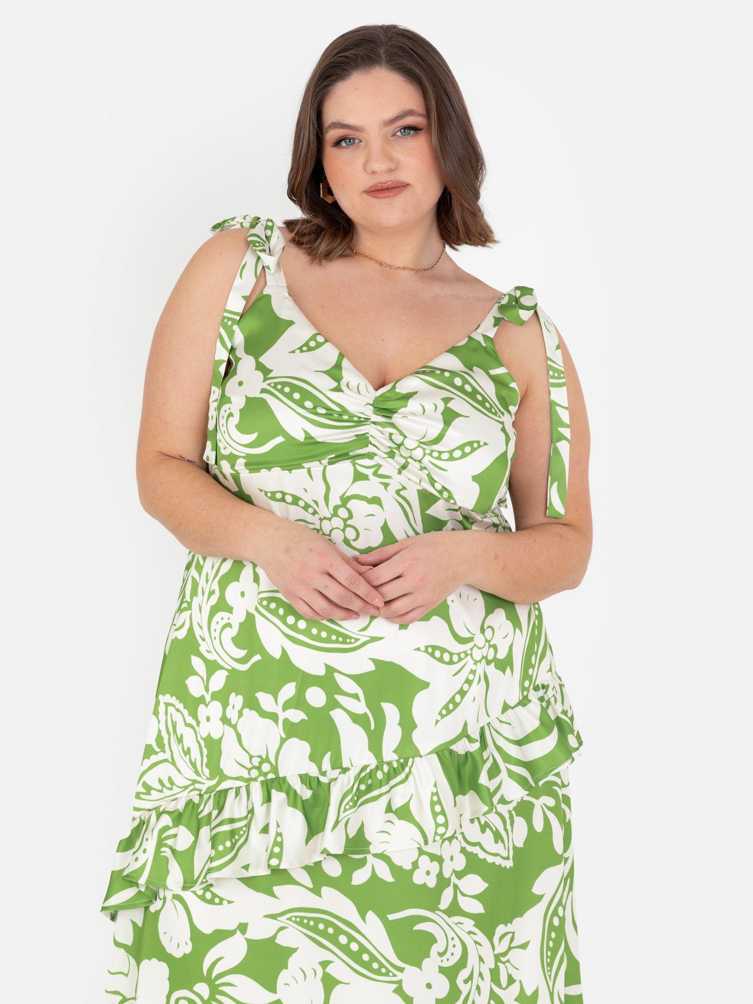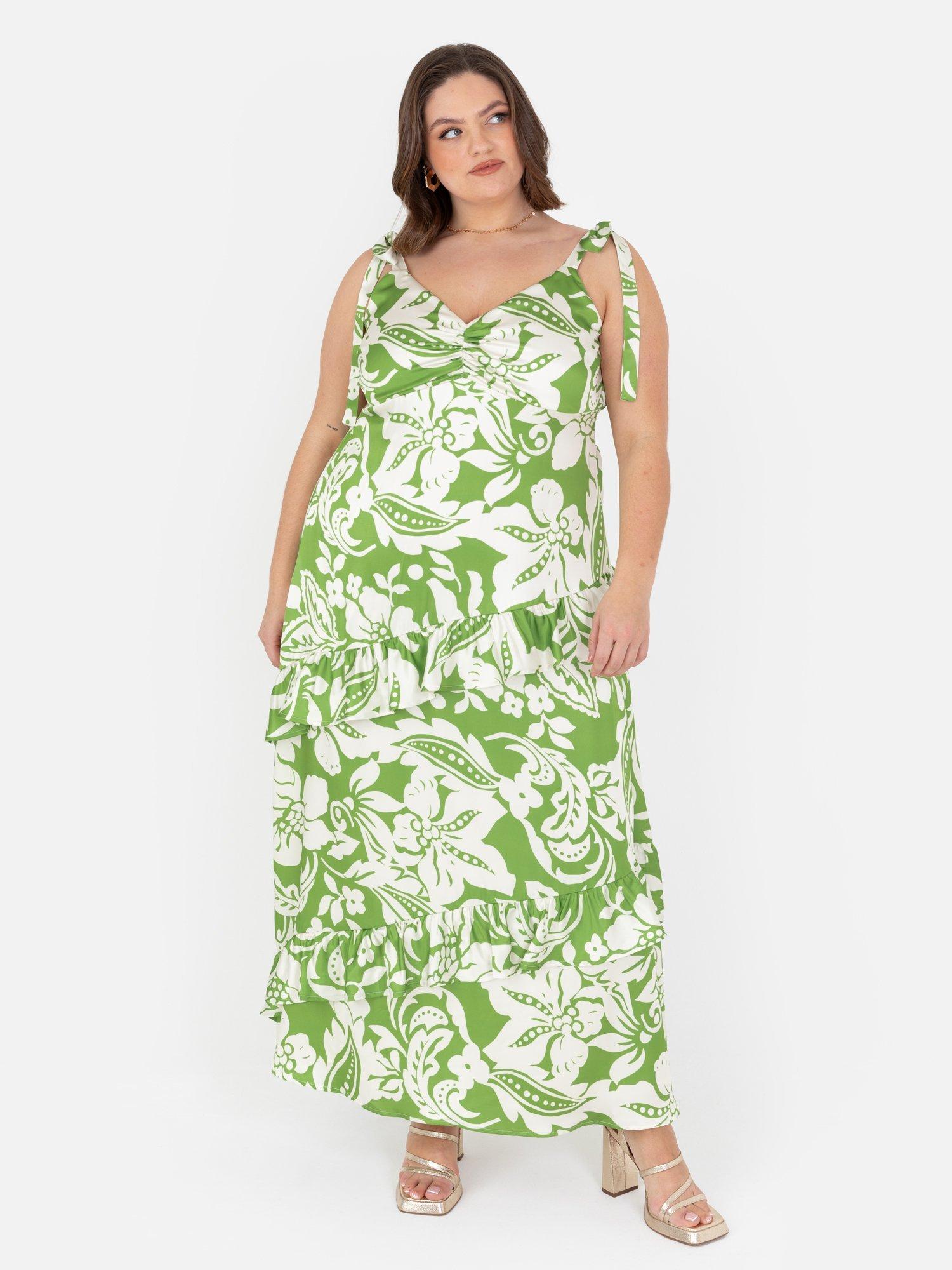 Step into effortless summer style with this Strappy Midaxi dress. Crafted from lightweight satin, this dress drapes beautifully for an elegant yet breezy feel. The refreshing base with a floral pattern exudes timeless charm while the adjustable tie straps and ruched bust detail ensure a flattering fit. A ruffled, tiered skirt adds graceful movement, making it the perfect choice for garden parties, beach holidays, or casual brunches. Pair it with strappy sandals for a relaxed daytime look or dress it up with heels for a chic evening ensemble.