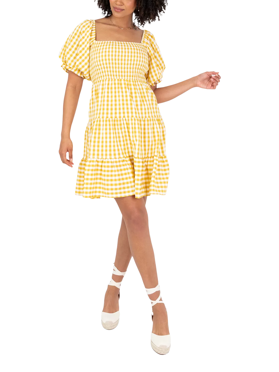 Introducing the elevated Milkmaid Mini, perfect for your summertime wardrobe. This rendition features a classic gingham pattern cut into a mini silhouette that embodies the ultimate cottagecore aesthetic. The square neckline is achieved by a shirred bodice complemented by elasticated shoulders that flow into dramatic short puffed sleeves with elasticated cuffs and delicate ruffle detailing. The tiered mini skirt is ideal for the height of summer, whether you're enjoying after-work drinks or weekend walks in the park. Pair with sandals or trainers for a relaxed yet stylish look.