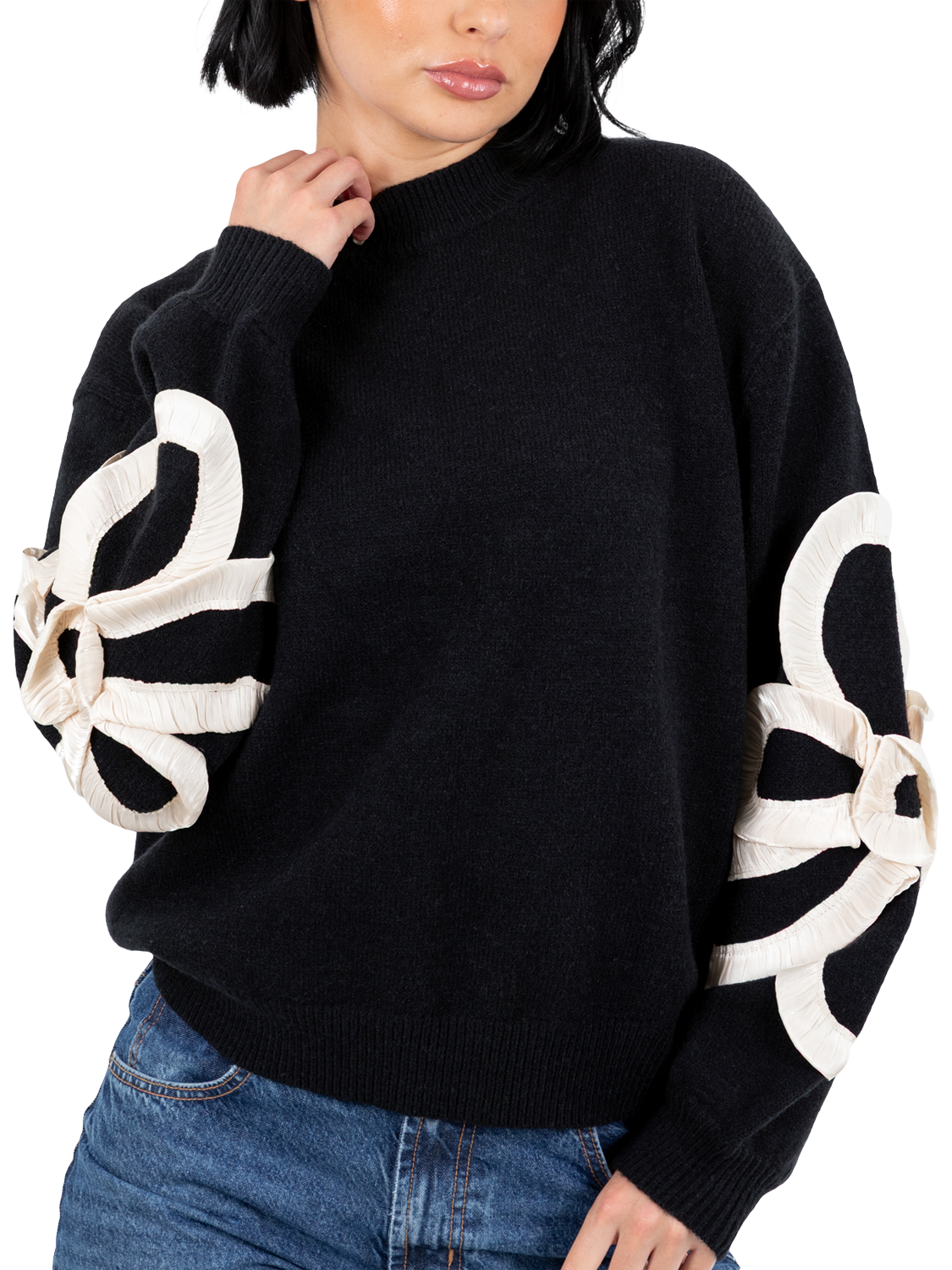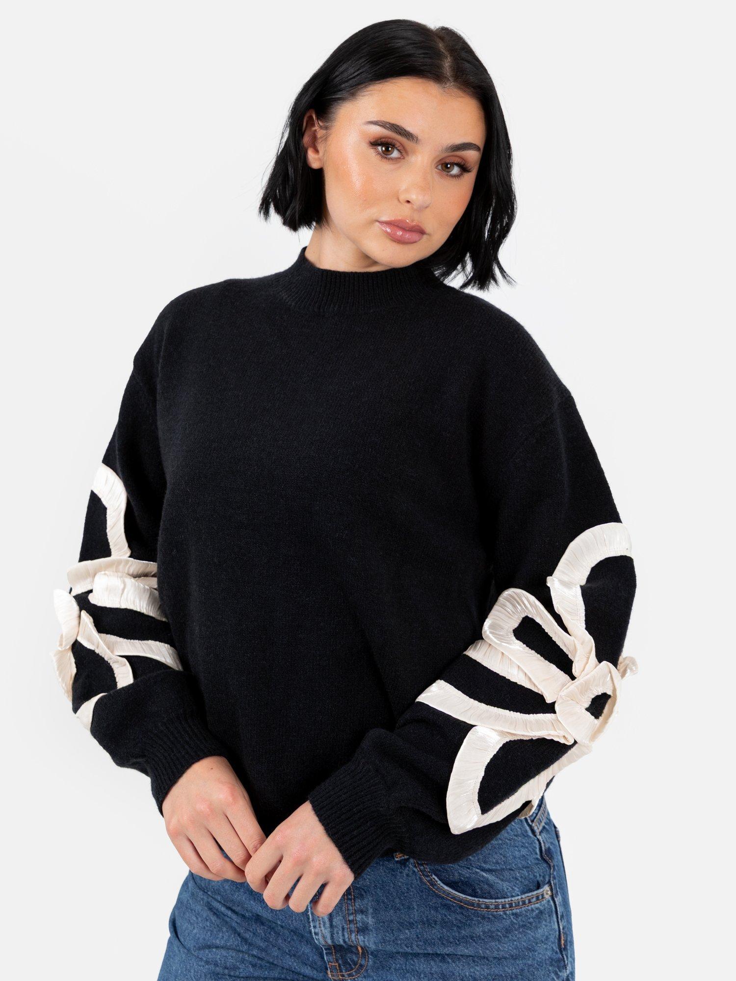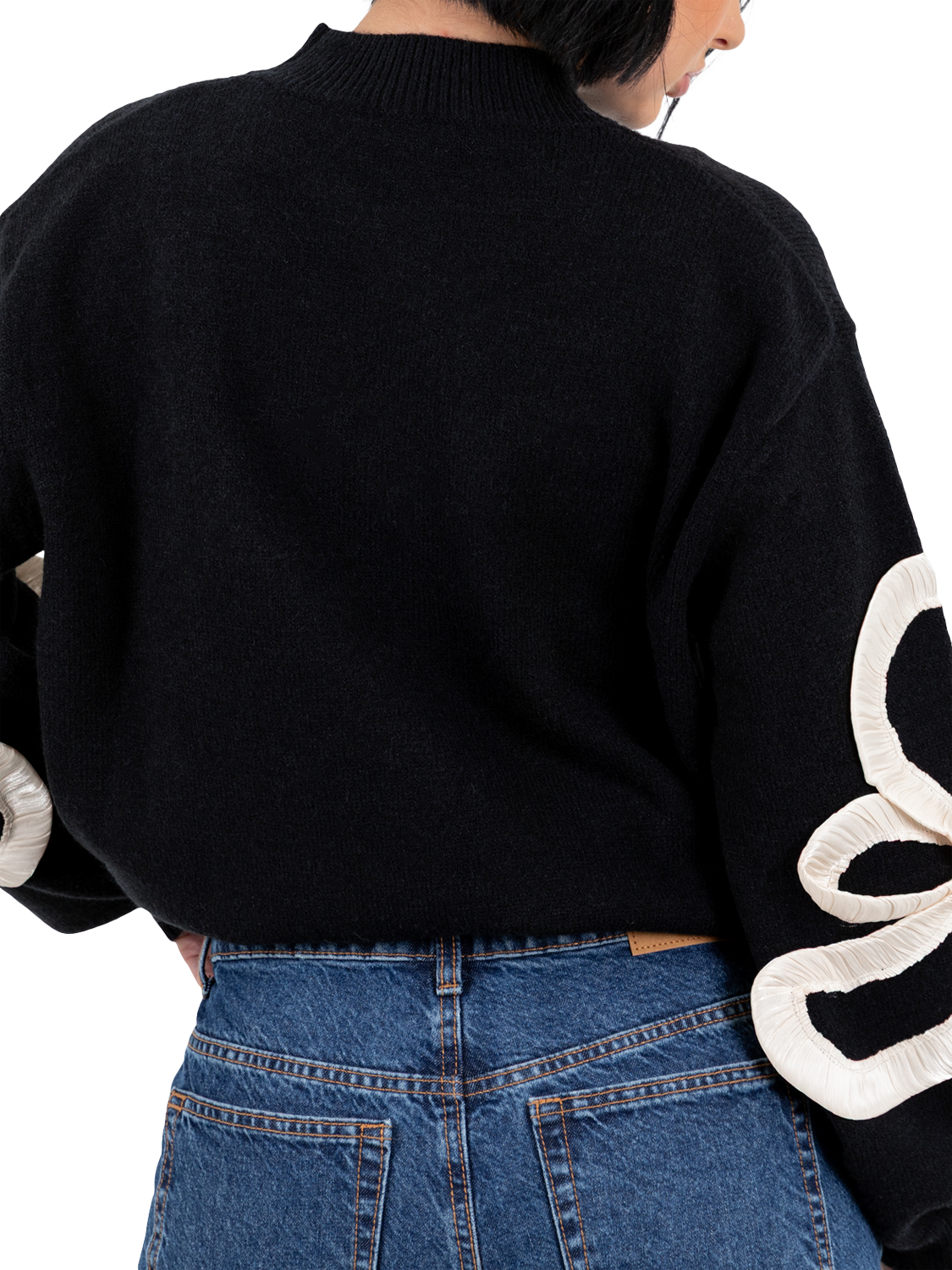 A classic knit with a twist, this jumper features a high neckline, dropped shoulders, and ribbed trims. Cream satin squiggle applique on the sleeves adds texture and movement, with light gathering for a sculptural, standout finish.