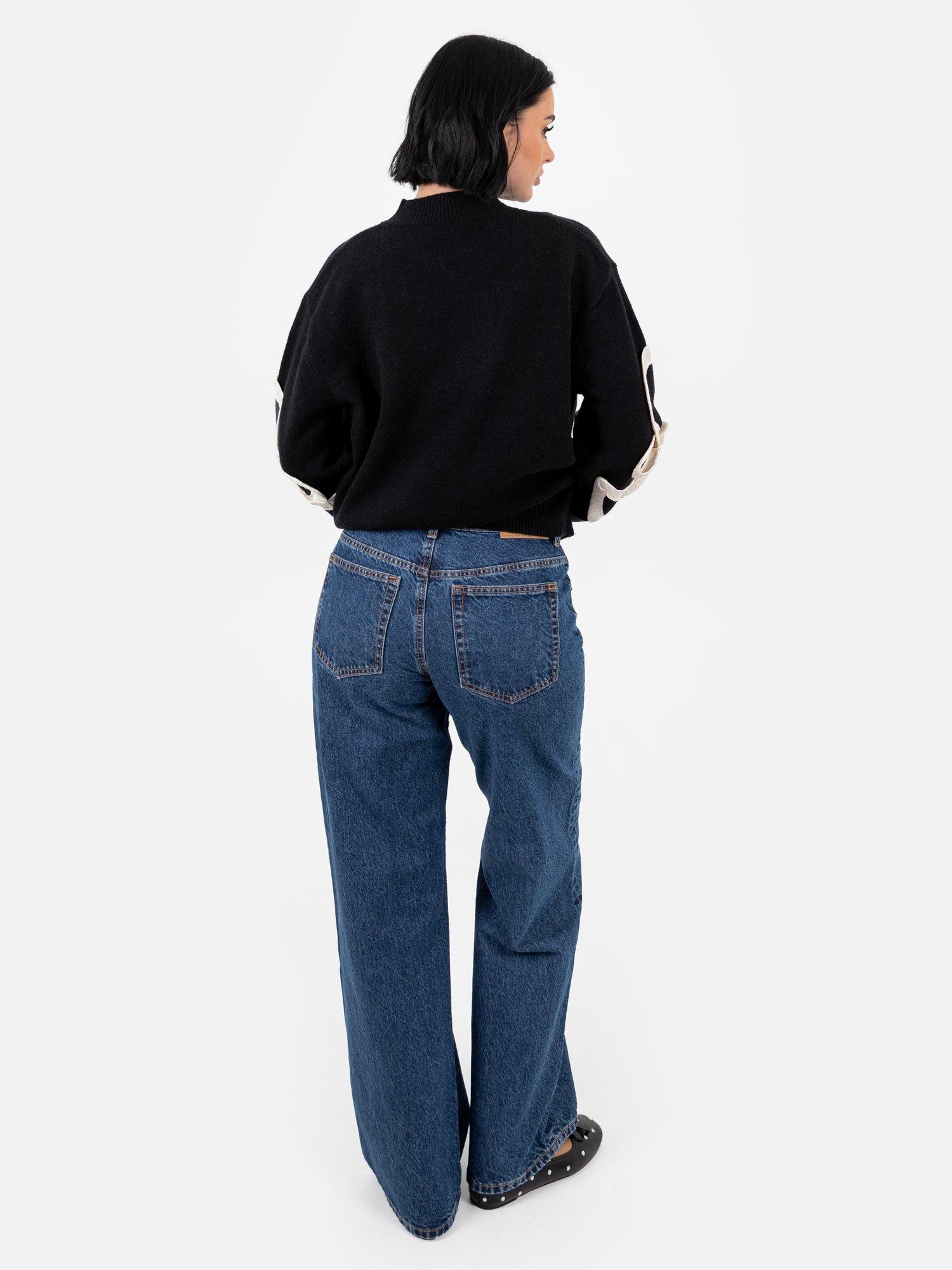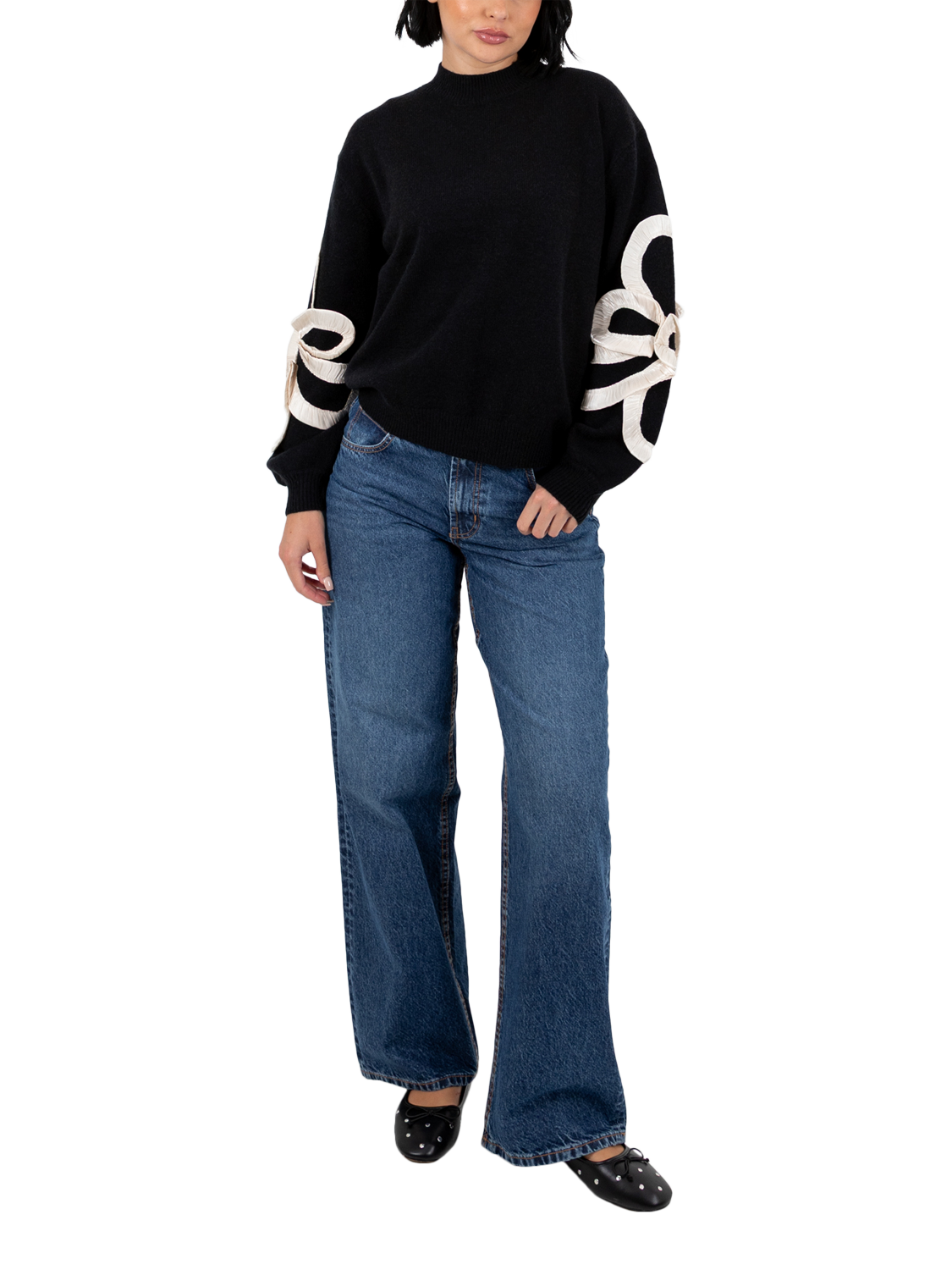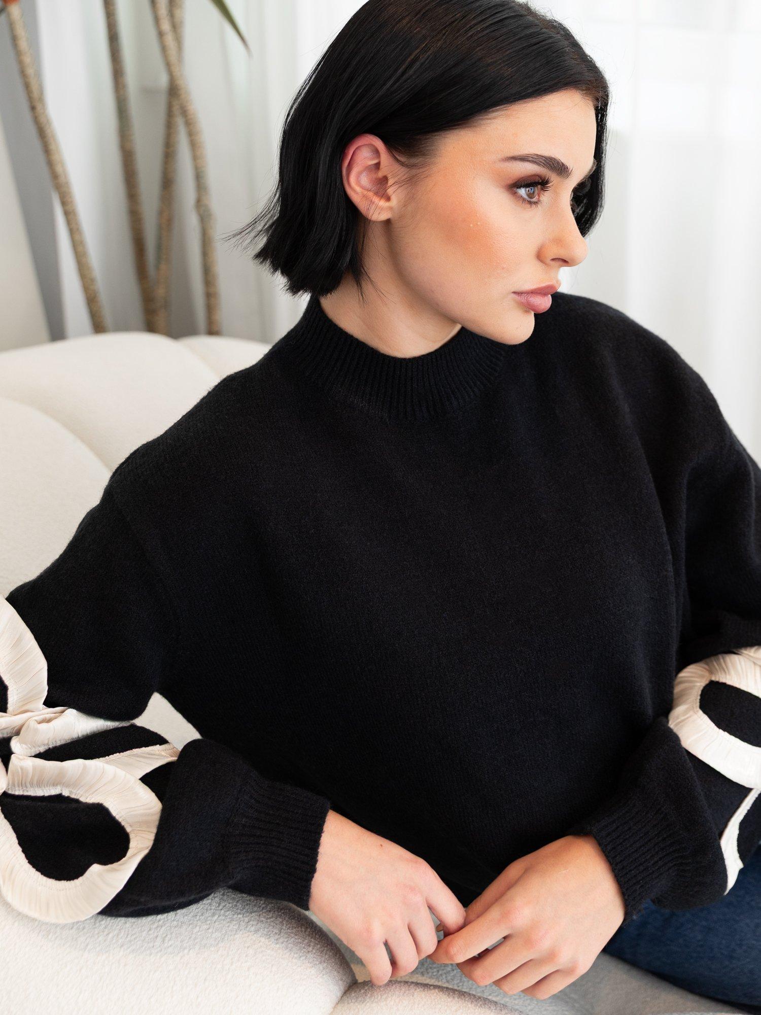 A classic knit with a twist, this jumper features a high neckline, dropped shoulders, and ribbed trims. Cream satin squiggle applique on the sleeves adds texture and movement, with light gathering for a sculptural, standout finish.