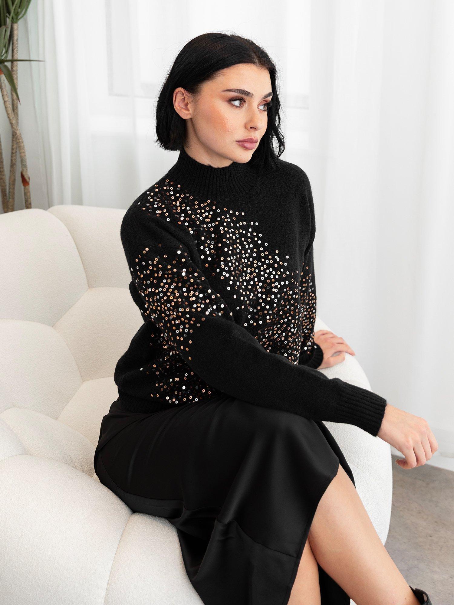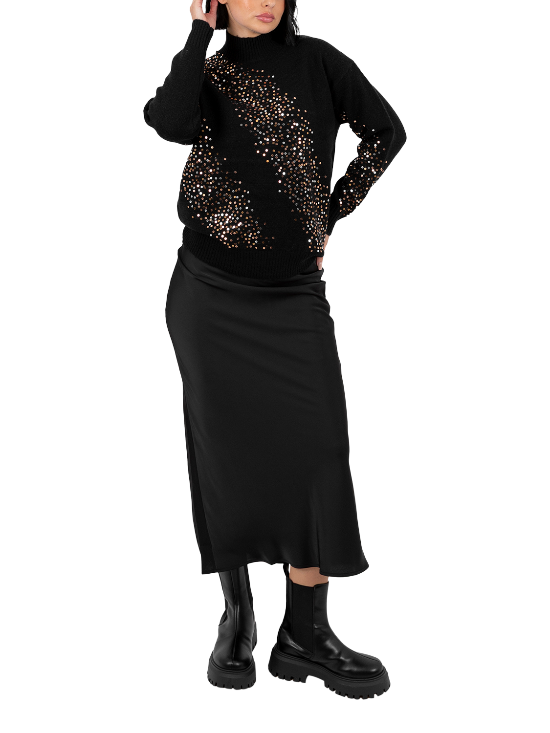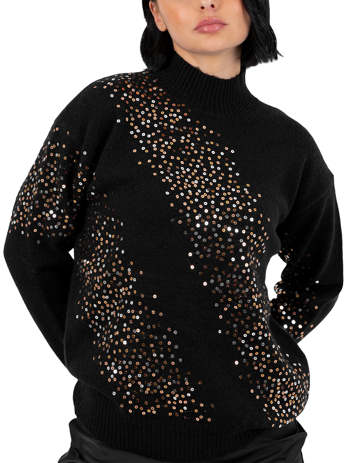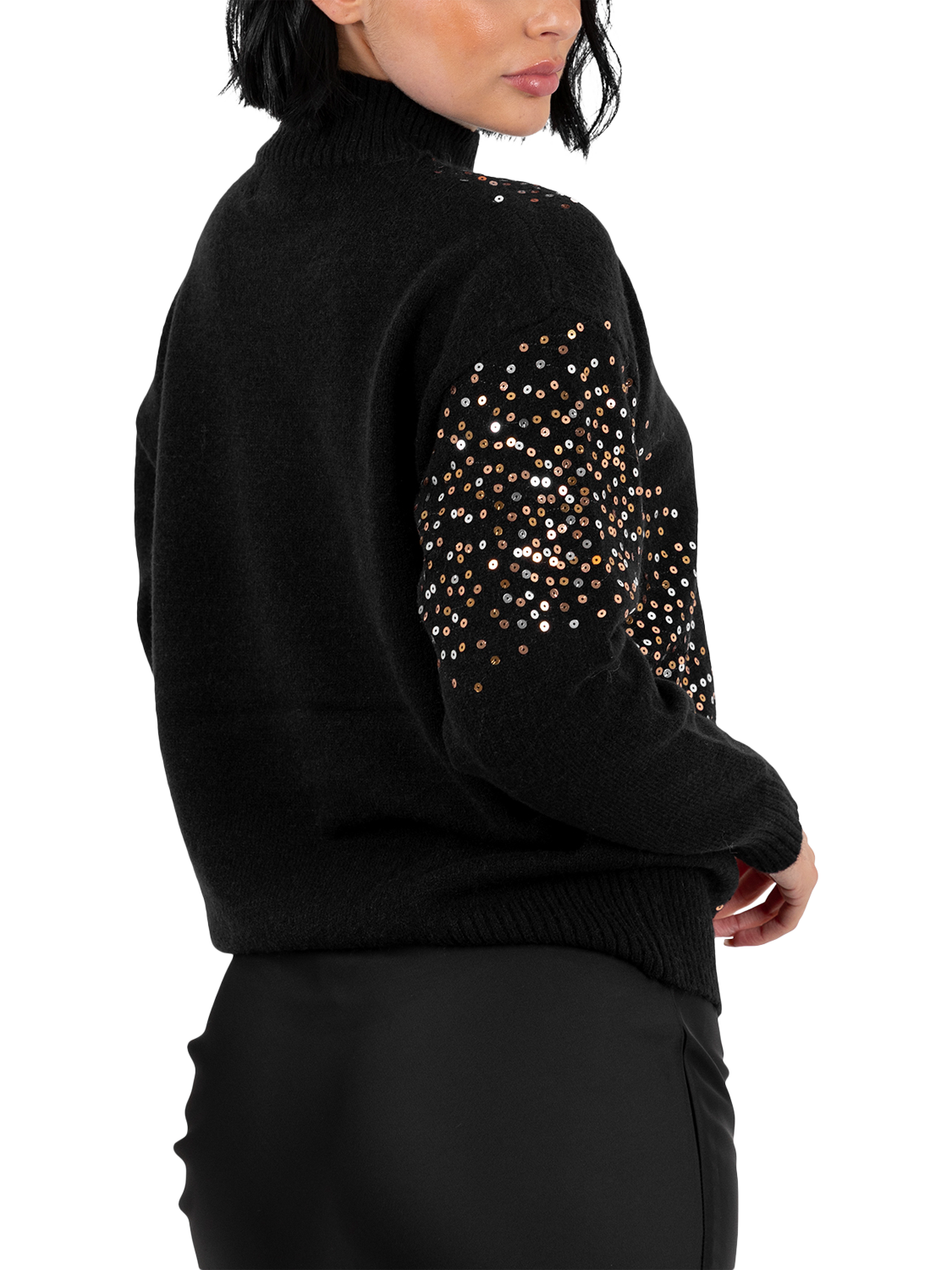Add a little sparkle to your cosy looks! Designed with a high ribbed neckline, this jumper offers a classic style with shimmering embellishments that adorn the front and long sleeves. Perfect for a night out with friends, pair this jumper with jeans and heels for a chic evening look.