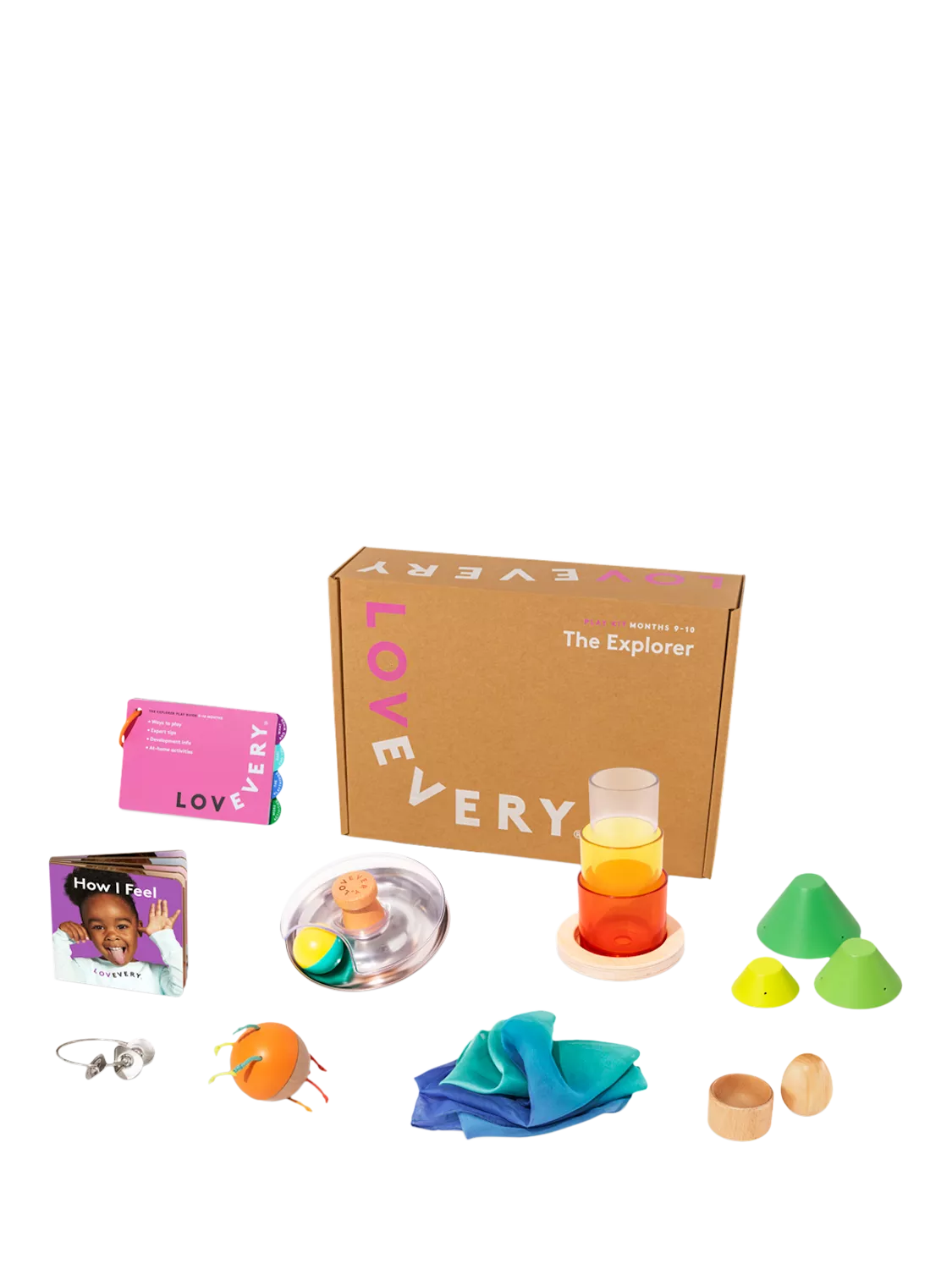 Designed for babies 9-10 months old, The Explorer Play Kit encourages big body movements, fine motor skills, and problem-solving with surprising items that jingle, stack, and roll.