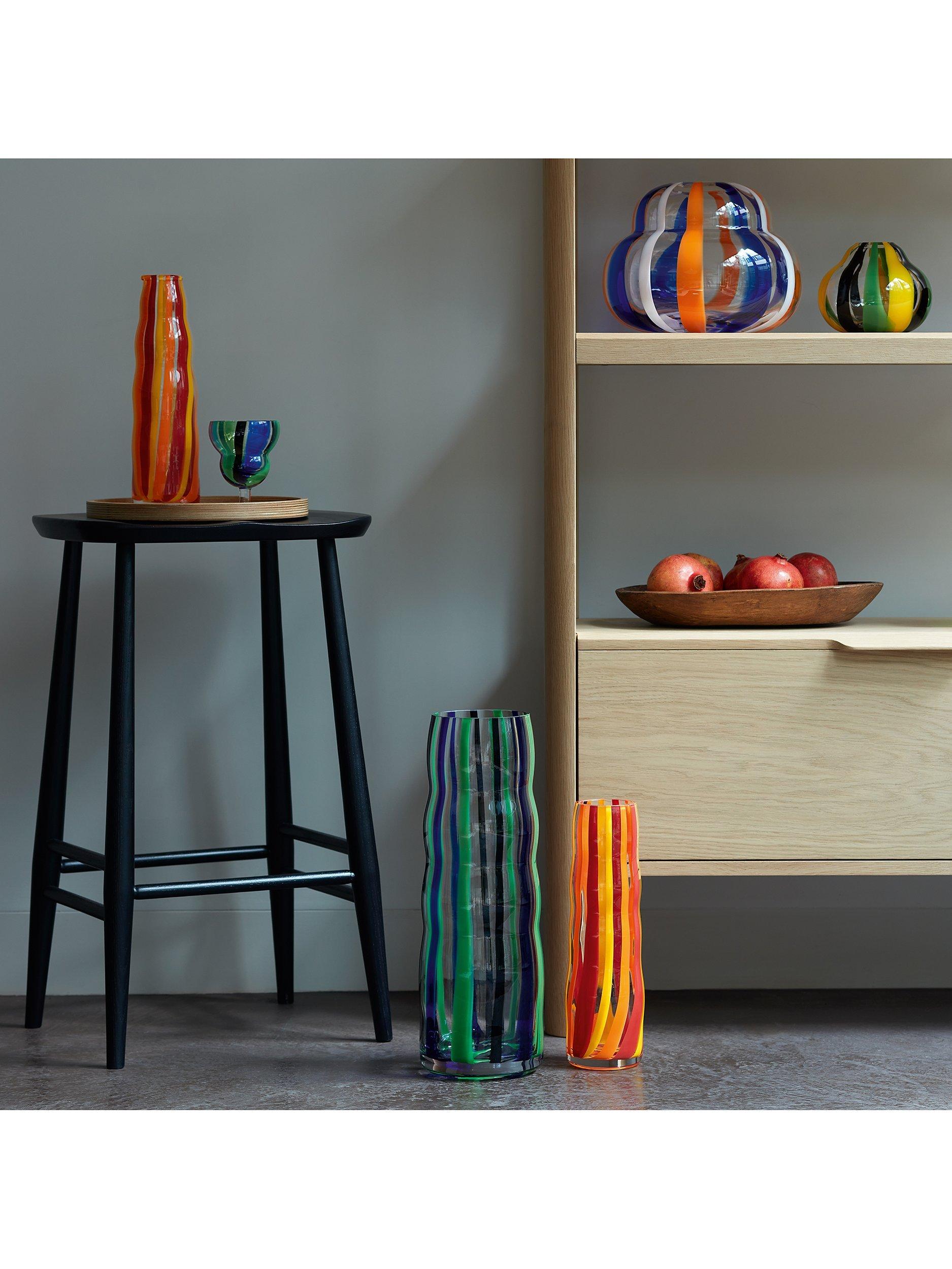 Made of mouth-blown glass in Poland, with a distinctive striped decoration and curved form.
