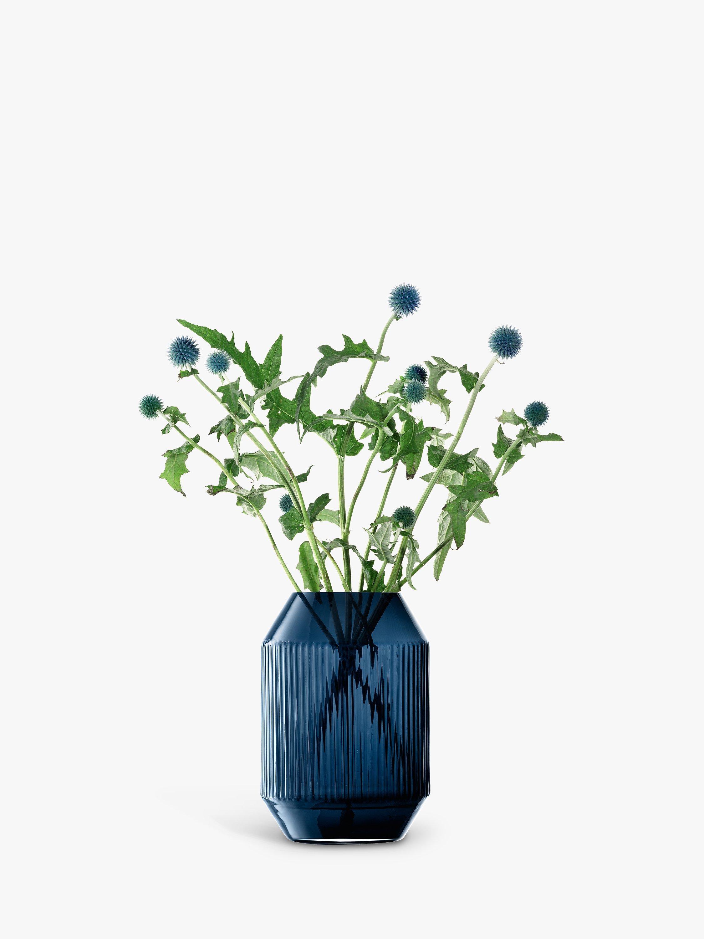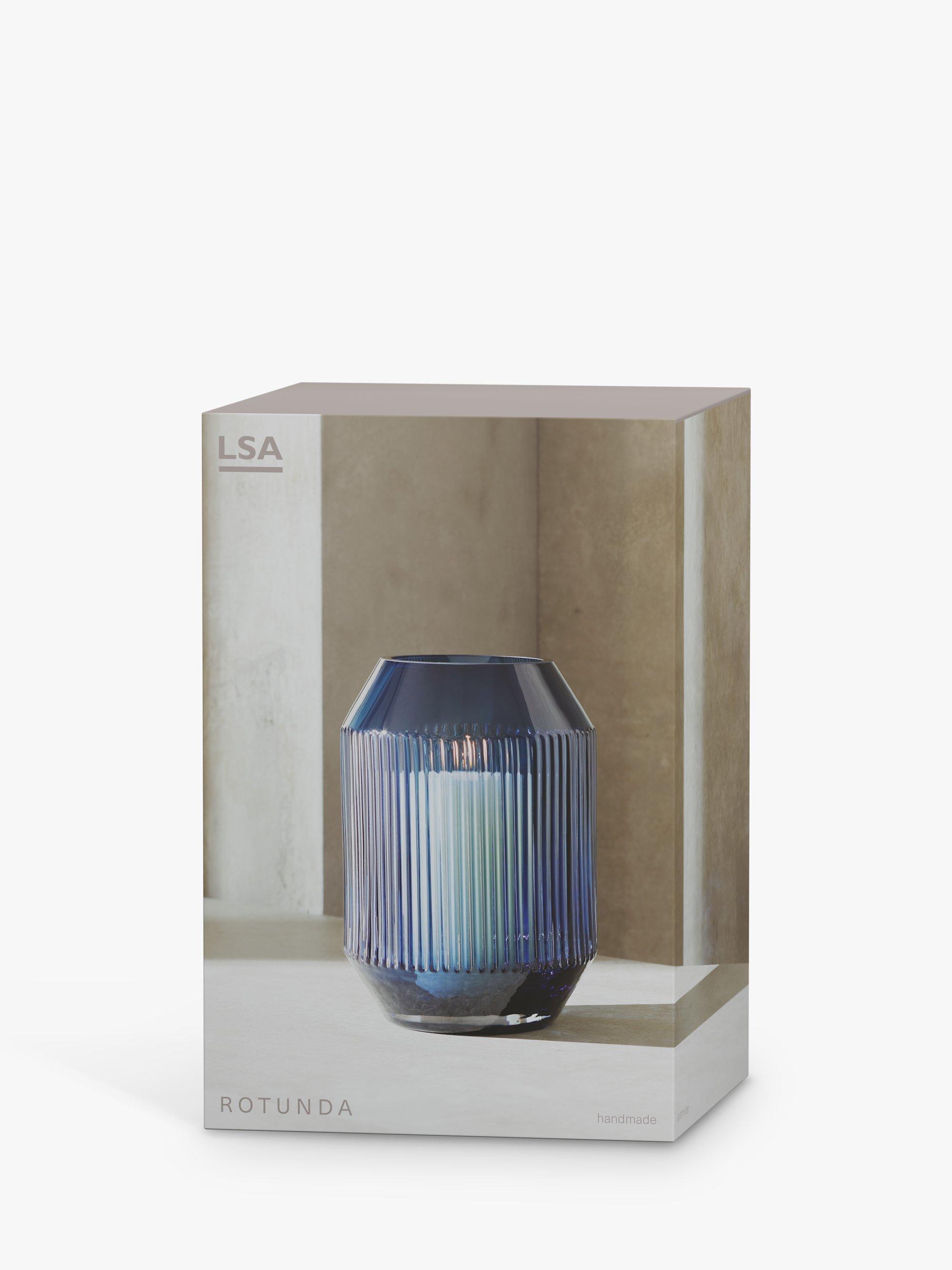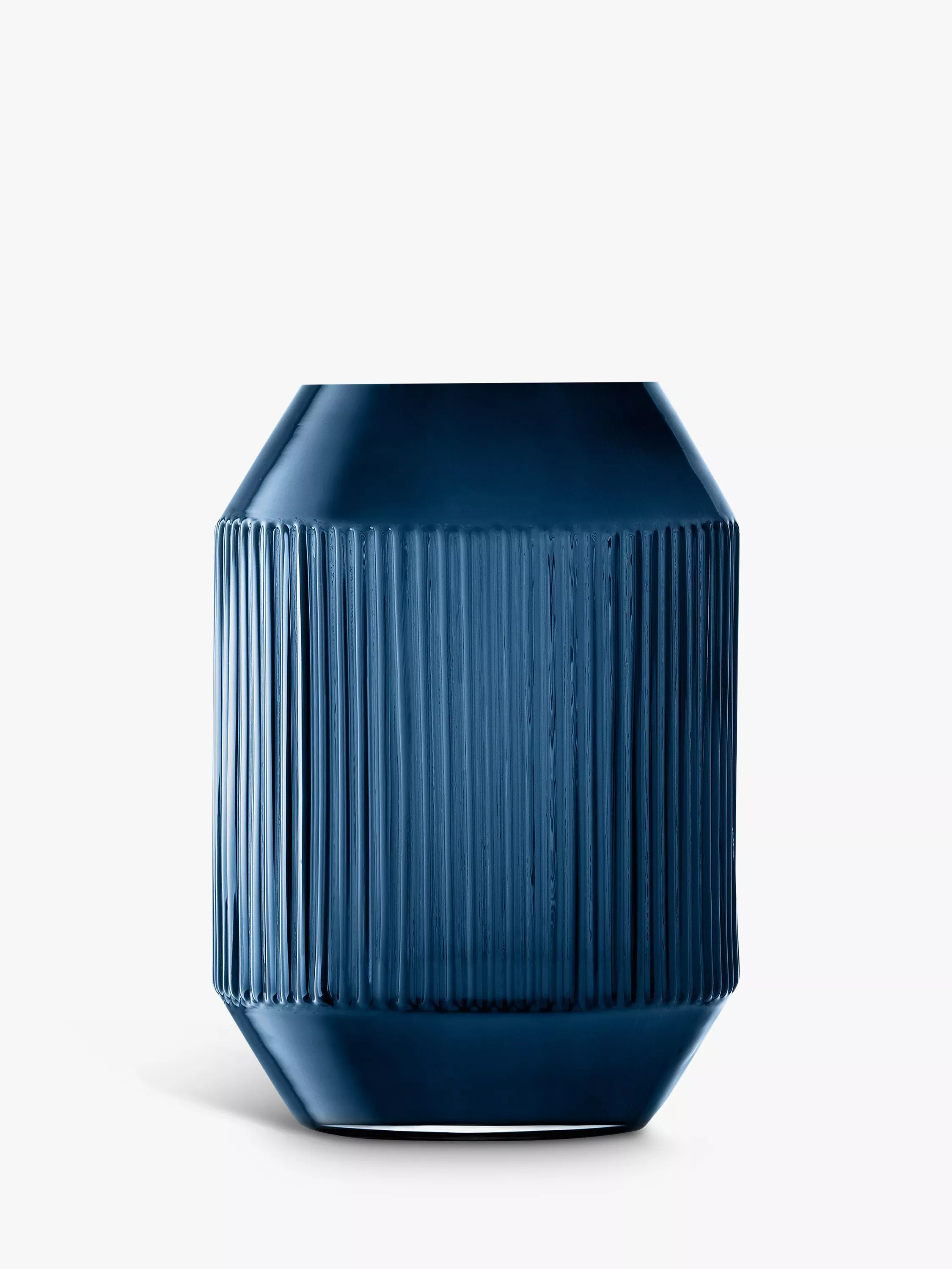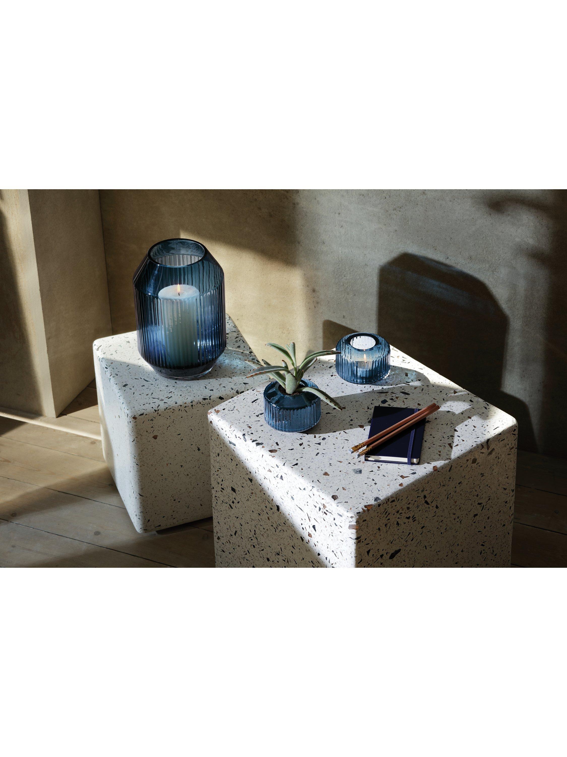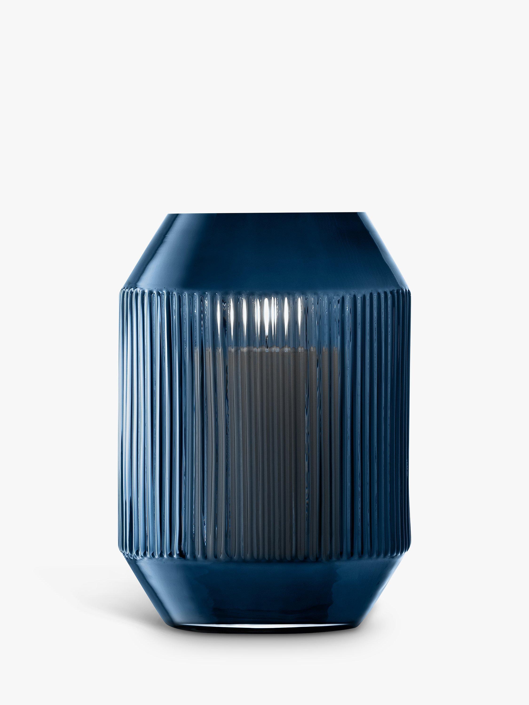 A mouth-blown lantern in angula rshapes with bands of corrugated texture, inspired by the iconic Warsaw Rotunda building and the perspective, scale and repetition found in contemporary architecture. Made from cased sapphire glass and supplied with candle.