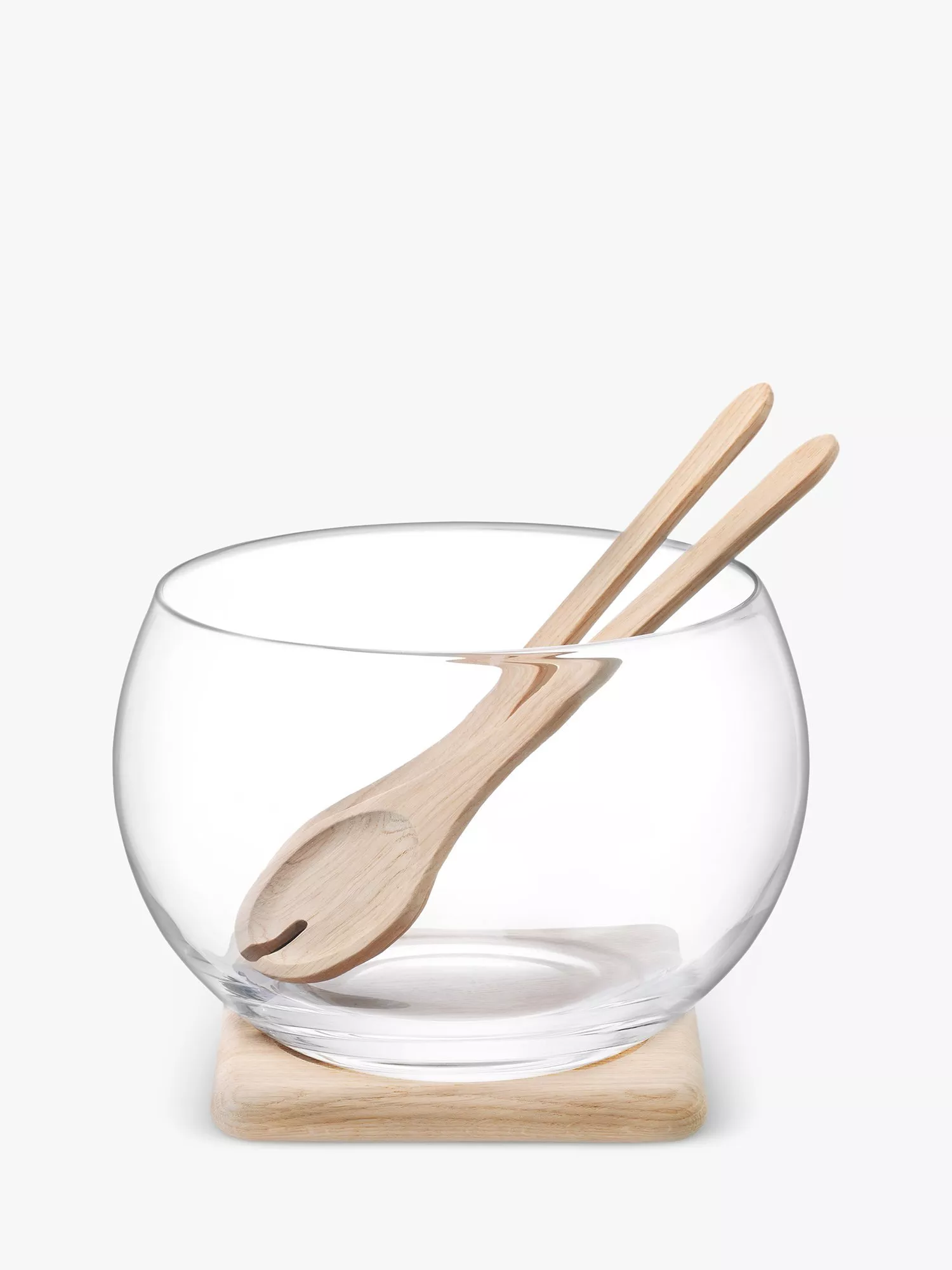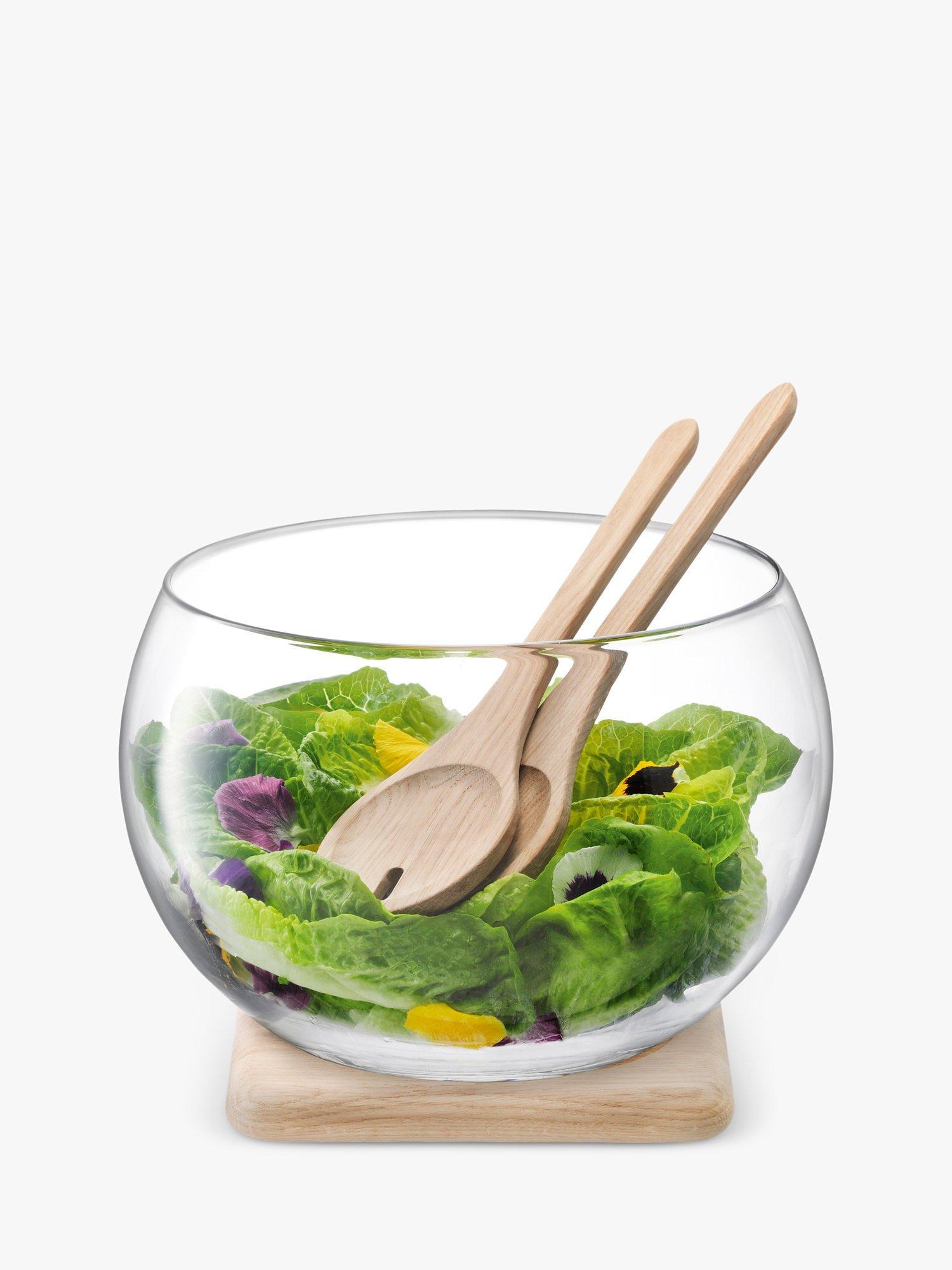 The mouthblown glass bowl comes with a pair of salad servers and a base made of FSC-certified oak wood, sourced from sustainably managed forests.
