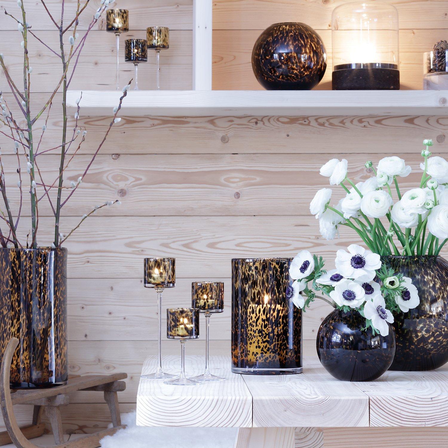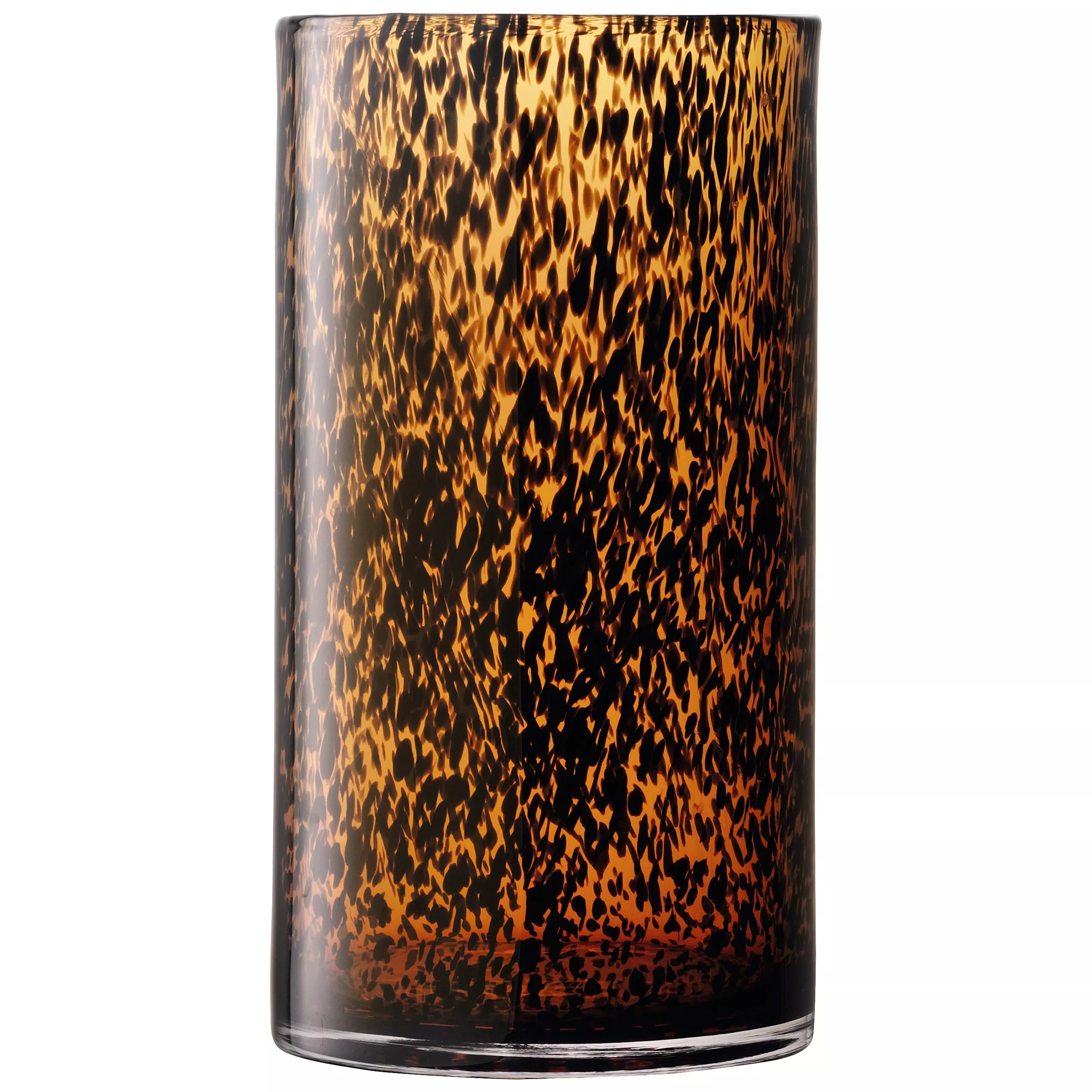 Traditional glass making techniques are used to create this vase, inspired by the dappled effect of tortoiseshell. Amber glass is mottled with flecks of black and cased within clear glass walls. The column shape allows it to double up as a lantern by placing candles inside, casting light through the finish on the glass.