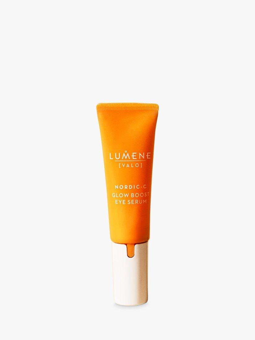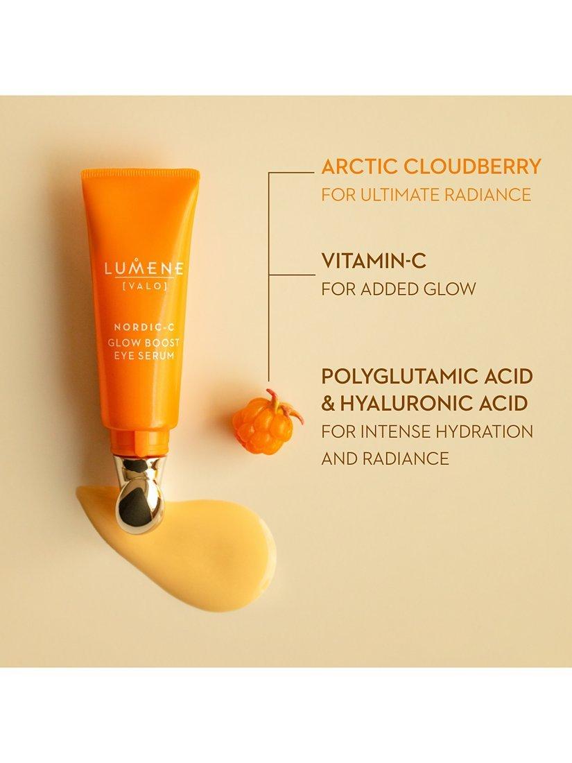 Lumene Nordic-C [Valo] Glow Boost Eye Serum is clinically tested* to visibly diminish the look of dark circles and hydrate for smoother and brighter-looking eye area. The lightweight serum formula is infused with antioxidant-rich wild Arctic cloudberry and vitamin C combined with hyaluronic acid and polyglutamic acid for the ultimate glow. The cooling applicator also helps to reduce the look of puffiness.