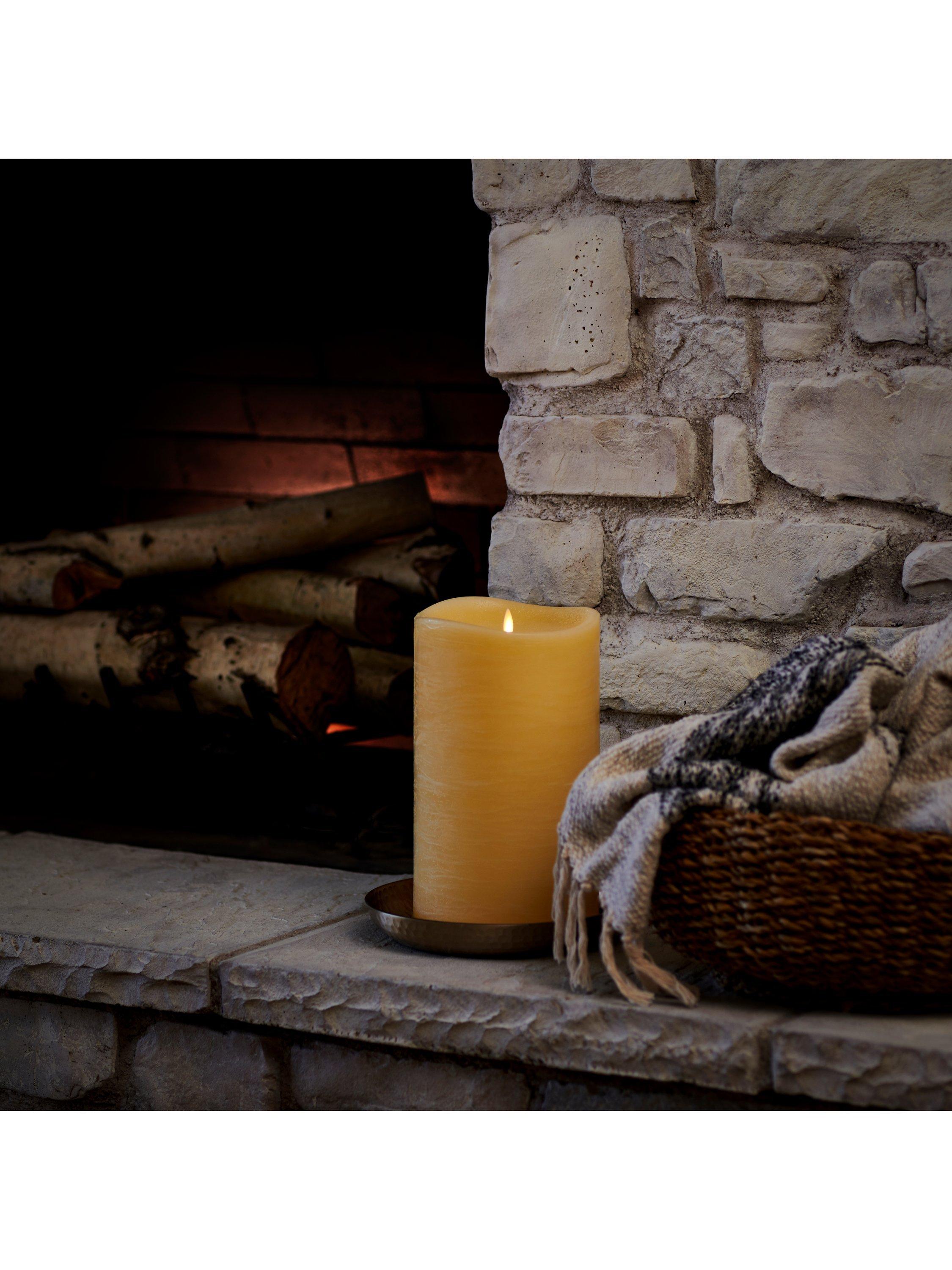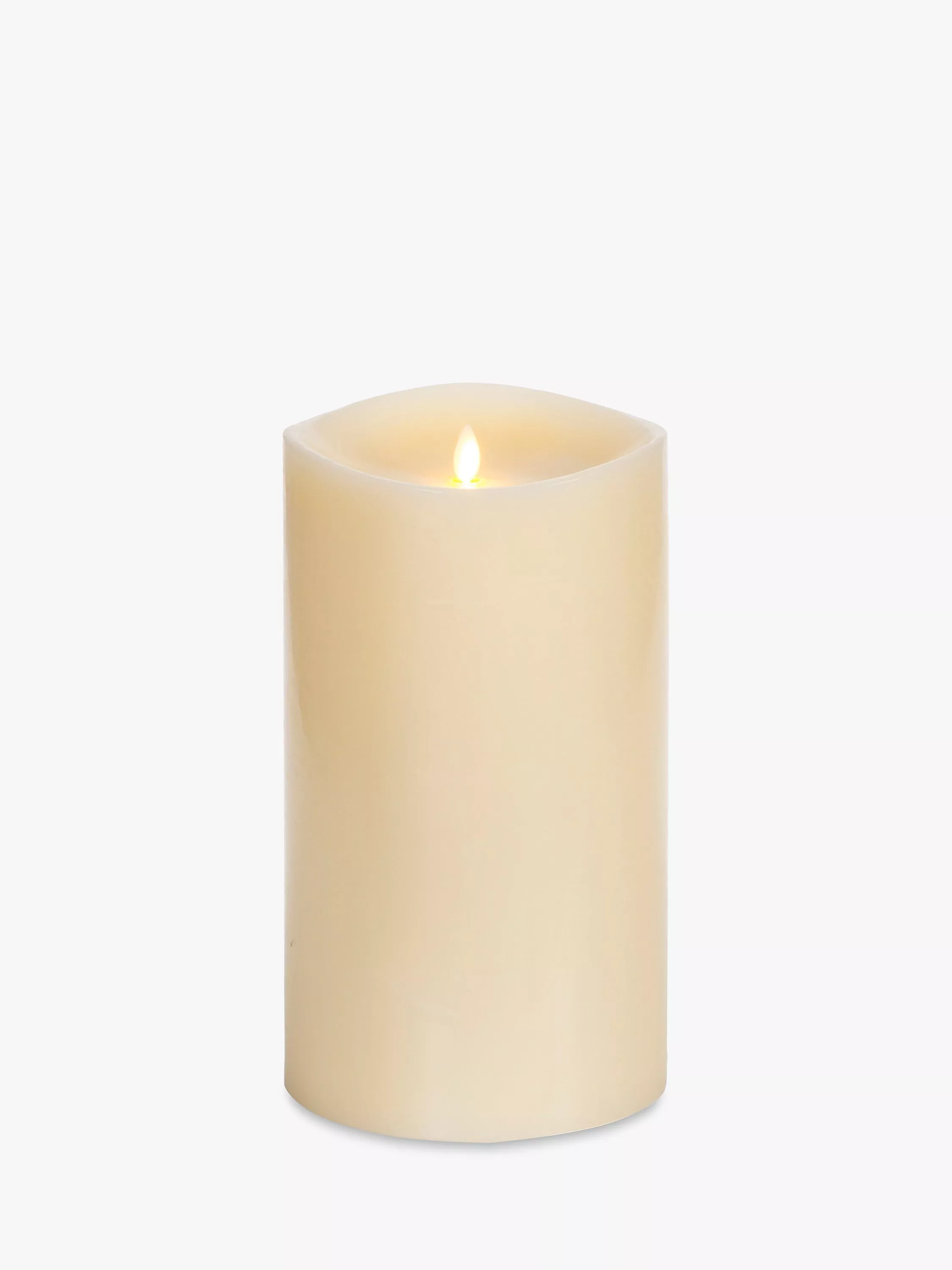 A Luminara Wax Ivory Living Flame Pillar Candle.