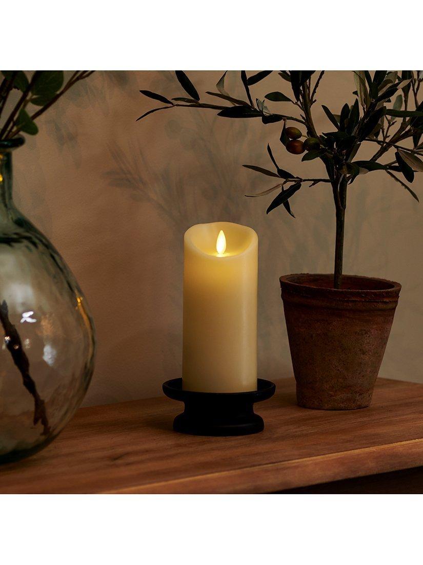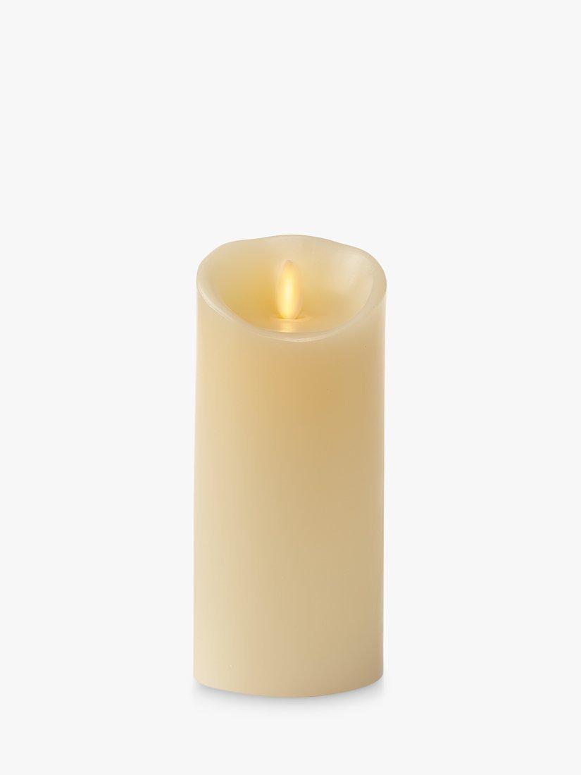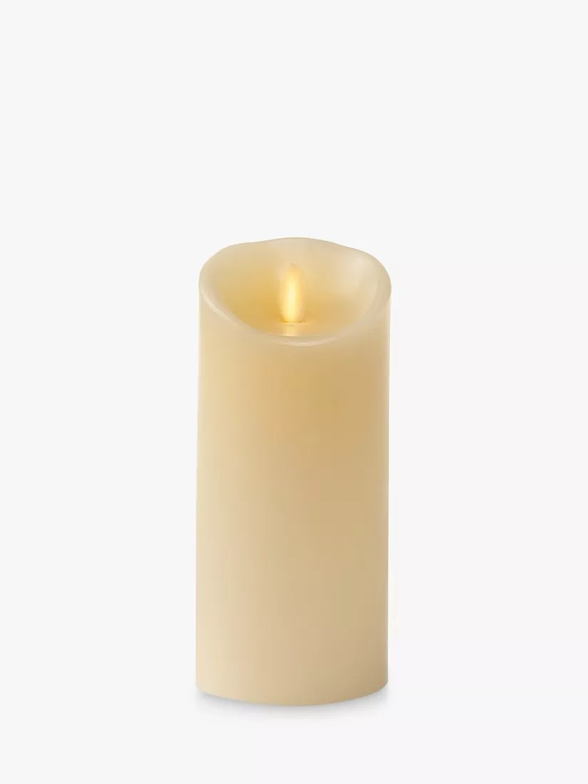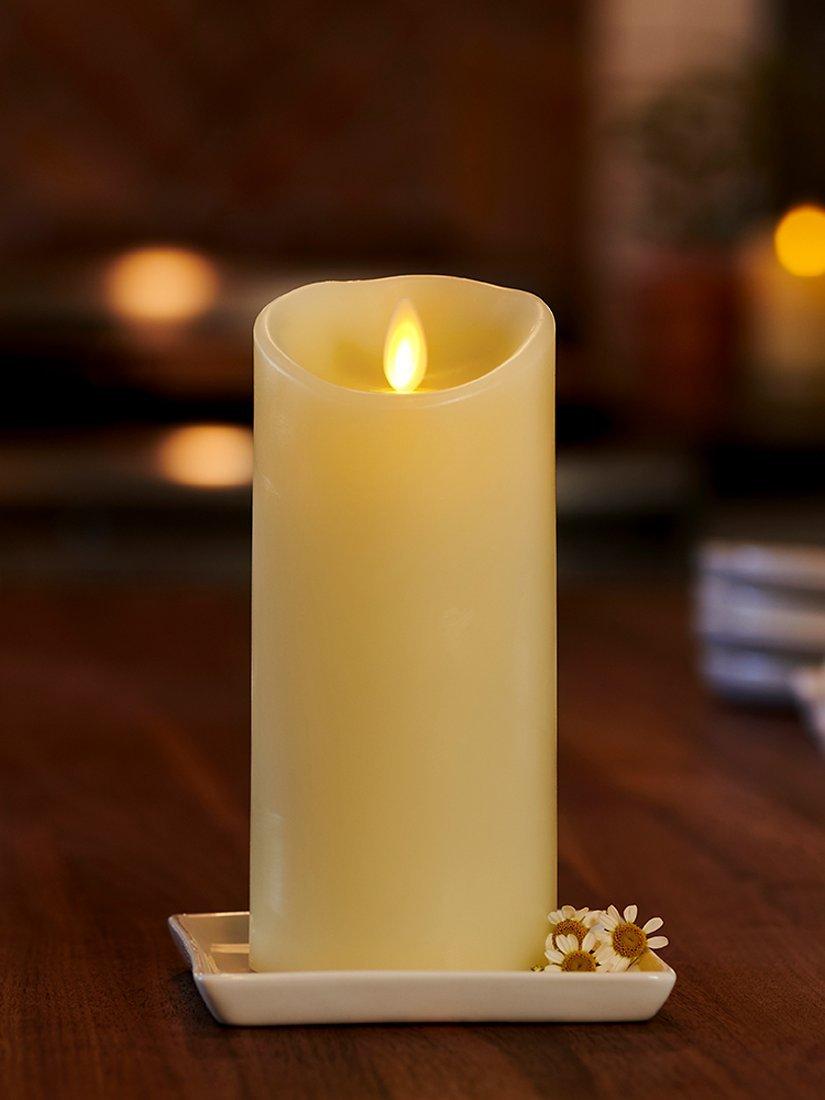 A Luminara Wax Ivory Living Flame Pillar Candle.