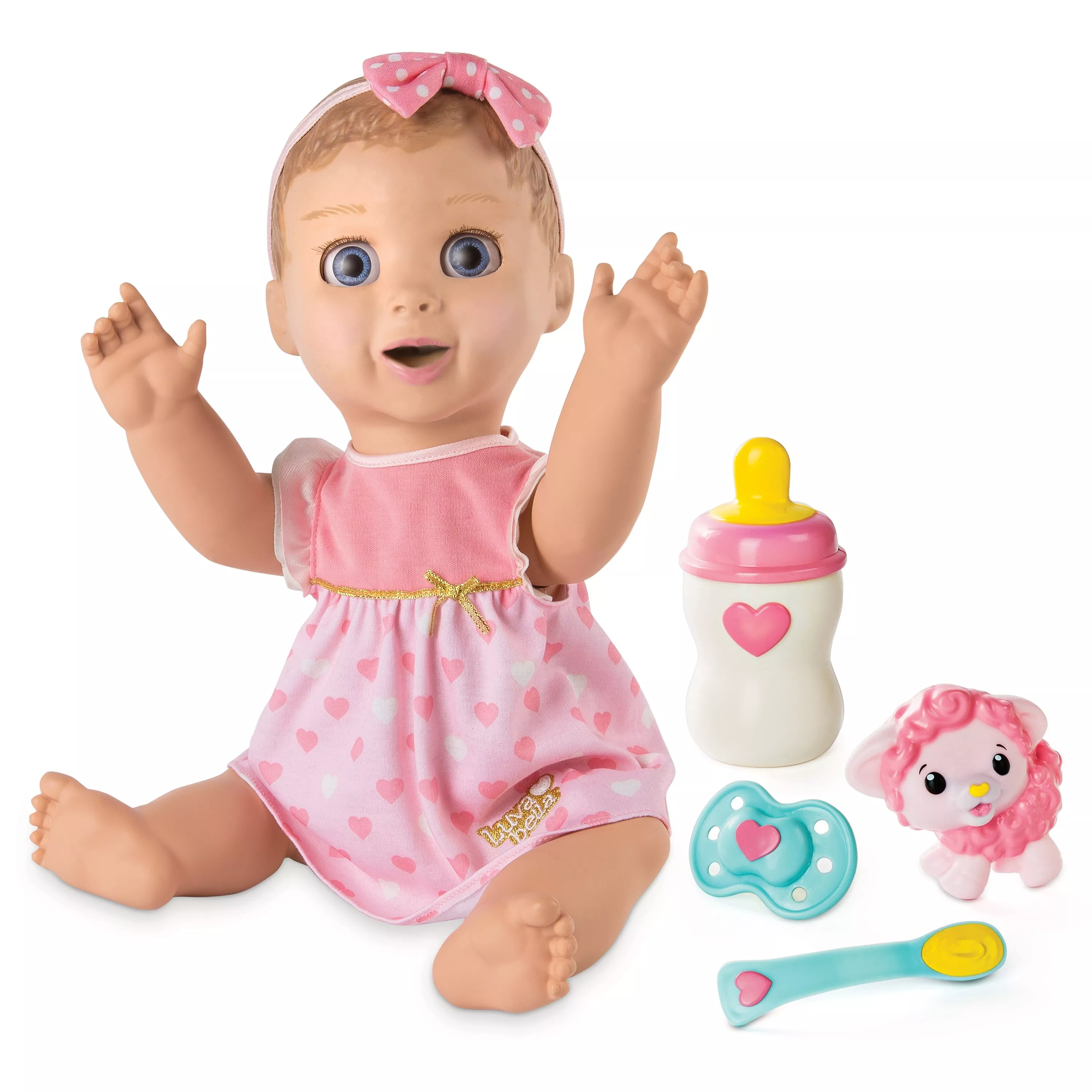 Caring for Luvabella is fun with her four interactive accessories! Use her spoon to feed her and she'll chew with delight! If she's not full, she may ask you for more. After her meal, help Luvabella learn new animal names and sounds with her Lamby toy! If she gets fussy, all she needs is her soother. When it's time to go to bed after a big day of play, lull her to sleep with her bottle.