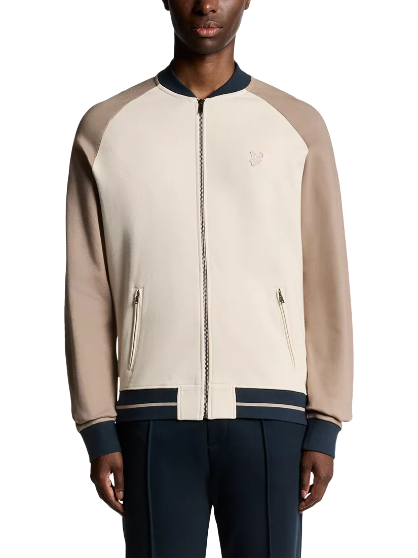 The perfect way to beat the chill, this interlock contrast raglan bomber from Lyle & Scott is made from breathable colour block cotton for all-season appeal.