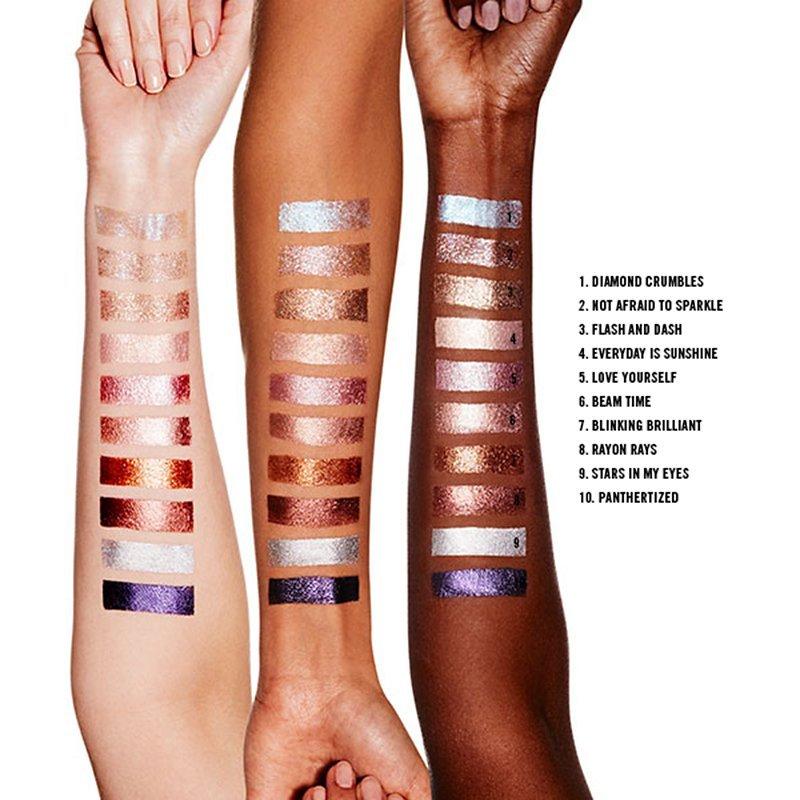 Available in a range of beaming finishes – from glaring glitter to subtle sparkle and cool chrome – this ultra-shiny liquid eye shadow glides across lids for a wash of brilliant colour that keeps its splendour.