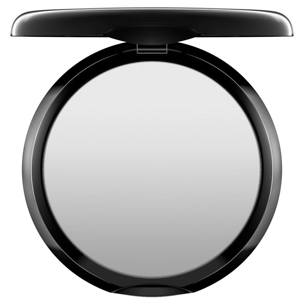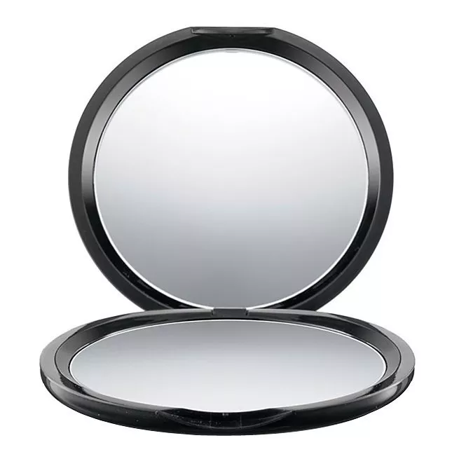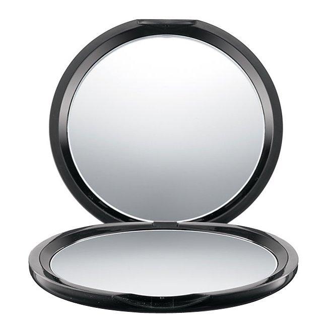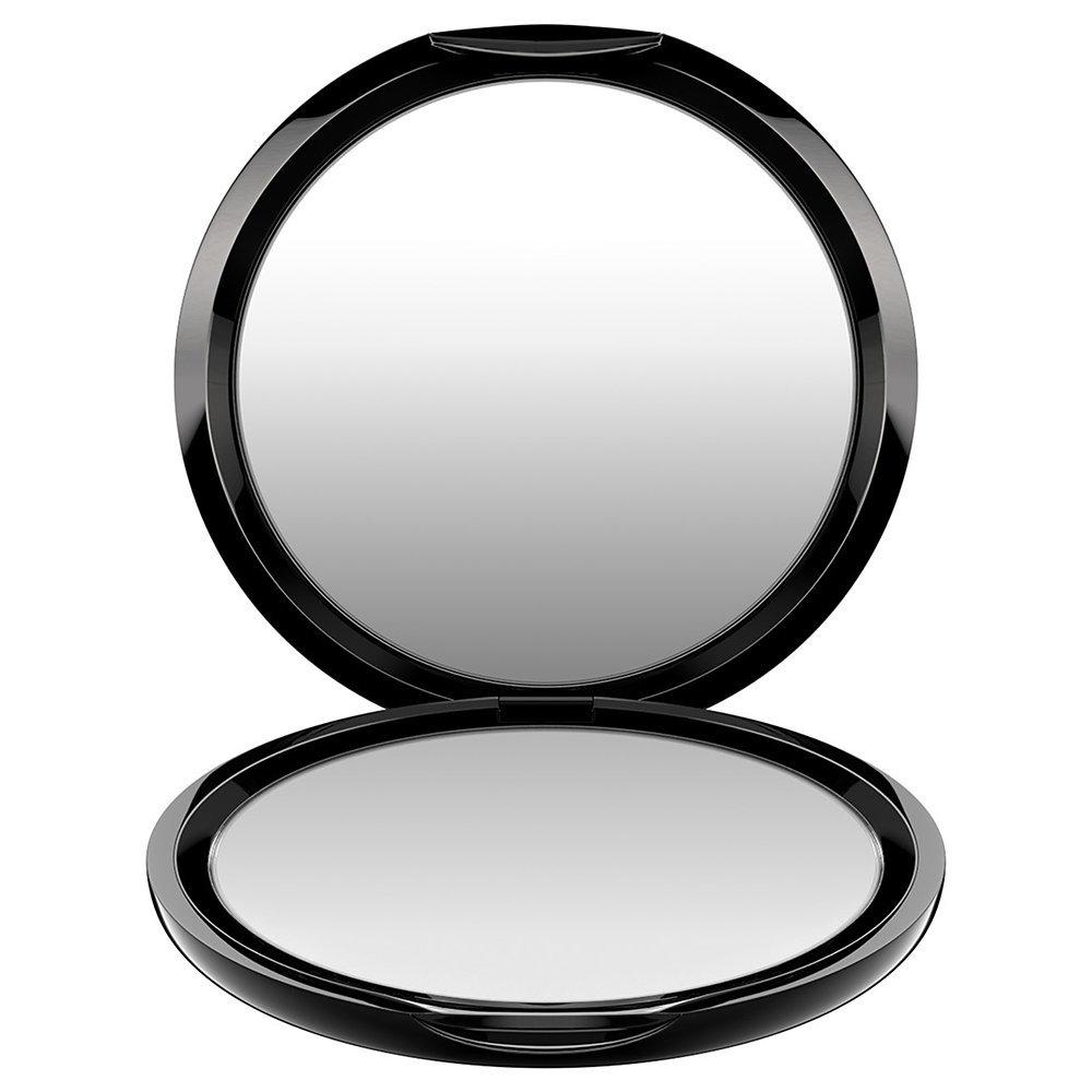 A slim, glossy MAC black round compact featuring two mirrors. One side magnifies for close-ups, the other provides a standard true-to-life image.