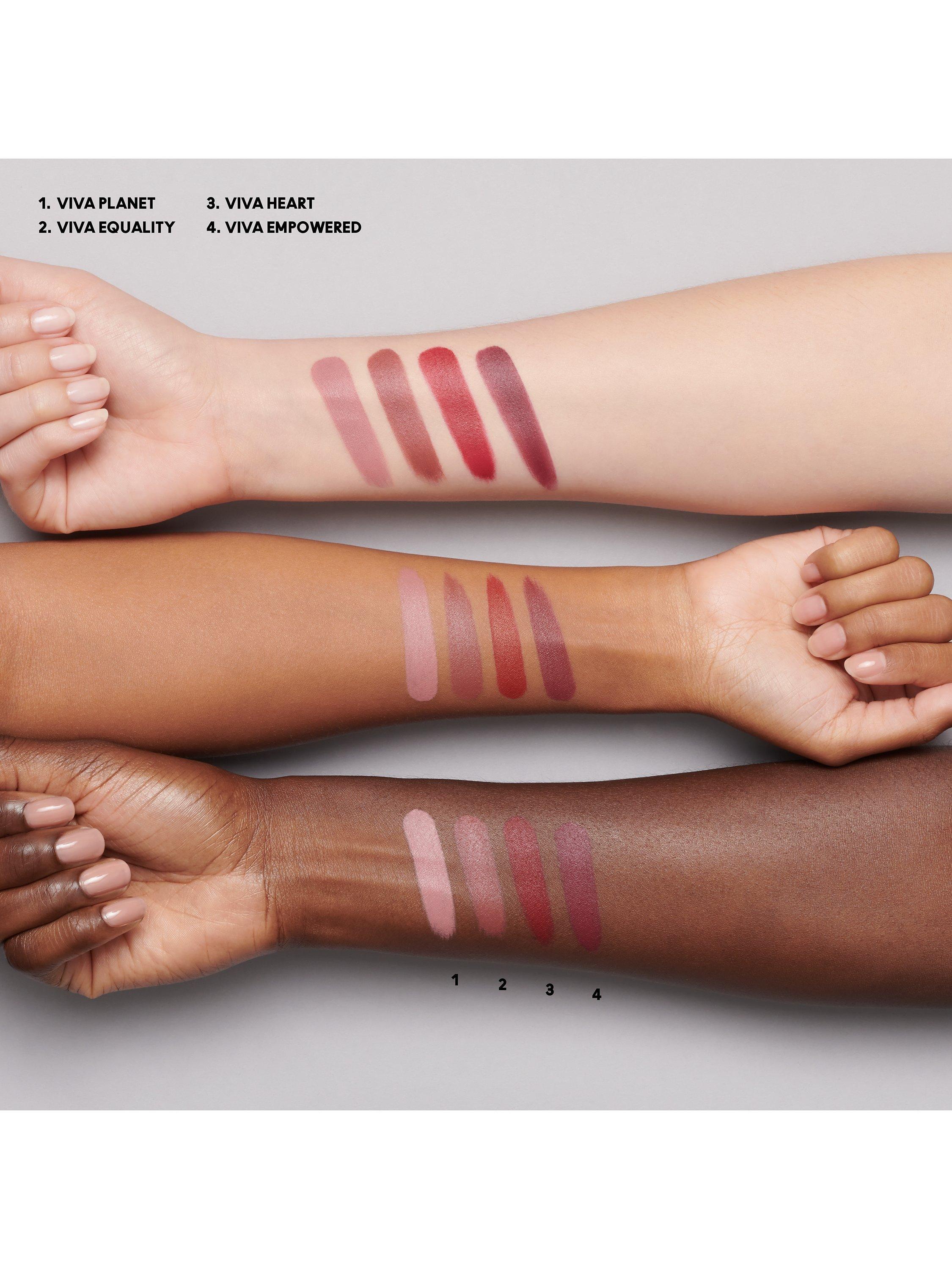 Intense brownish blue-red shade Viva Glam I is now Viva Heart. Subdued pinkish-beige mauve shade Viva Glam II is now Viva Planet. Muted brownish-plum shade Viva Glam III is now Viva Empowered. Deep neutral shade Viva Equality is brand new!