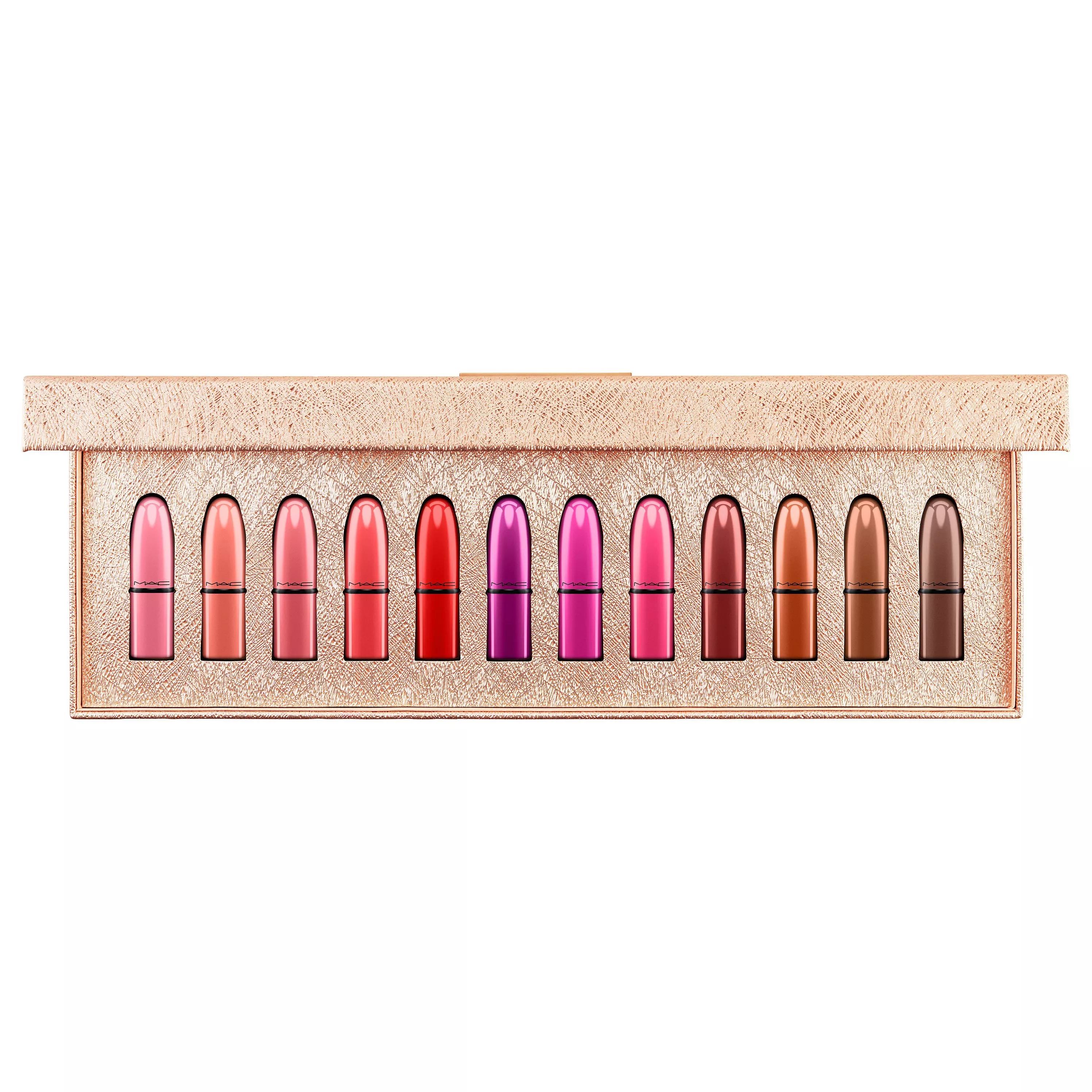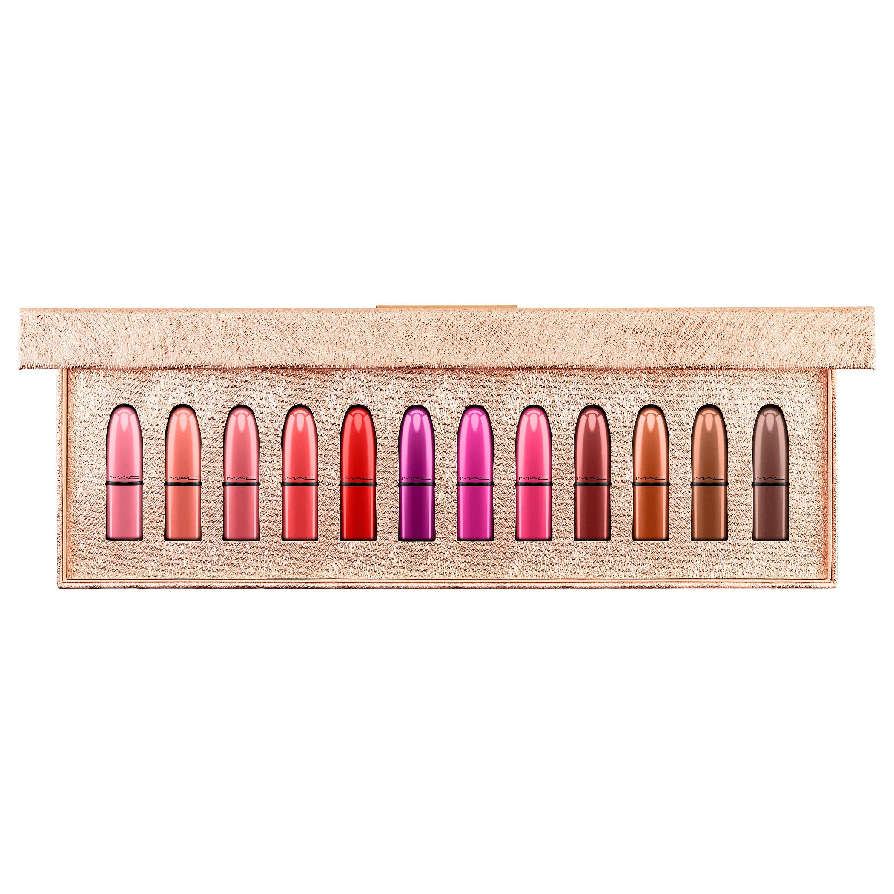 Small stunning Lipsticks, all bundled up for an extravagant night out. Steal every heart at the party in MAC Classics, a kit of 12 crowd-favourite mini Lipsticks, each in colour-matched special deco.
