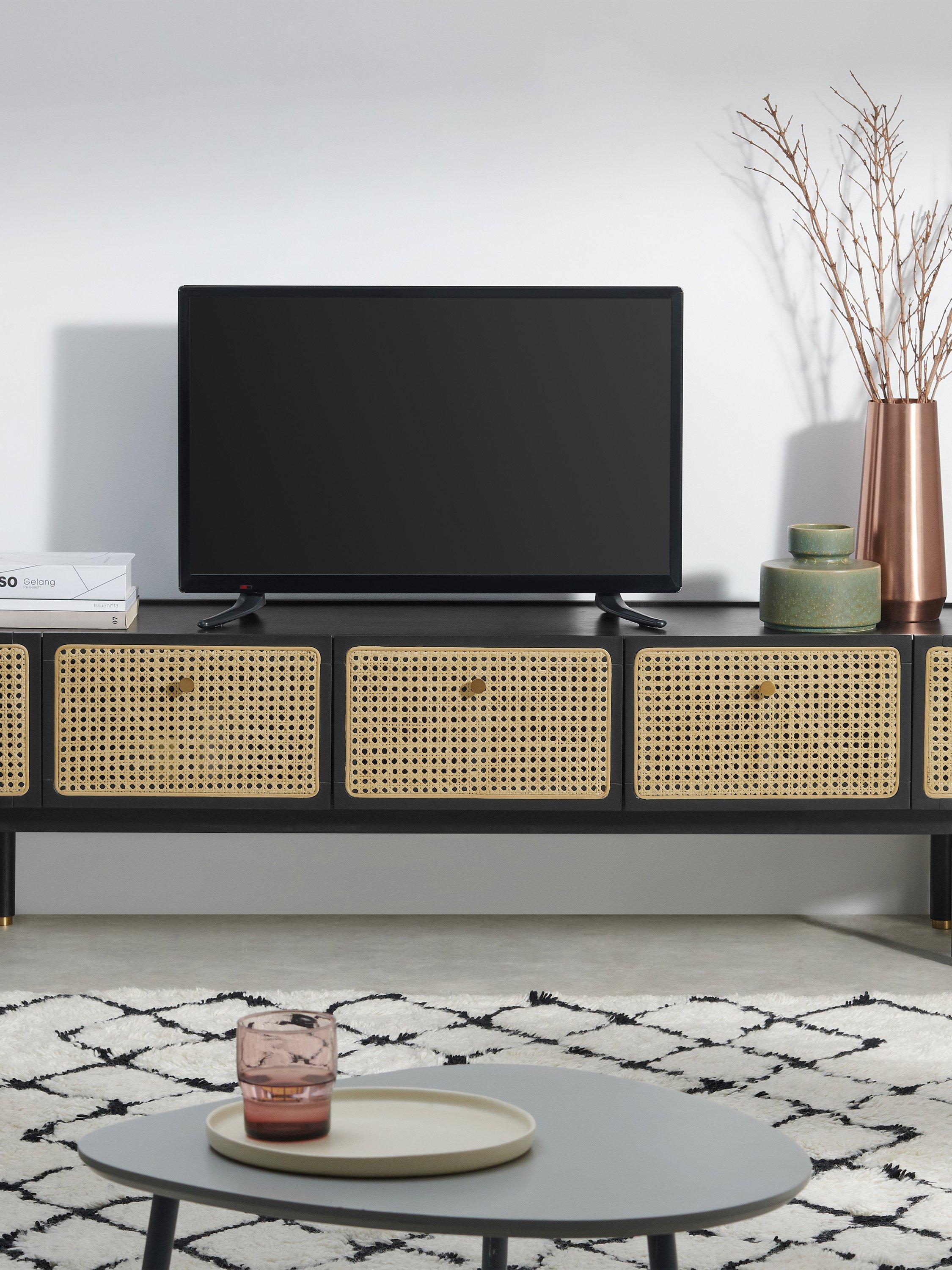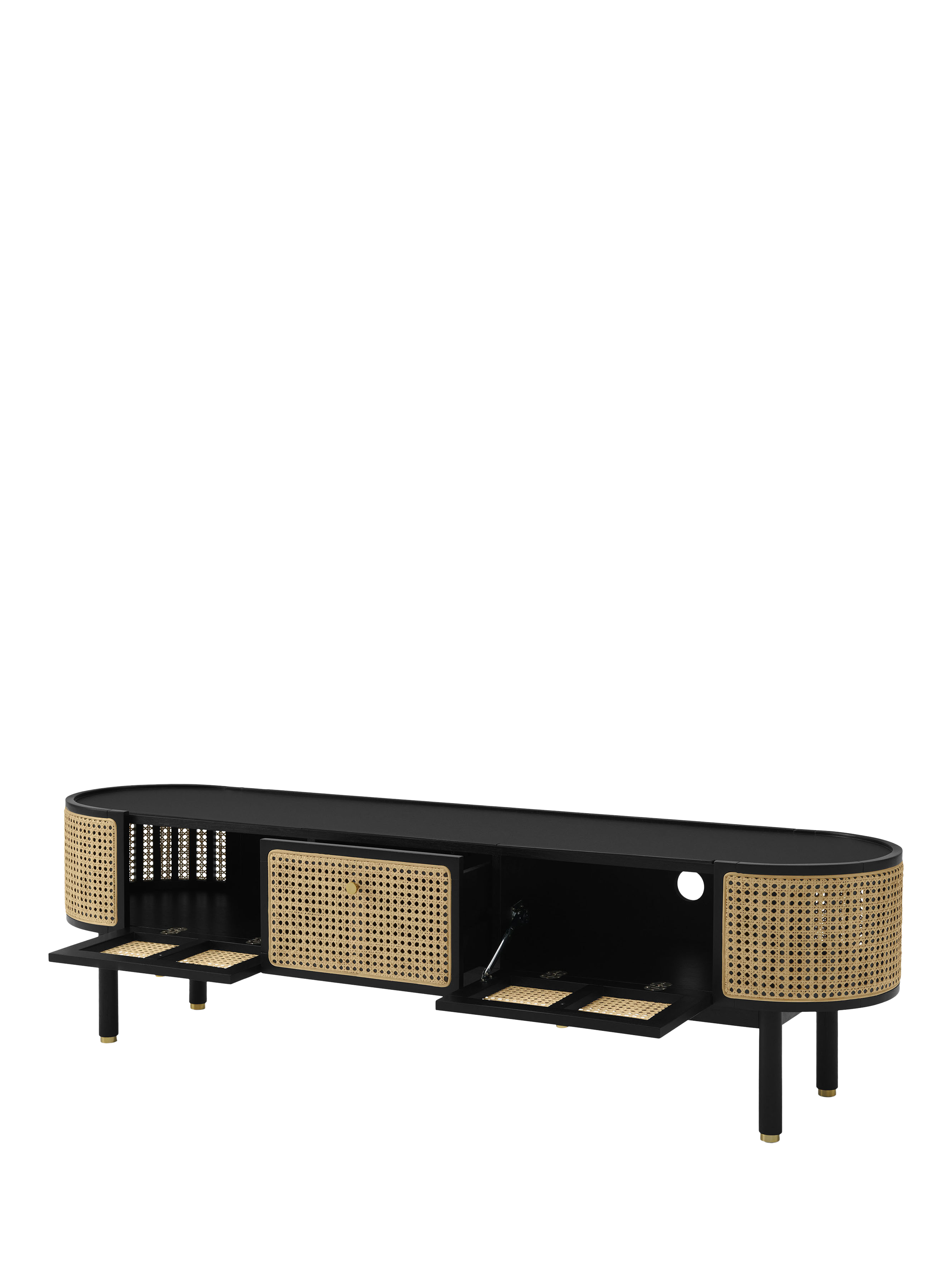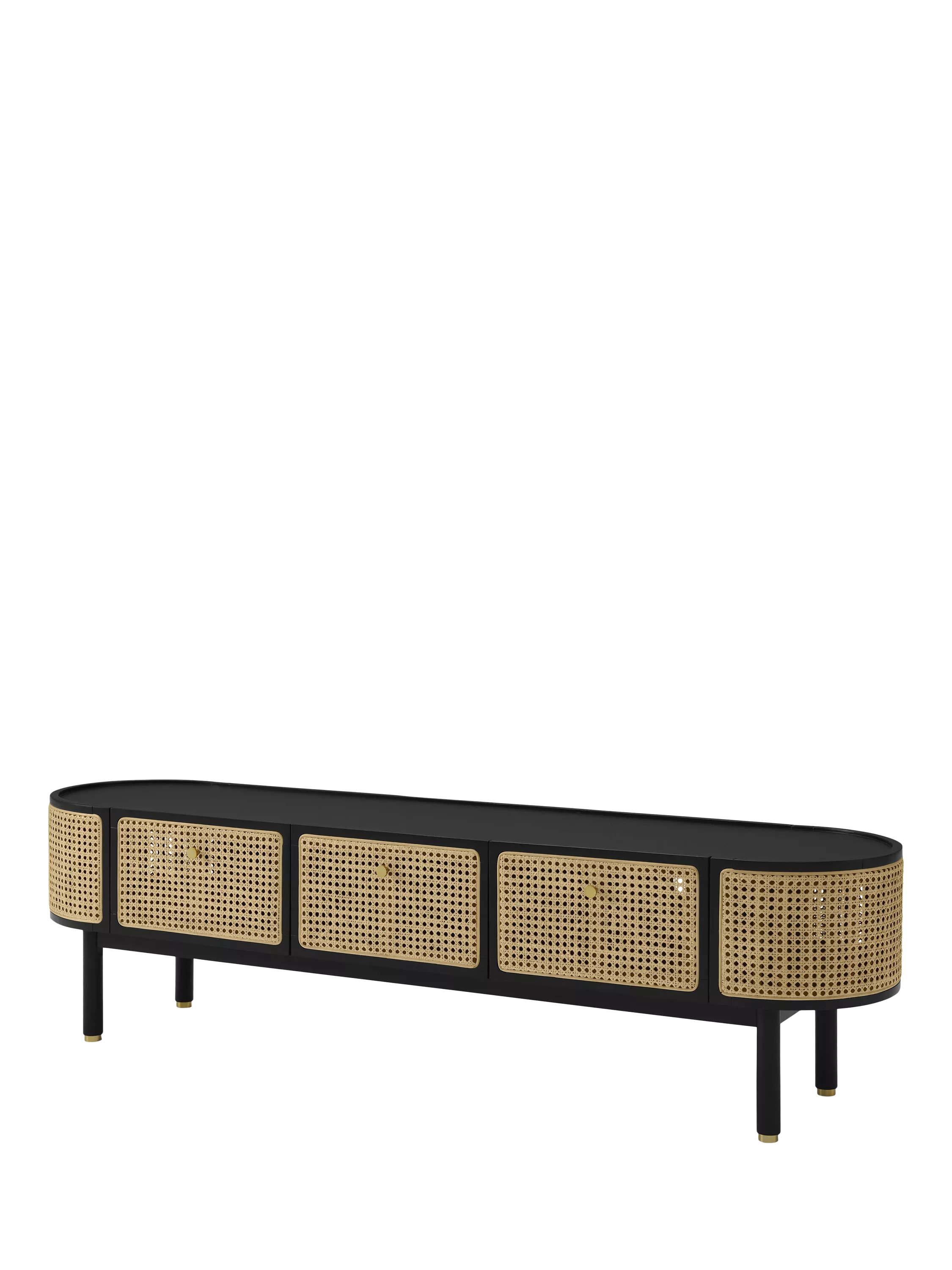 This TV unit's unique, curved capsule-shape feels warm and welcoming. It's built from oak in a black stain, with rattan detail all around enhancing its opulent, Nordic-inspired design. And there's plenty of storage space available for media consoles, too.