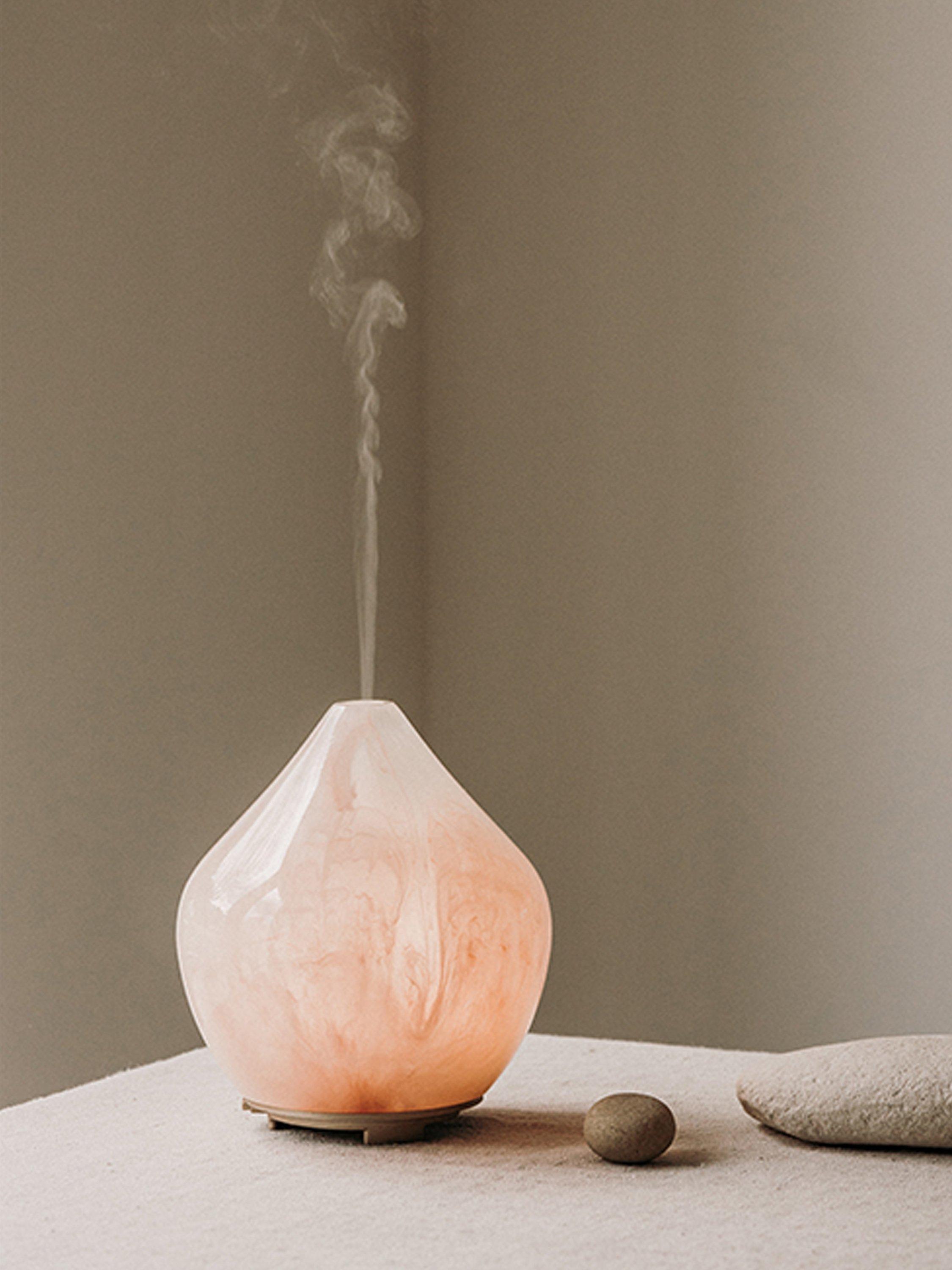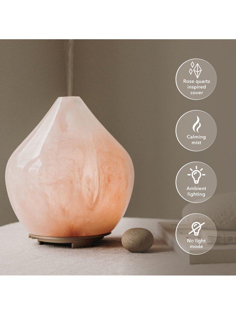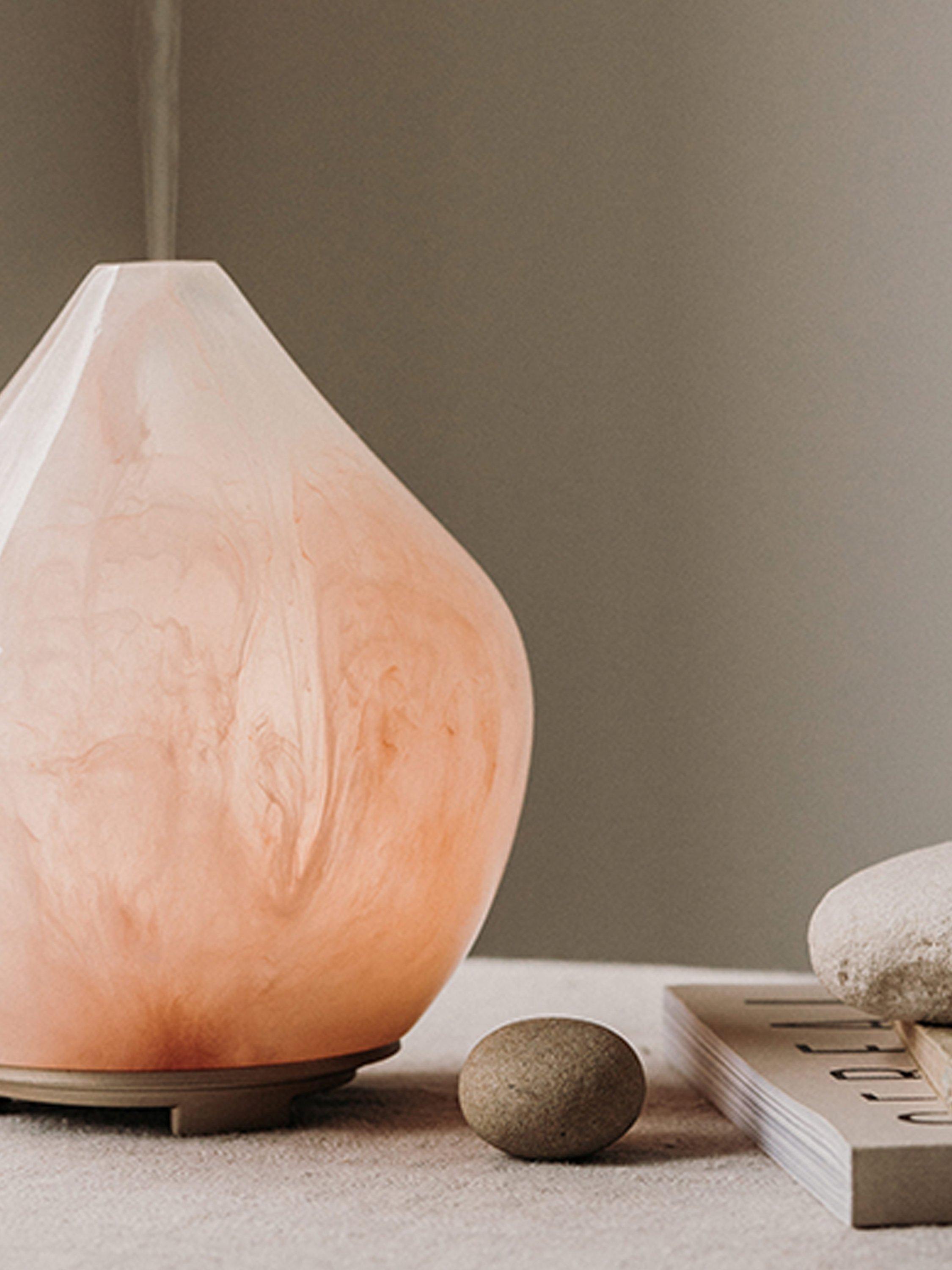 The Gem Aroma Diffuser, inspired by Rose Quartz, is crafted to resemble the stone of unconditional love, using polyresin that shines like a polished gemstone. Each diffuser features a unique marbled pattern of dusky pink, taking inspiration from nature.