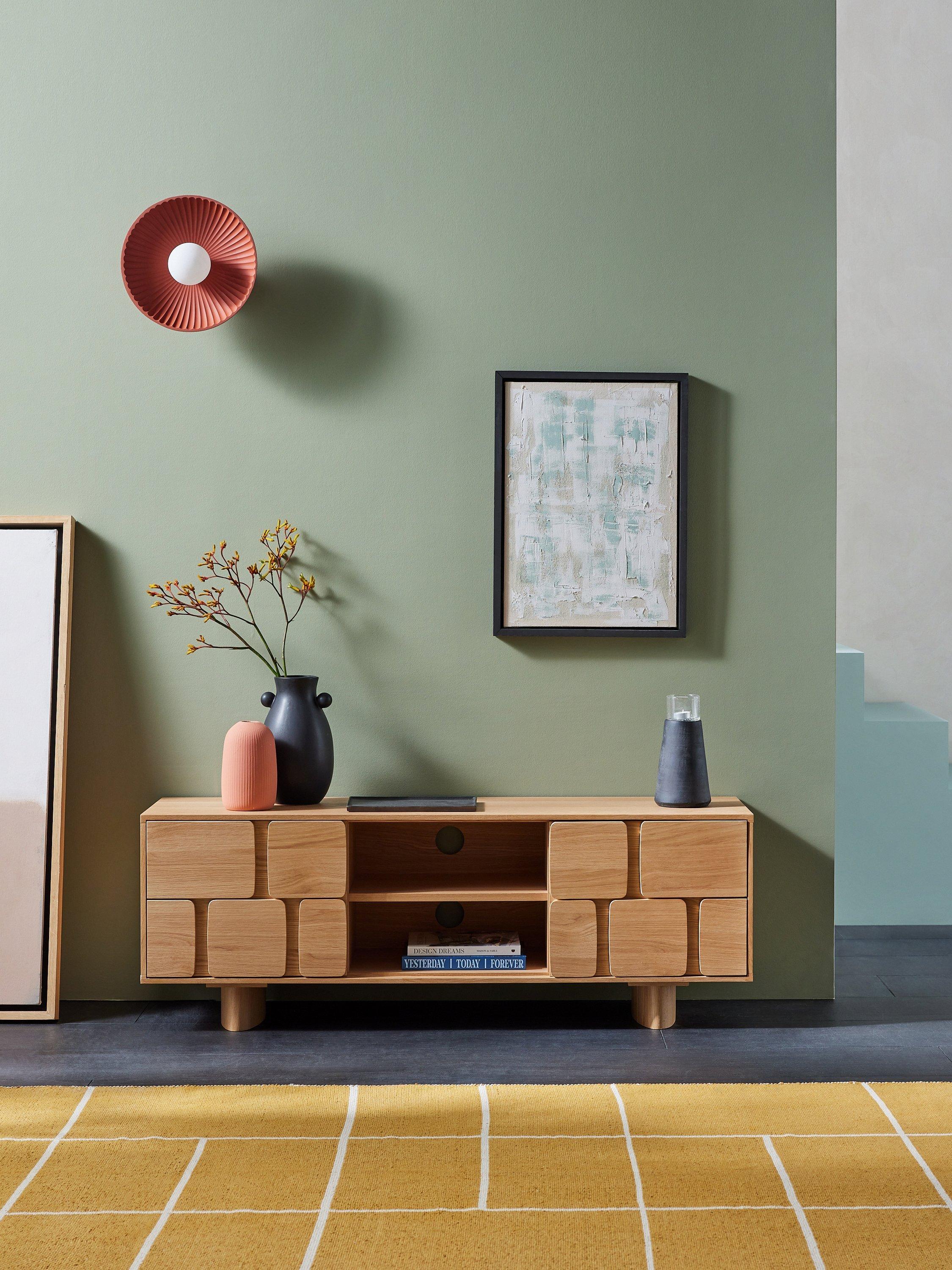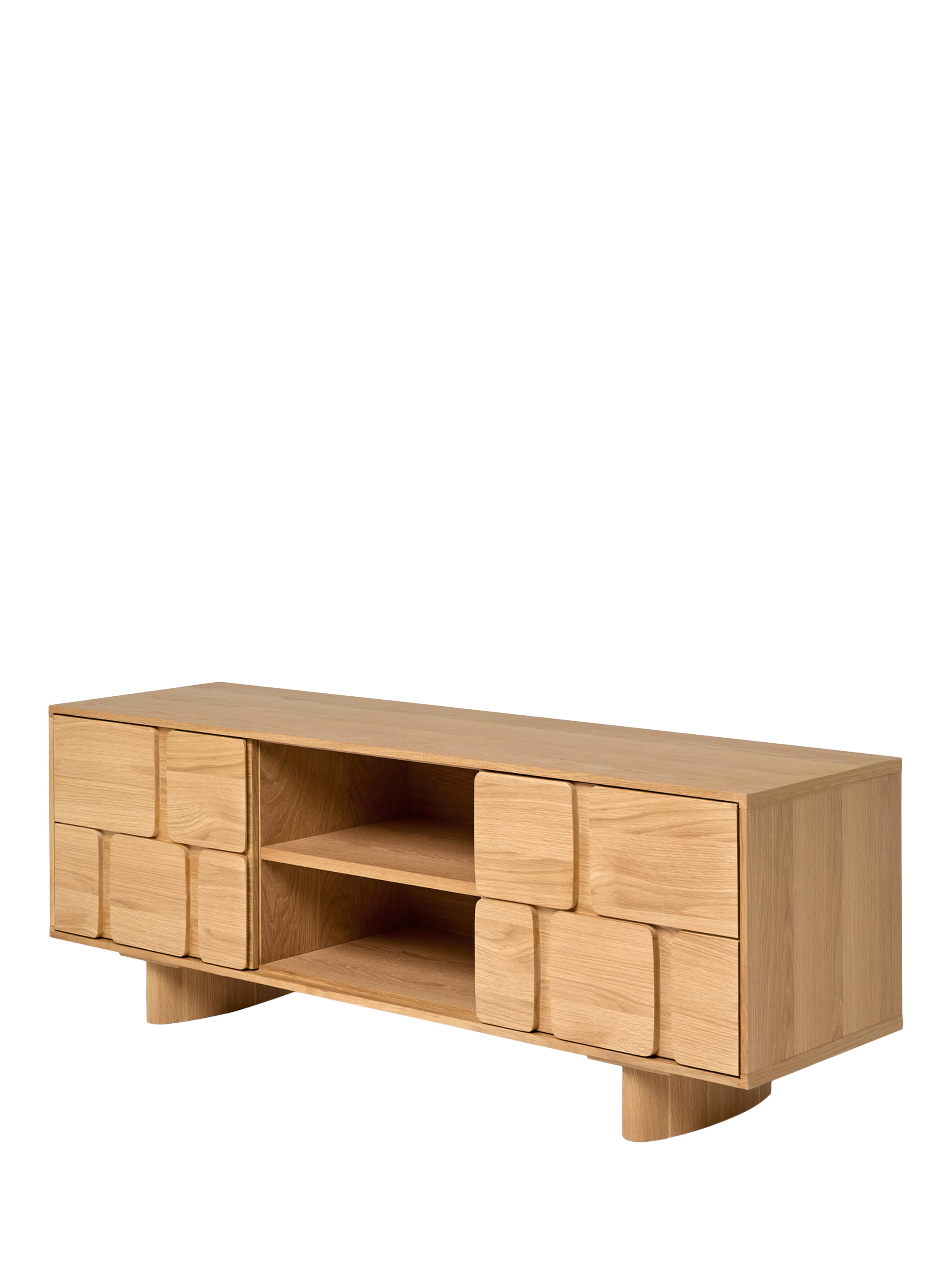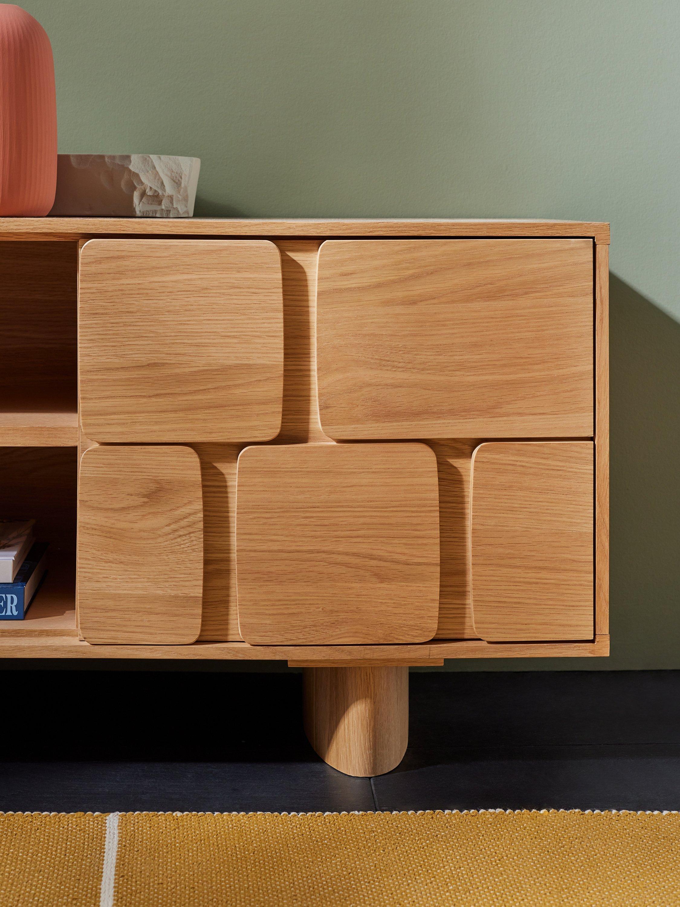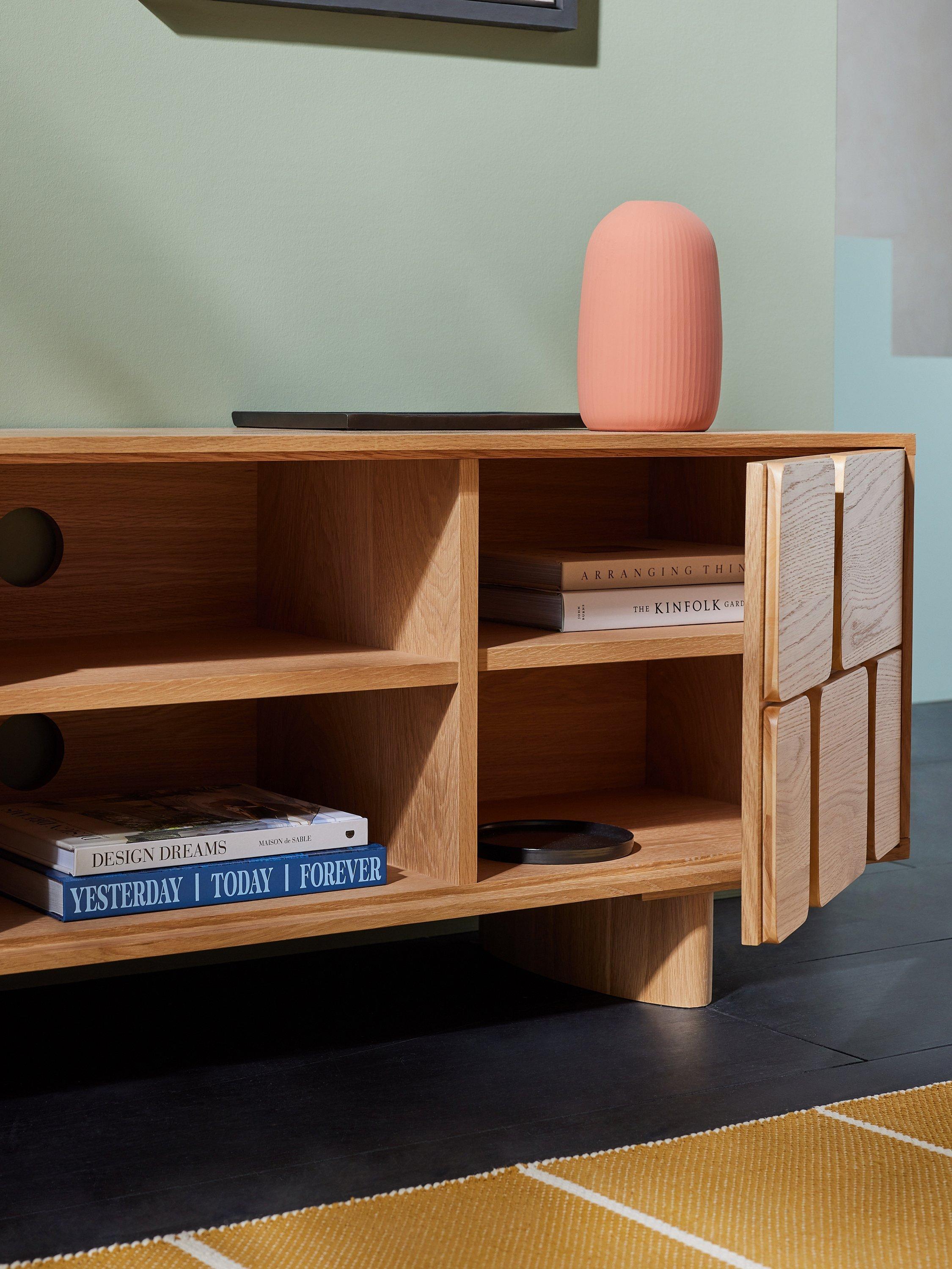 Made from solid oak and oak veneer, Cory has panel details, 2 doors, an internal shelf, cable management and can accommodate a TV up to 55".