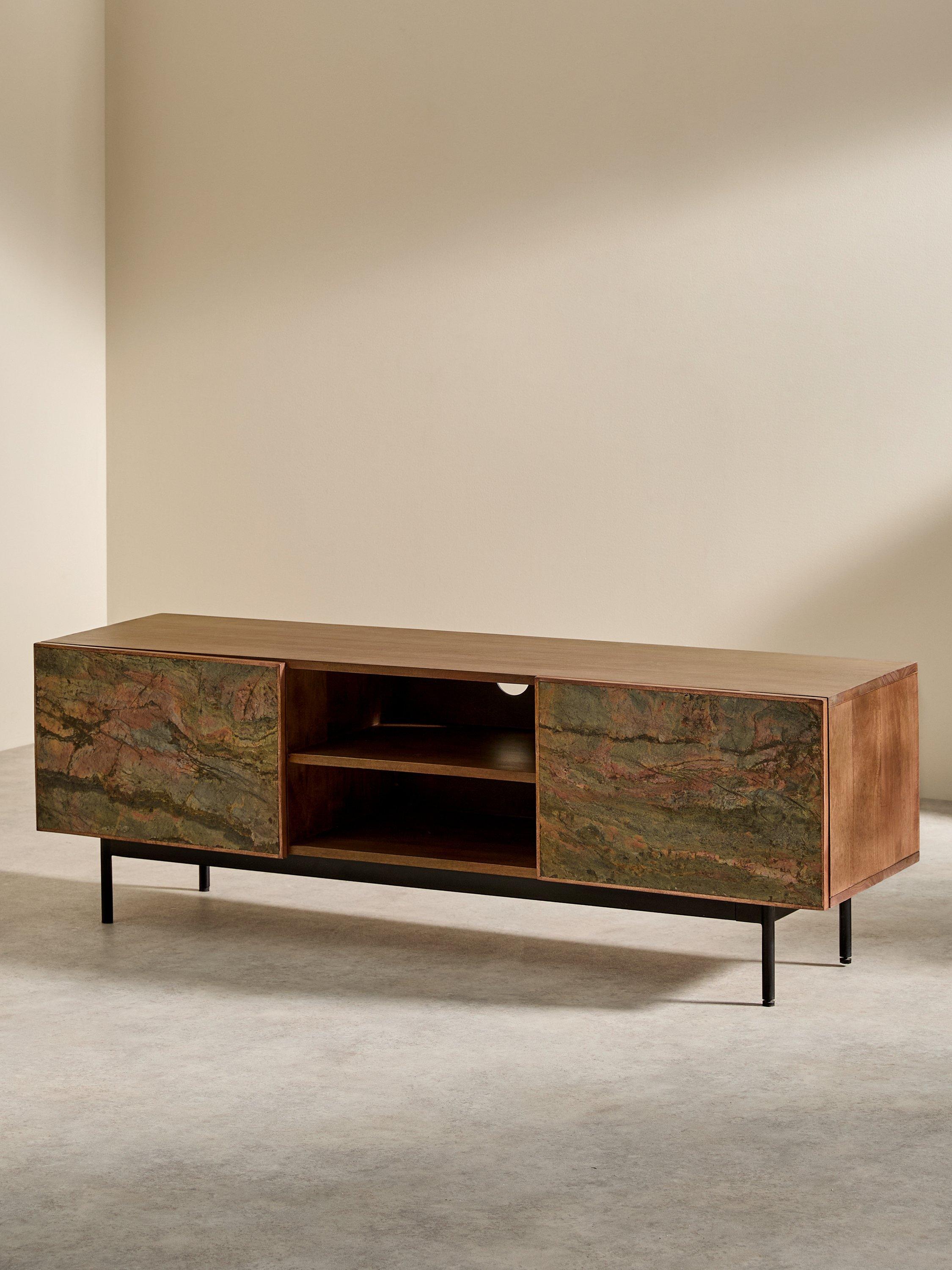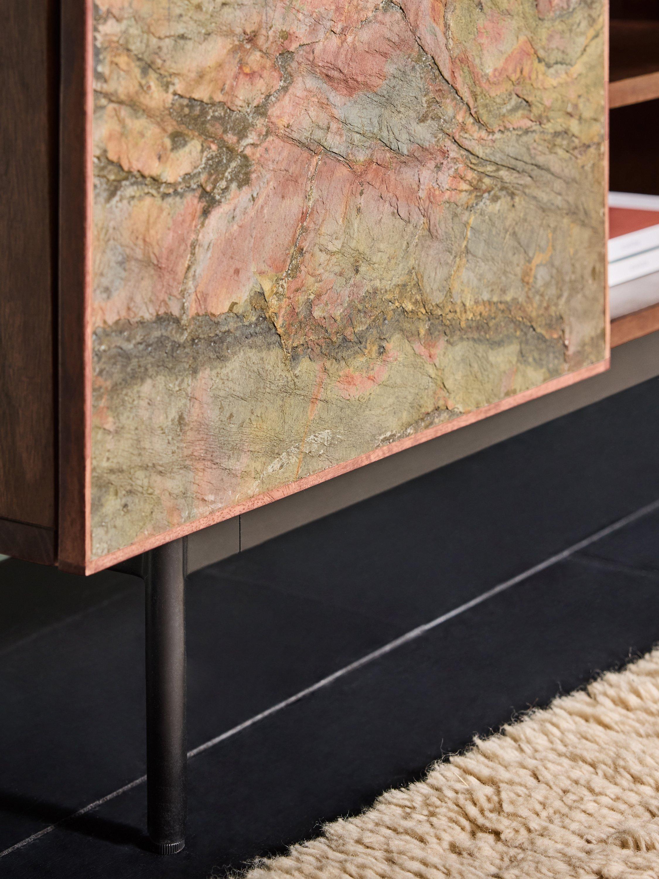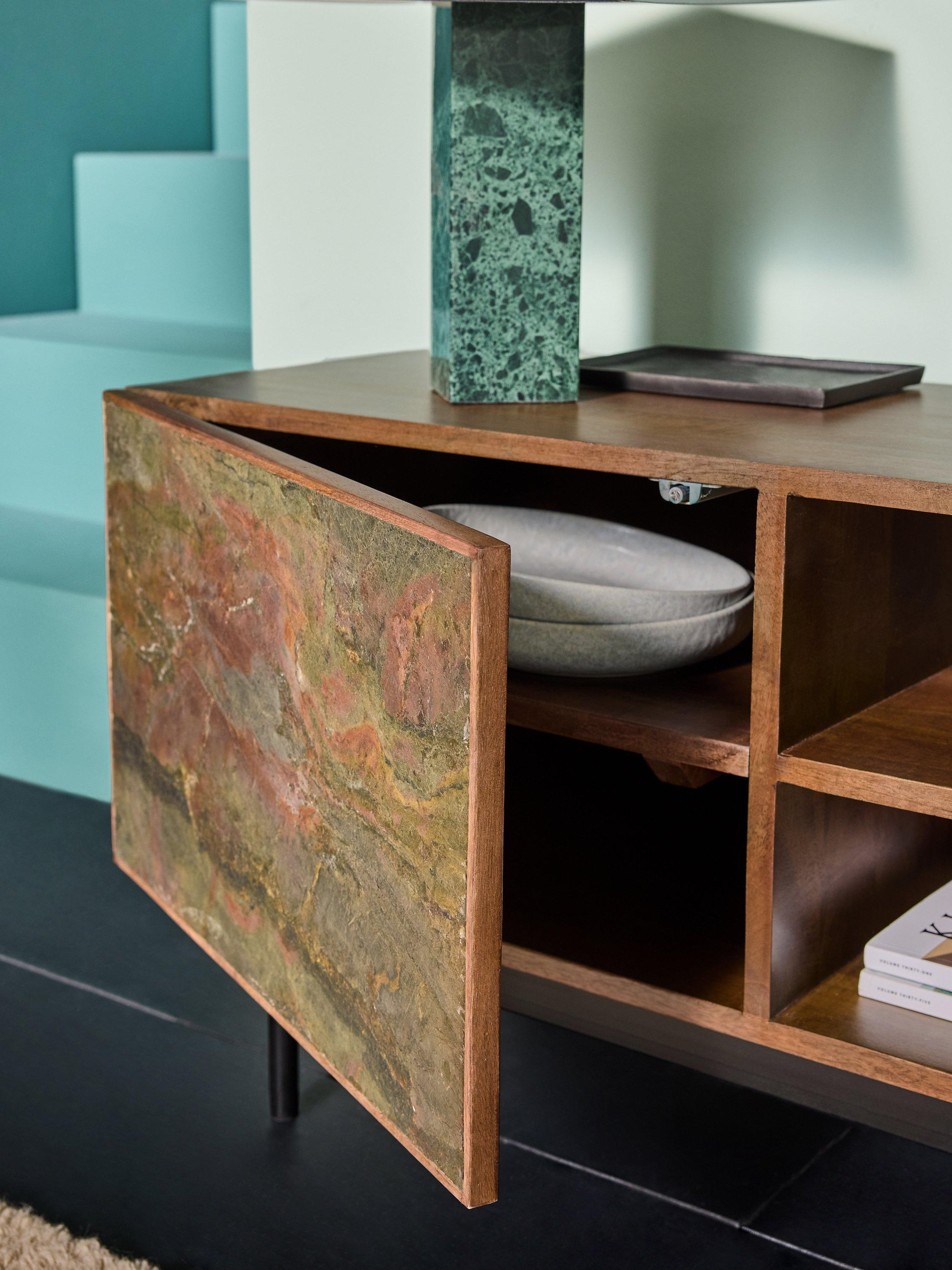 From the stone veneer door fronts to the raised legs, this media storage unit is sophisticated and stylish.