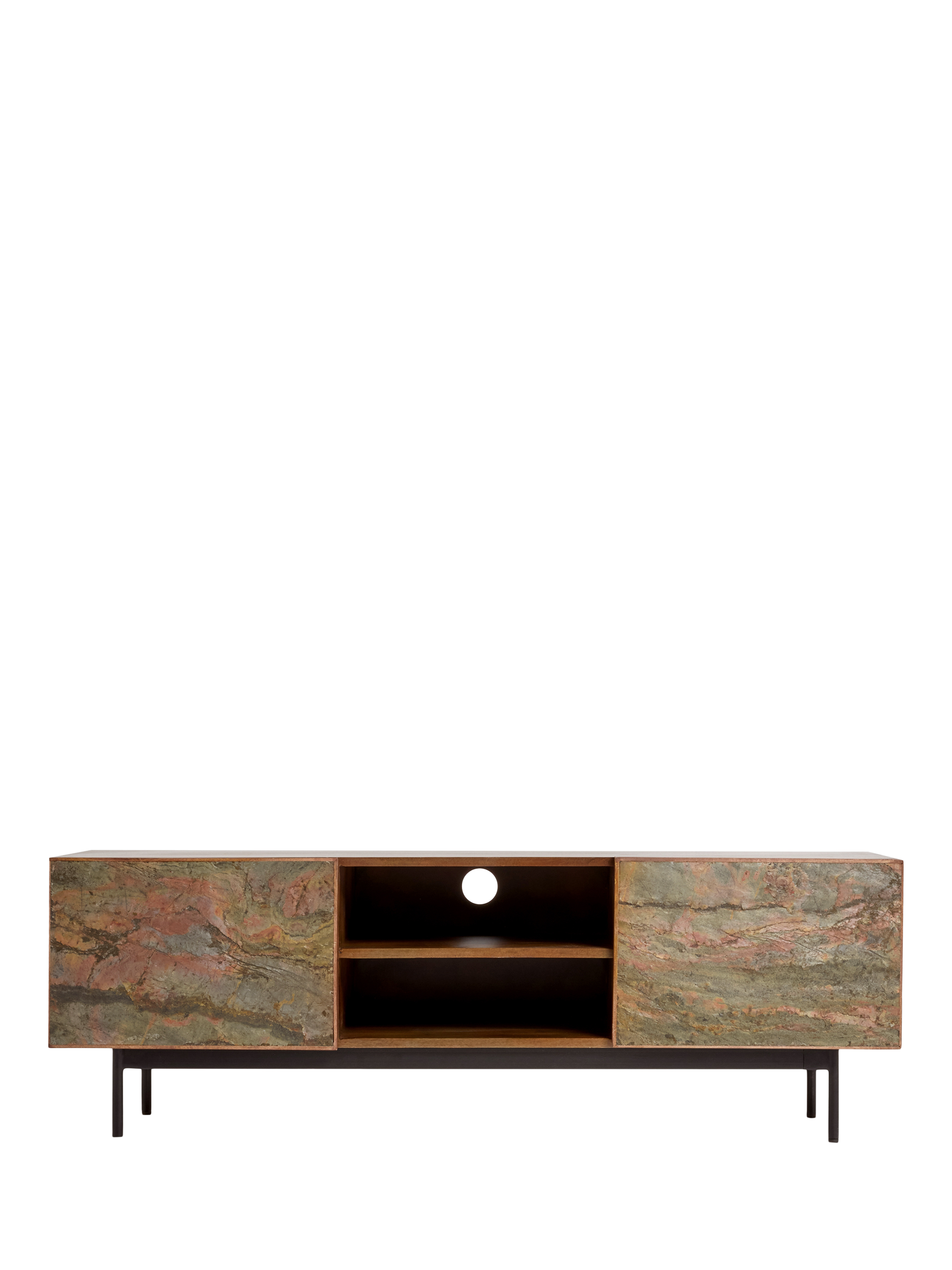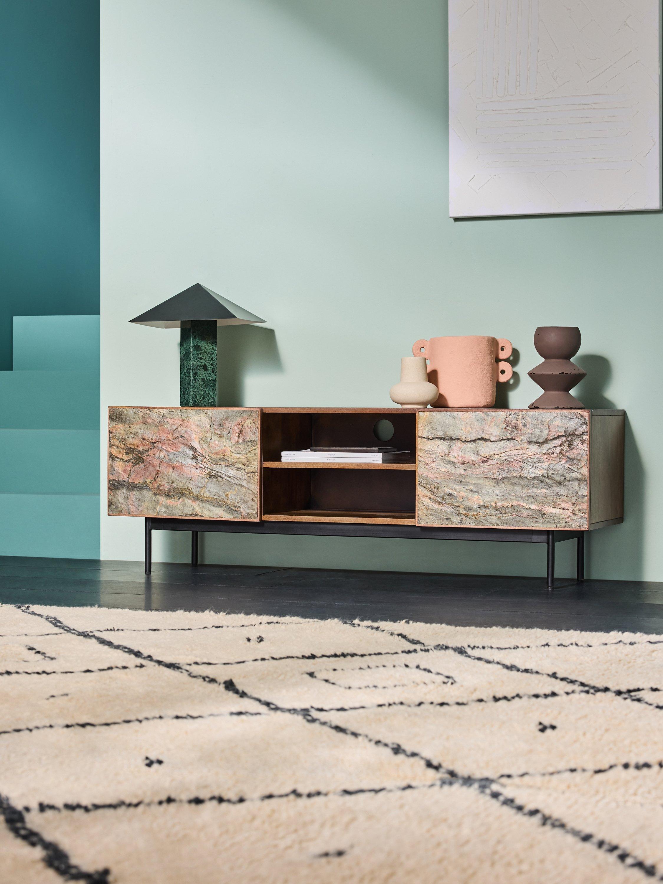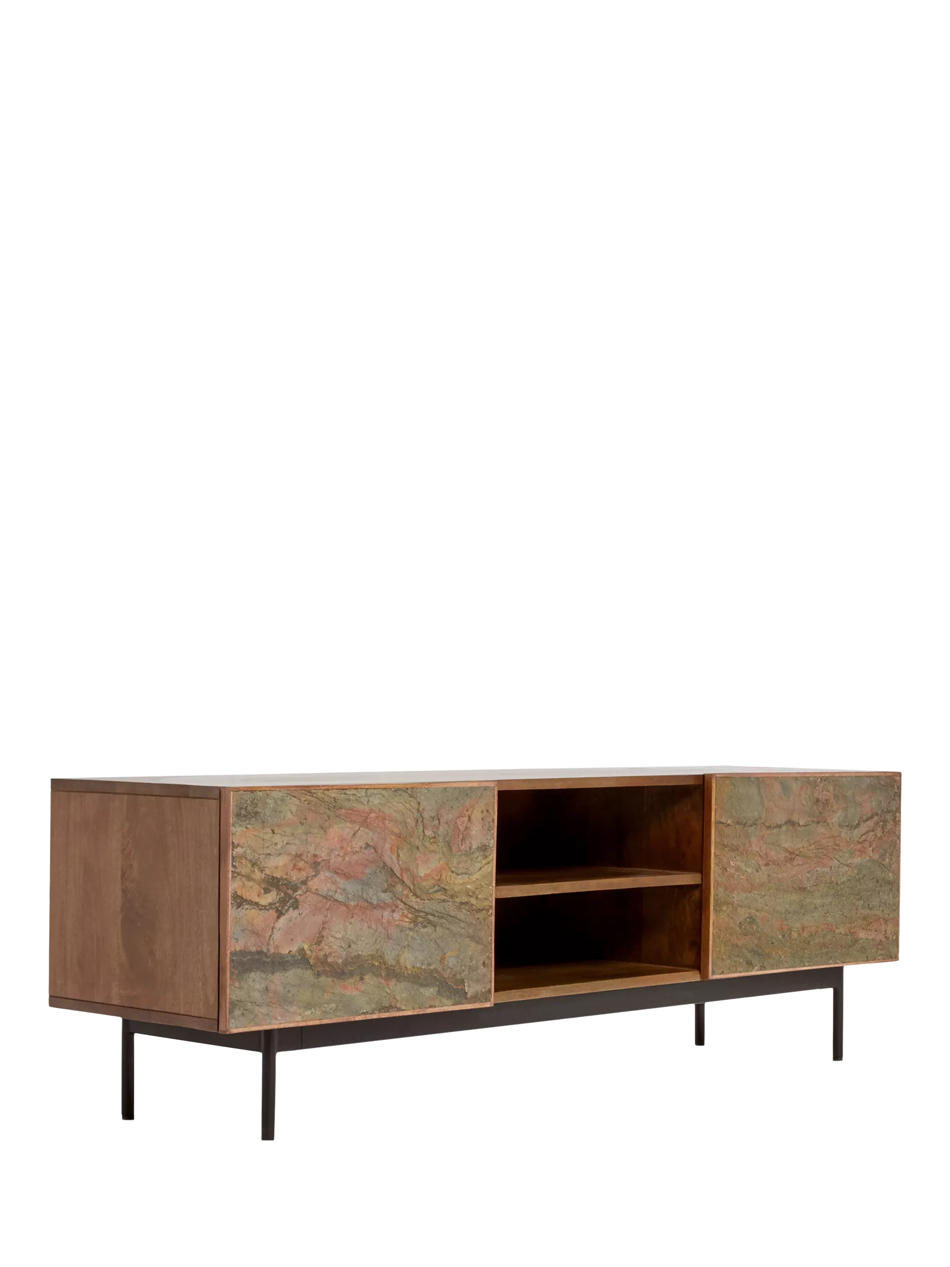 From the stone veneer door fronts to the raised legs, this media storage unit is sophisticated and stylish.