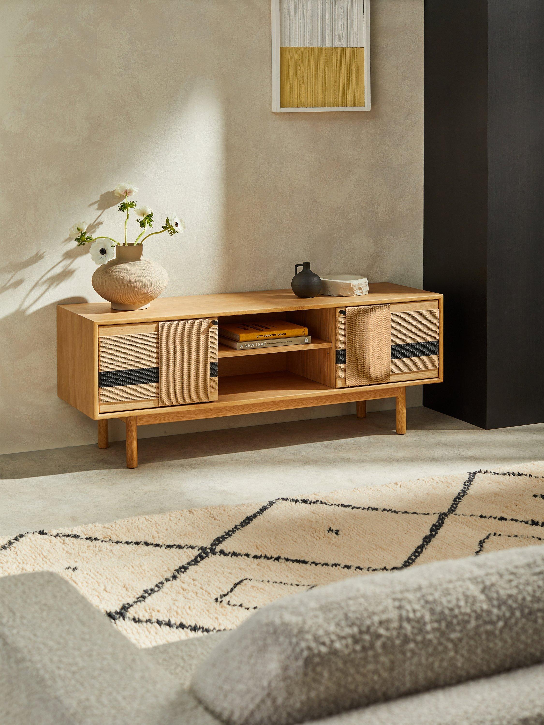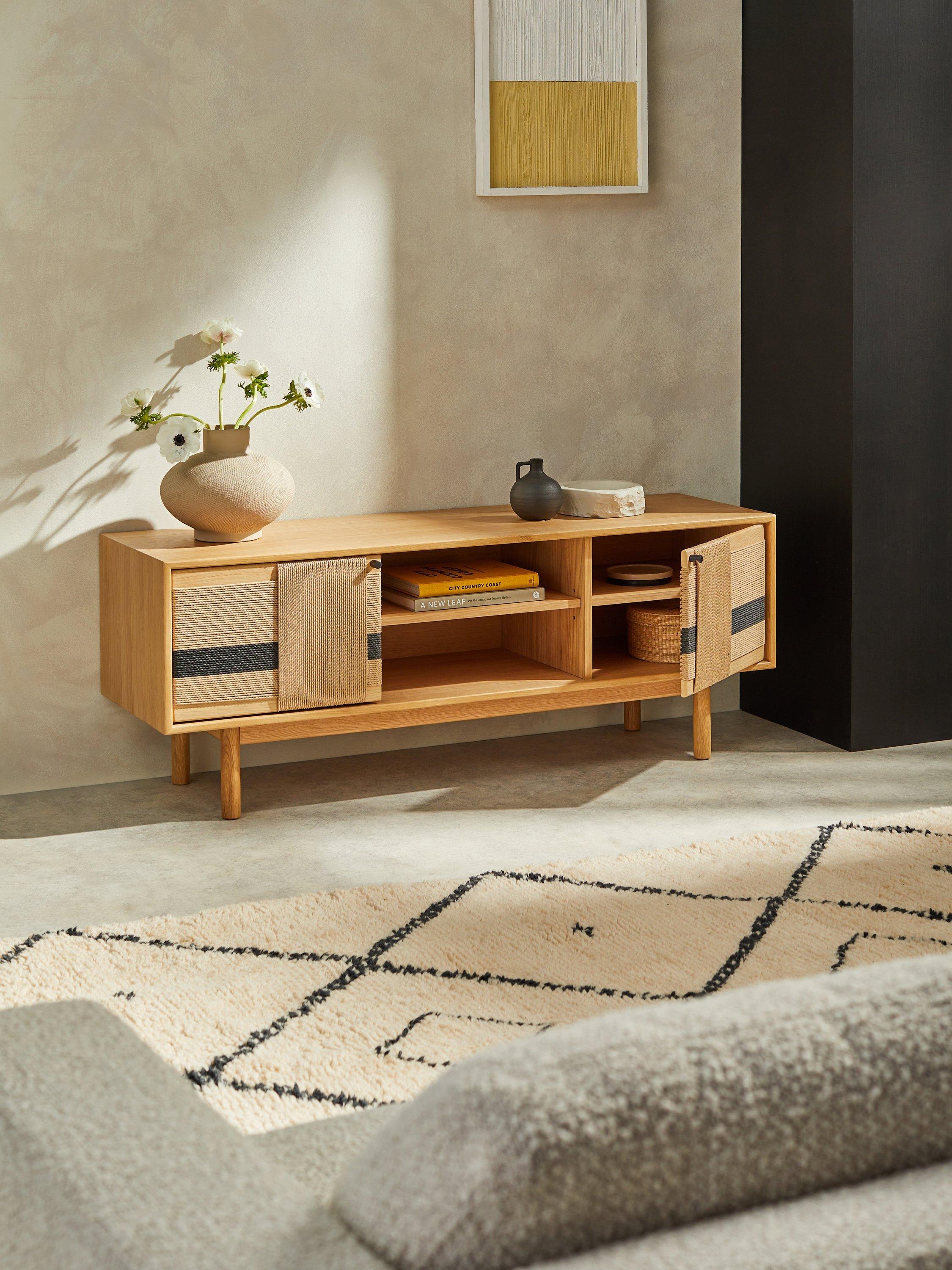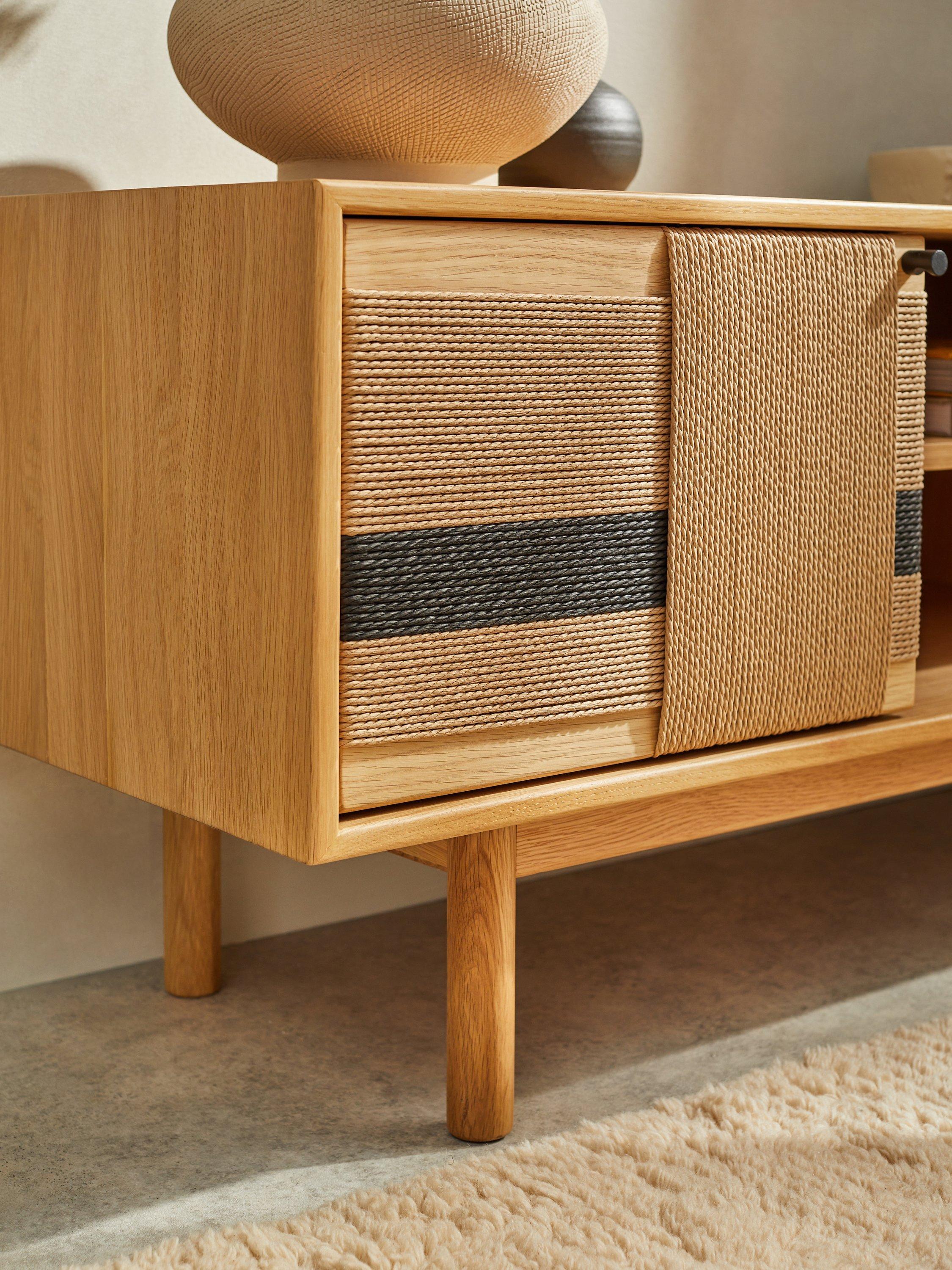 This distinctive media unit from MADE is built with a solid oak frame and features eye-catching woven detail on each of the doors. This mix of materials will add interest and tactile depth to your living room, and there's also space available for consoles in the central open shelf section.