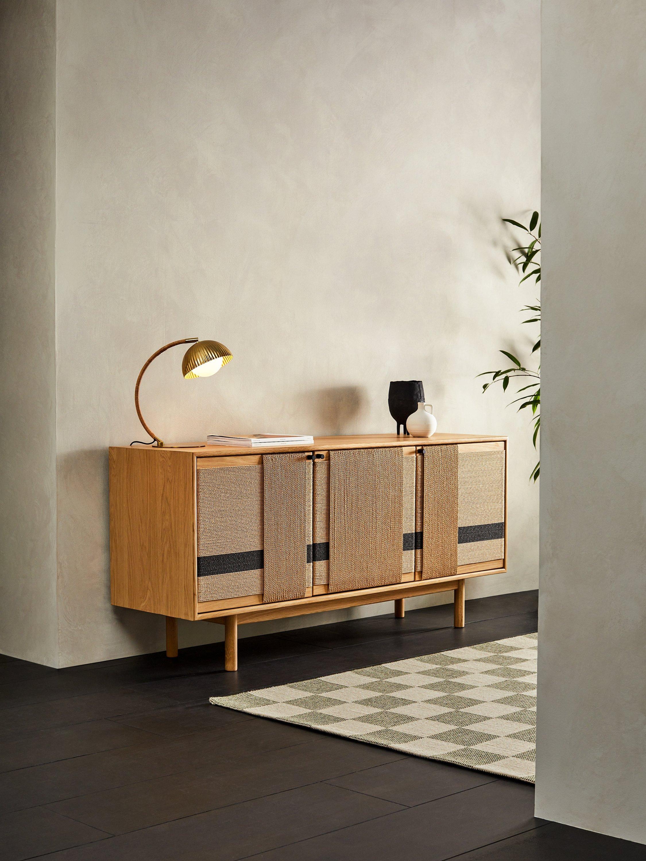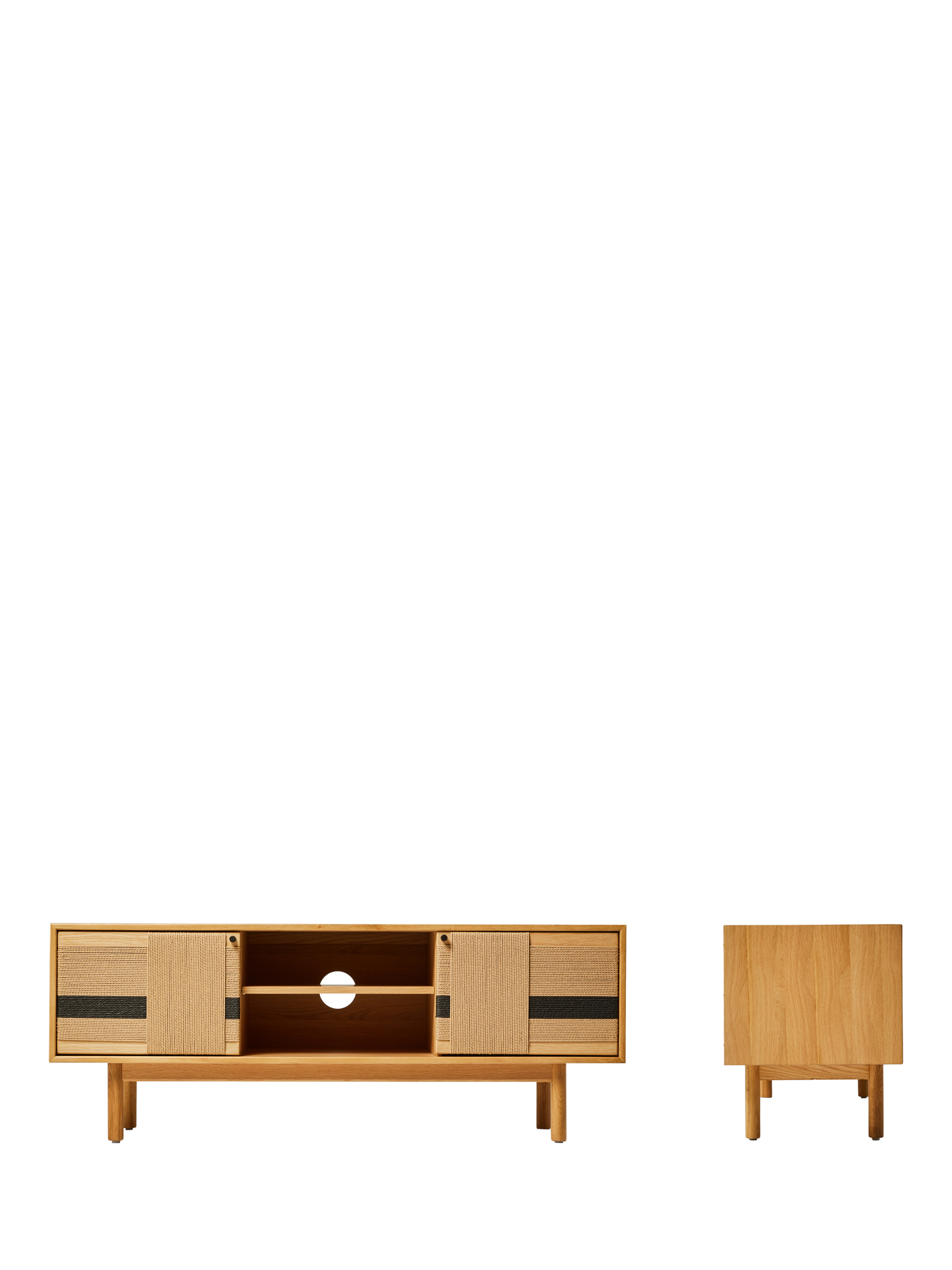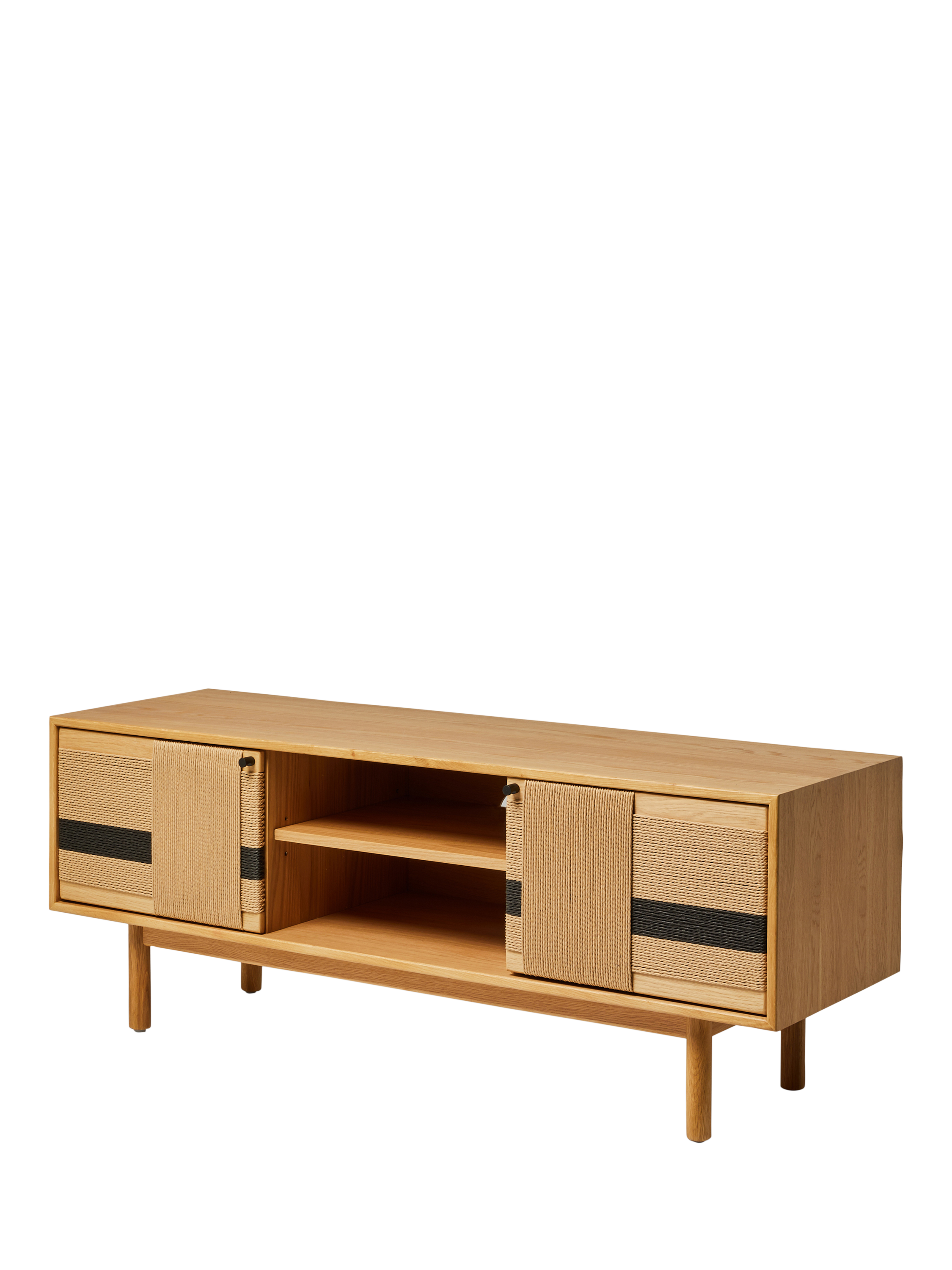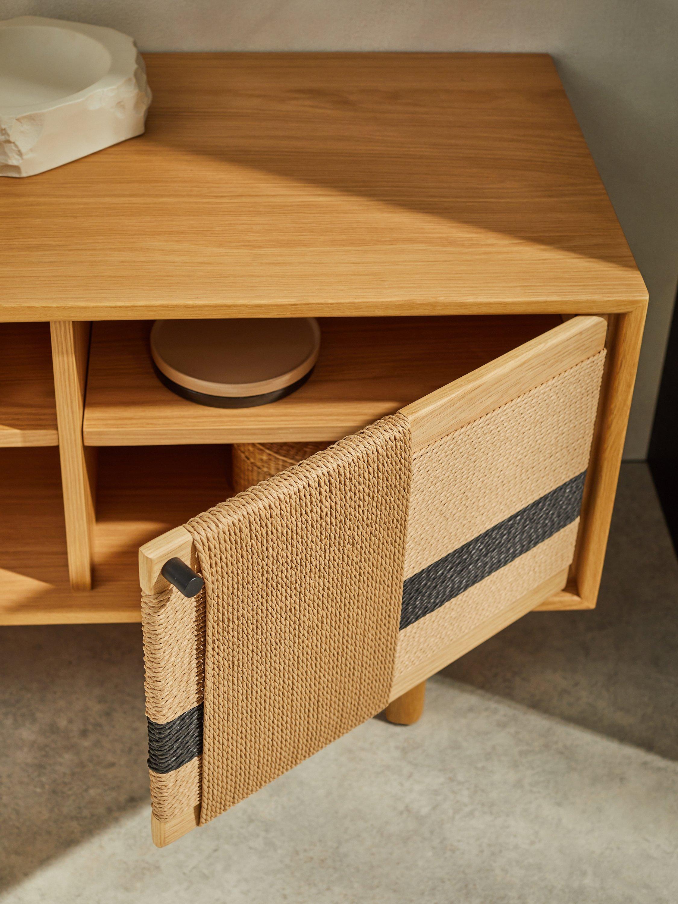 This distinctive media unit from MADE is built with a solid oak frame and features eye-catching woven detail on each of the doors. This mix of materials will add interest and tactile depth to your living room, and there's also space available for consoles in the central open shelf section.