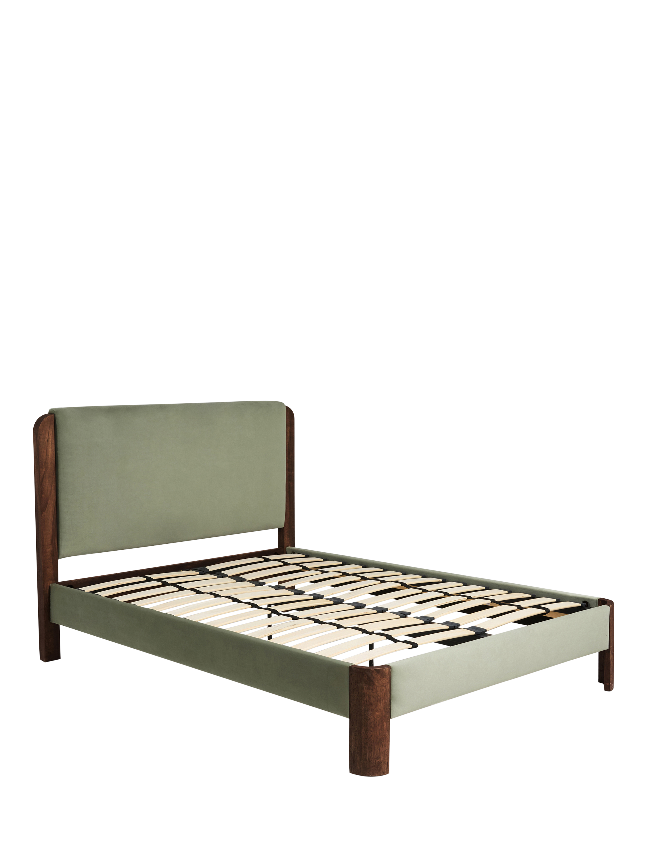 Elevate your bedroom with the Evander bed frame from MADE. Showcasing an elegant headboard, dark-stained wooden accents and soft, woven velvet upholstery. Evander's contemporary shape comes complete with supportive sprung slats in the base and modern, wooden legs.
