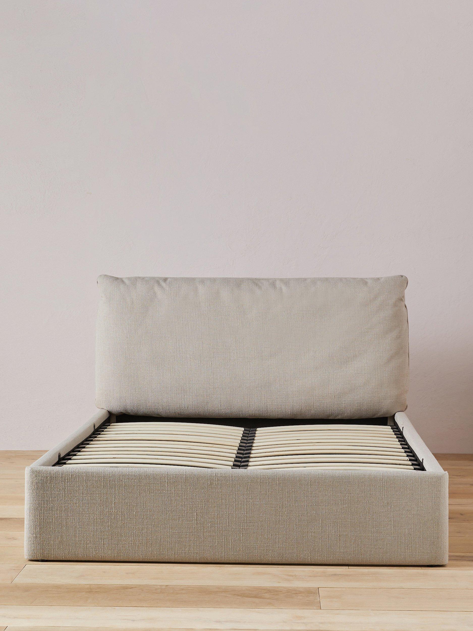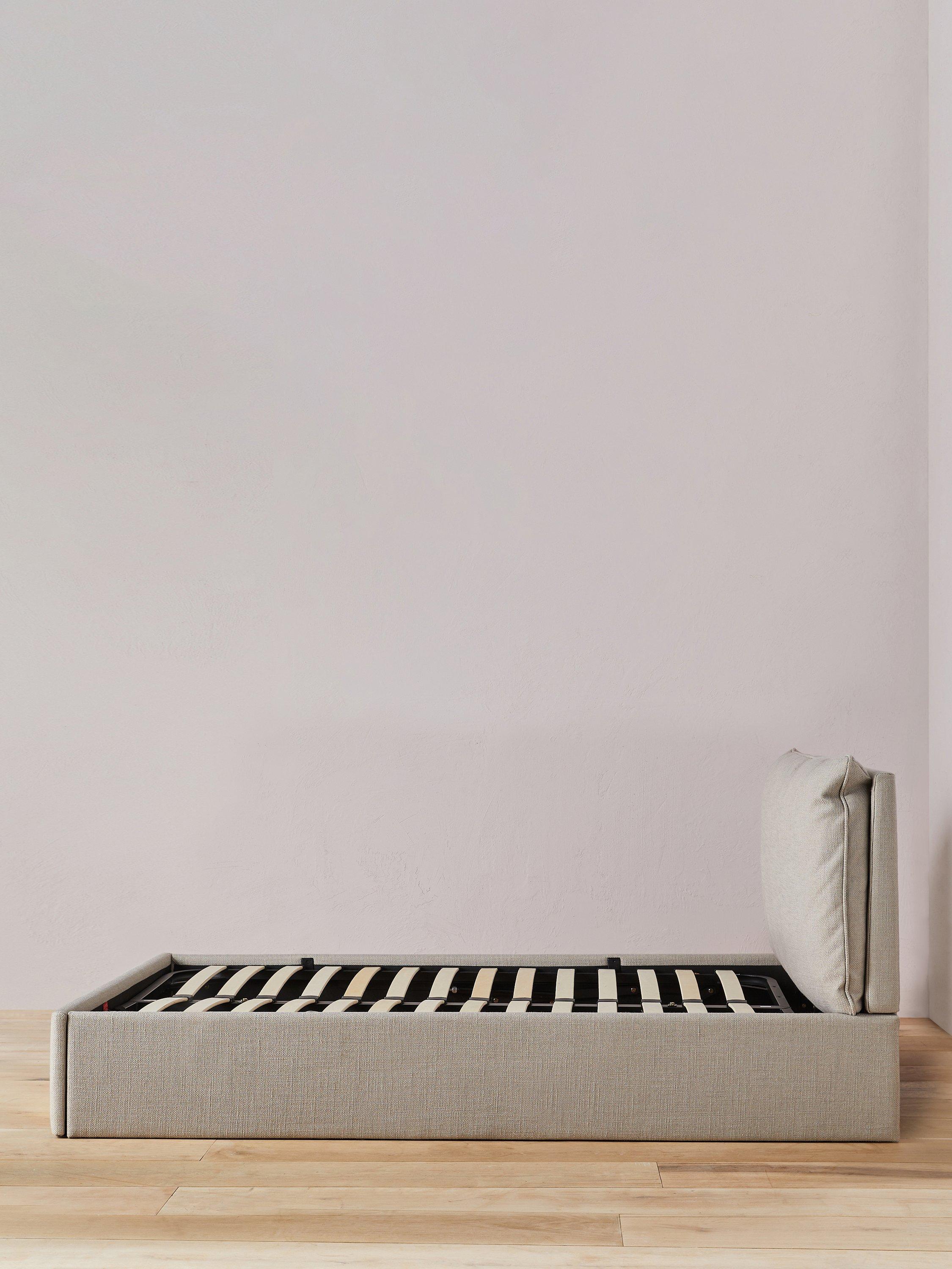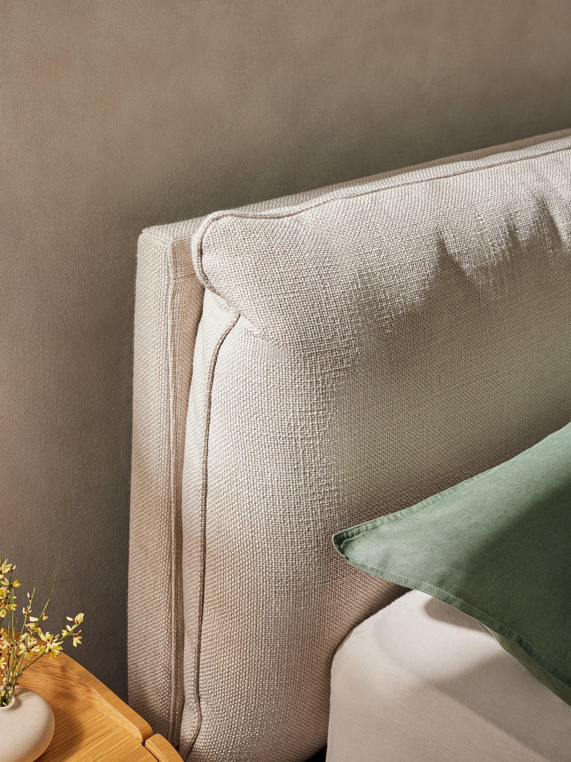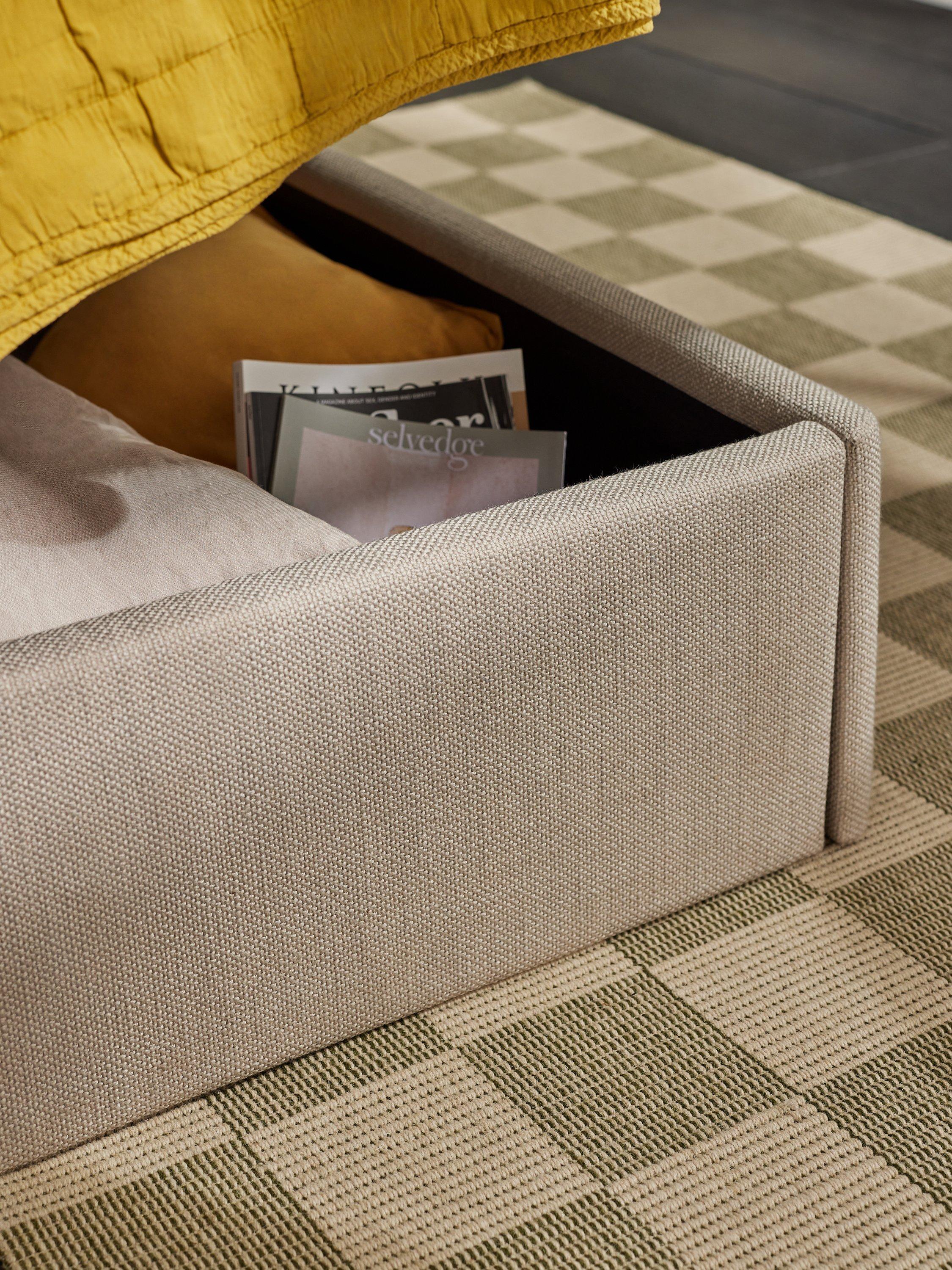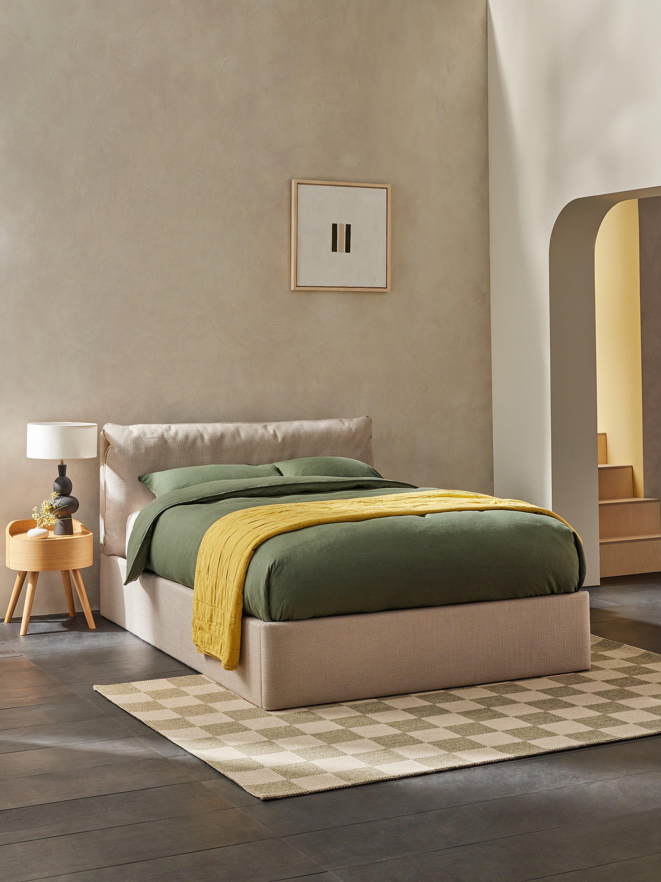 Created by MADE's in-house design team, this modern bed frame includes a spacious ottoman storage base, making it an ideal choice for smaller bedrooms. It's designed with a soft, pillowy-cushioned headboard and sprung slats which provide a supportive foundation for your mattress.